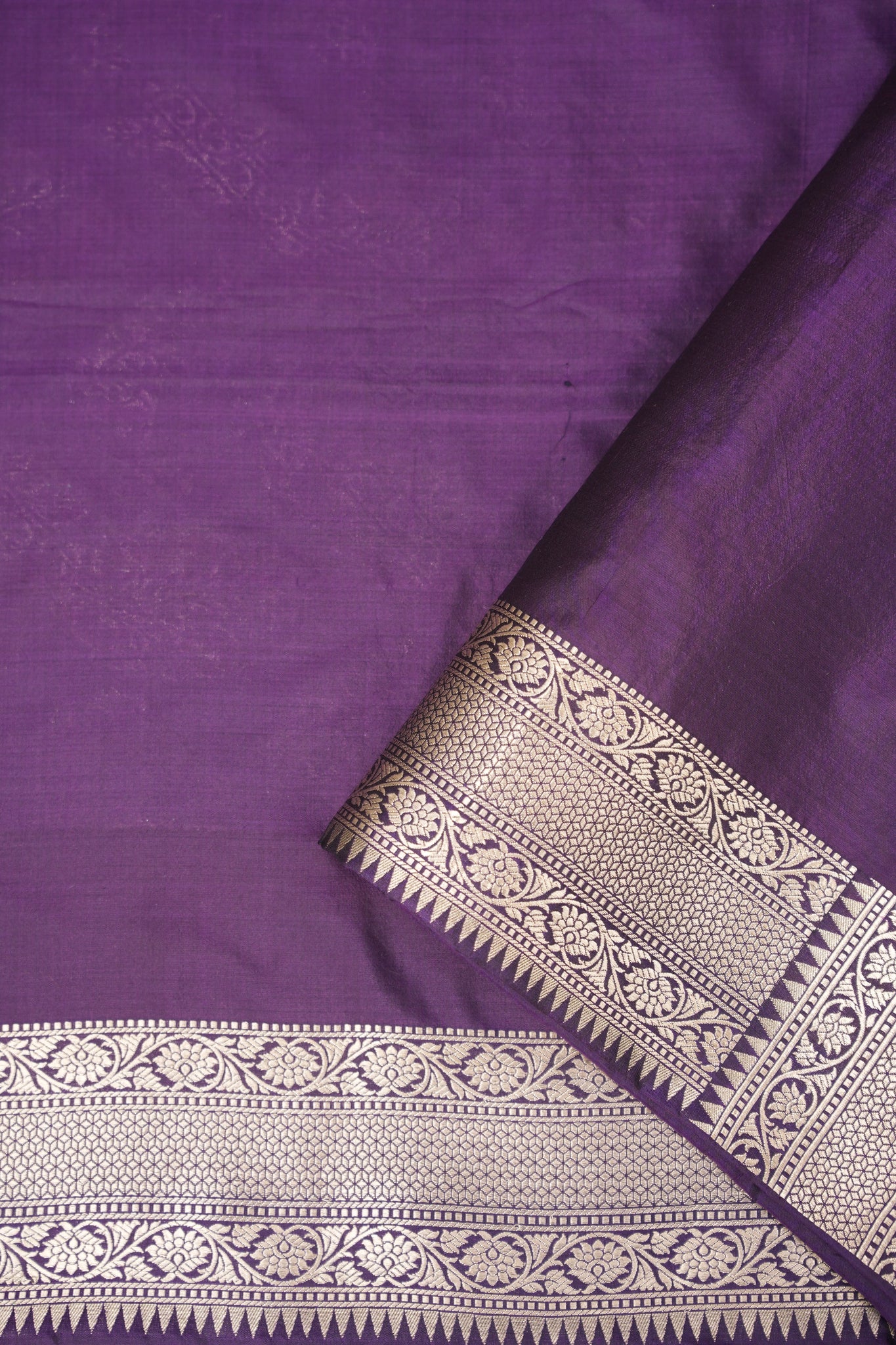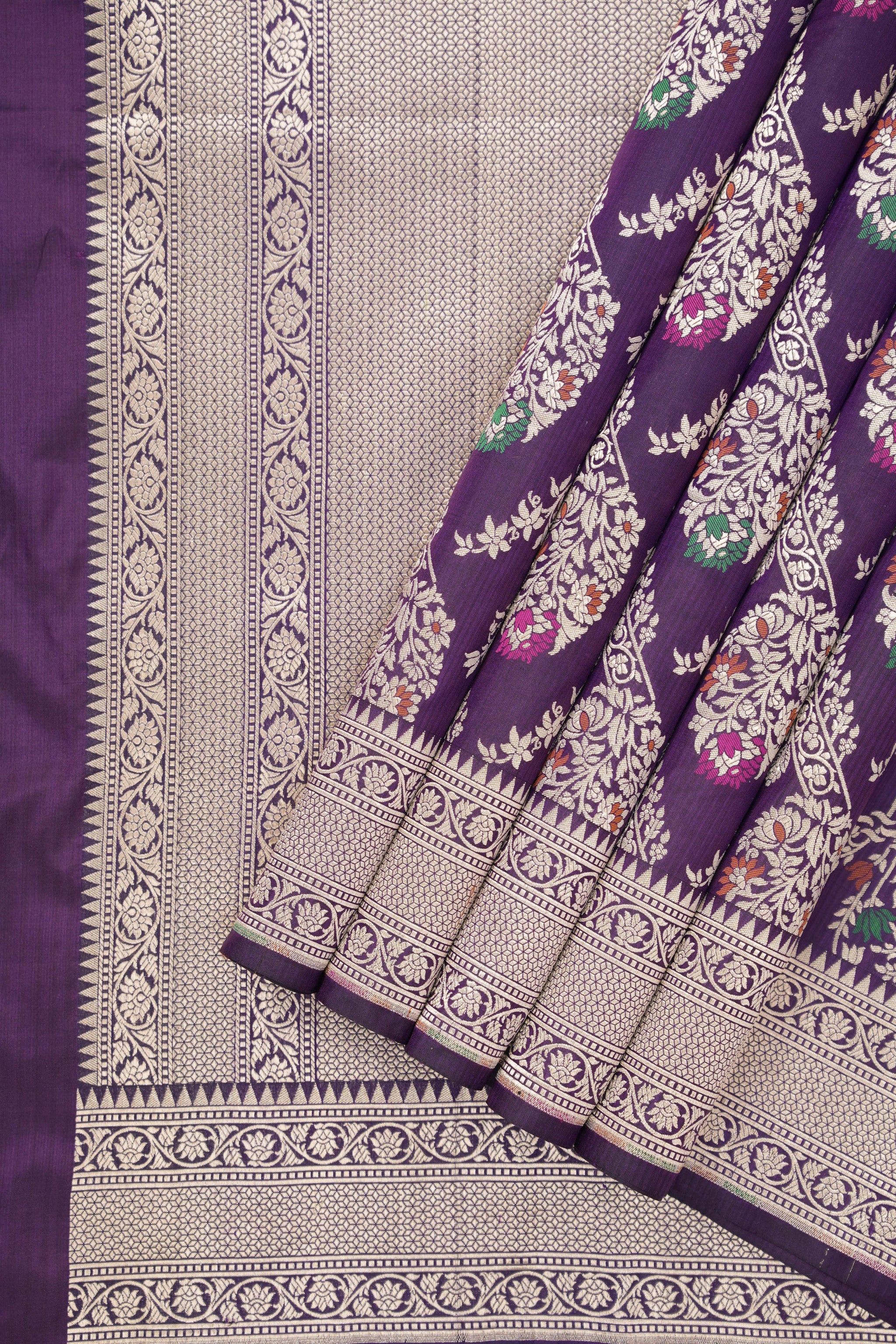 Saree Color – Purple base enriched with antique gold zari floral vines, offering a timeless Banarasi allure