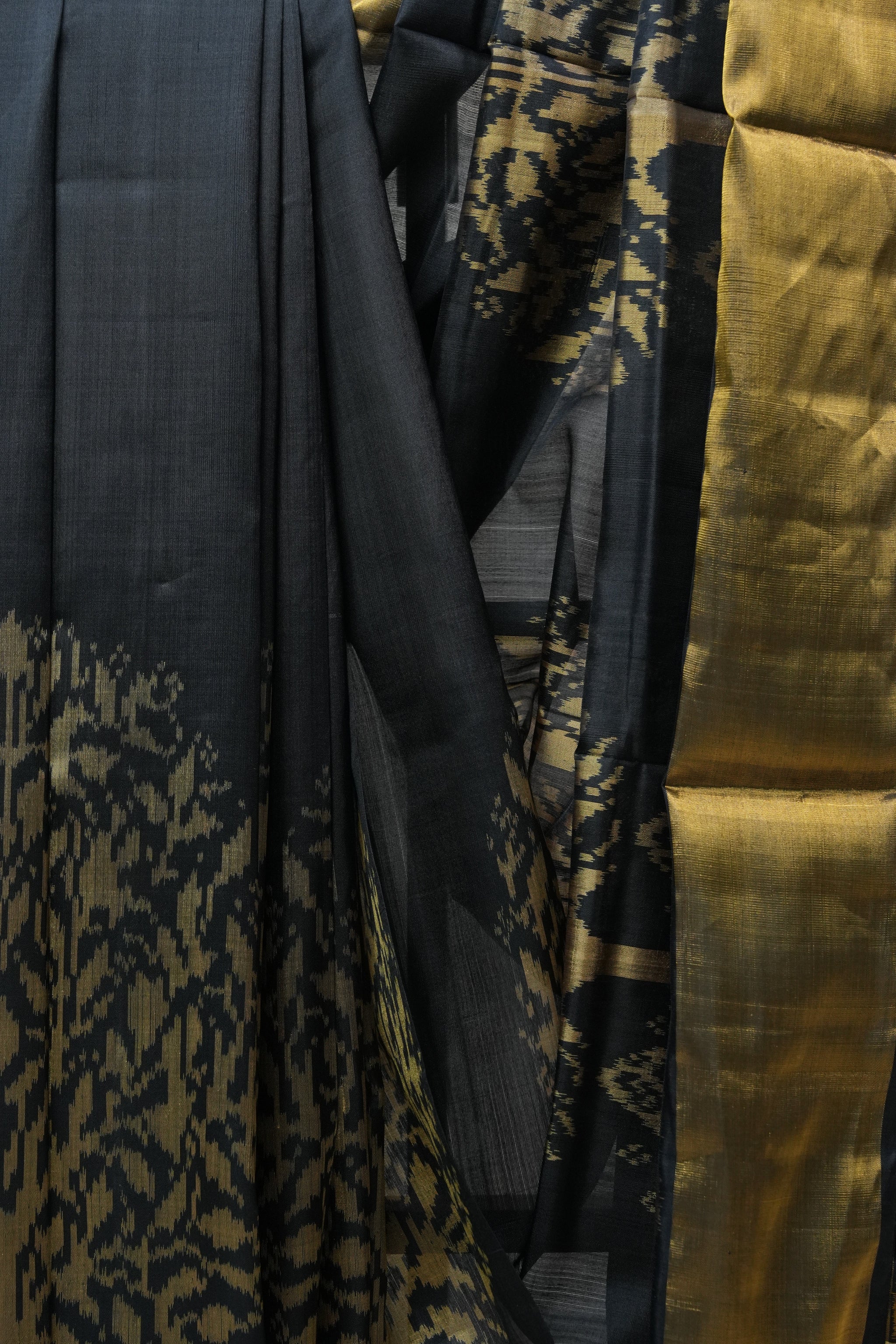 Work - A vibrant Rajkot Patola saree with bold black tones and intricately woven geometric borders, blending tradition with festive elegance.