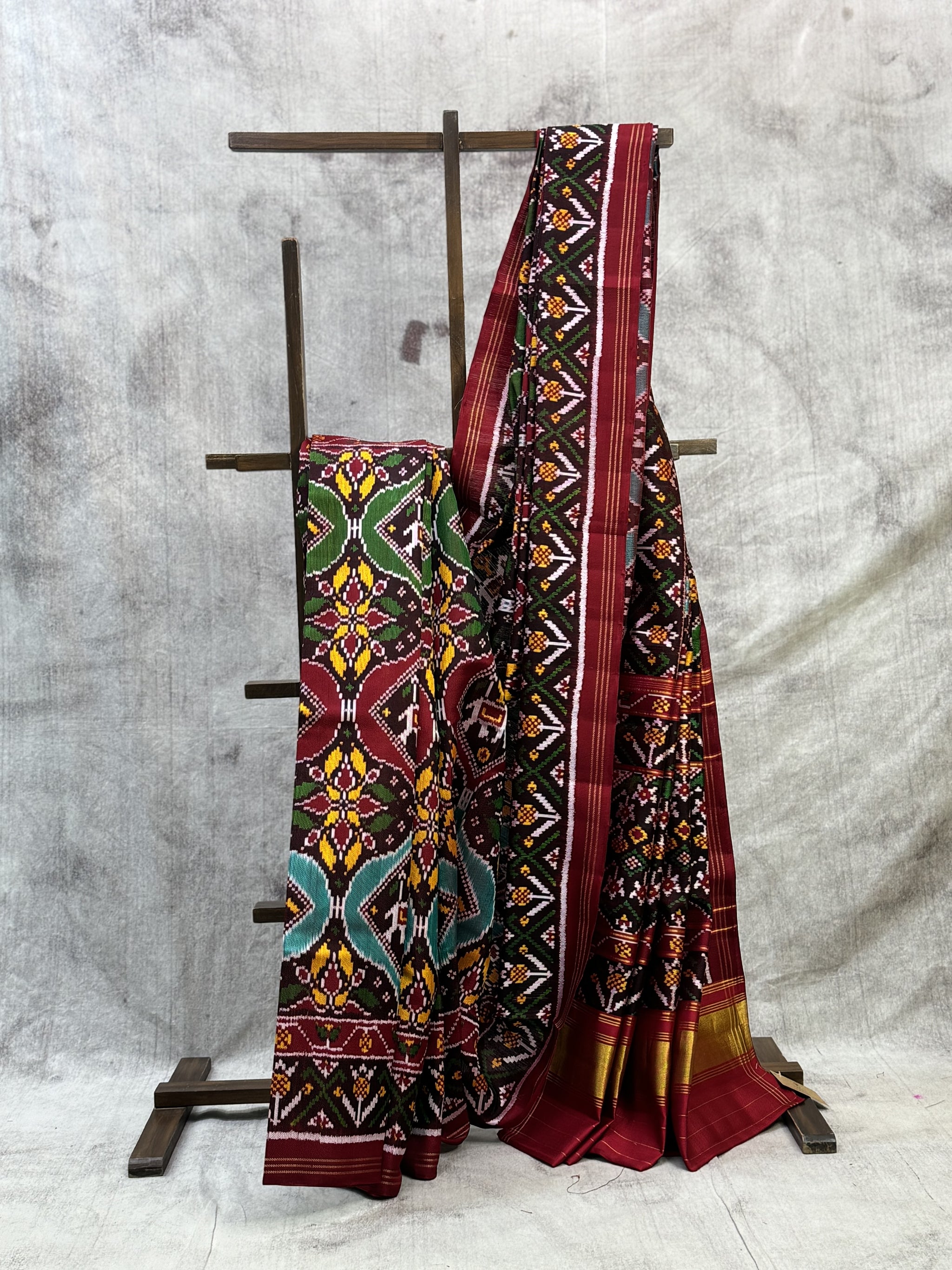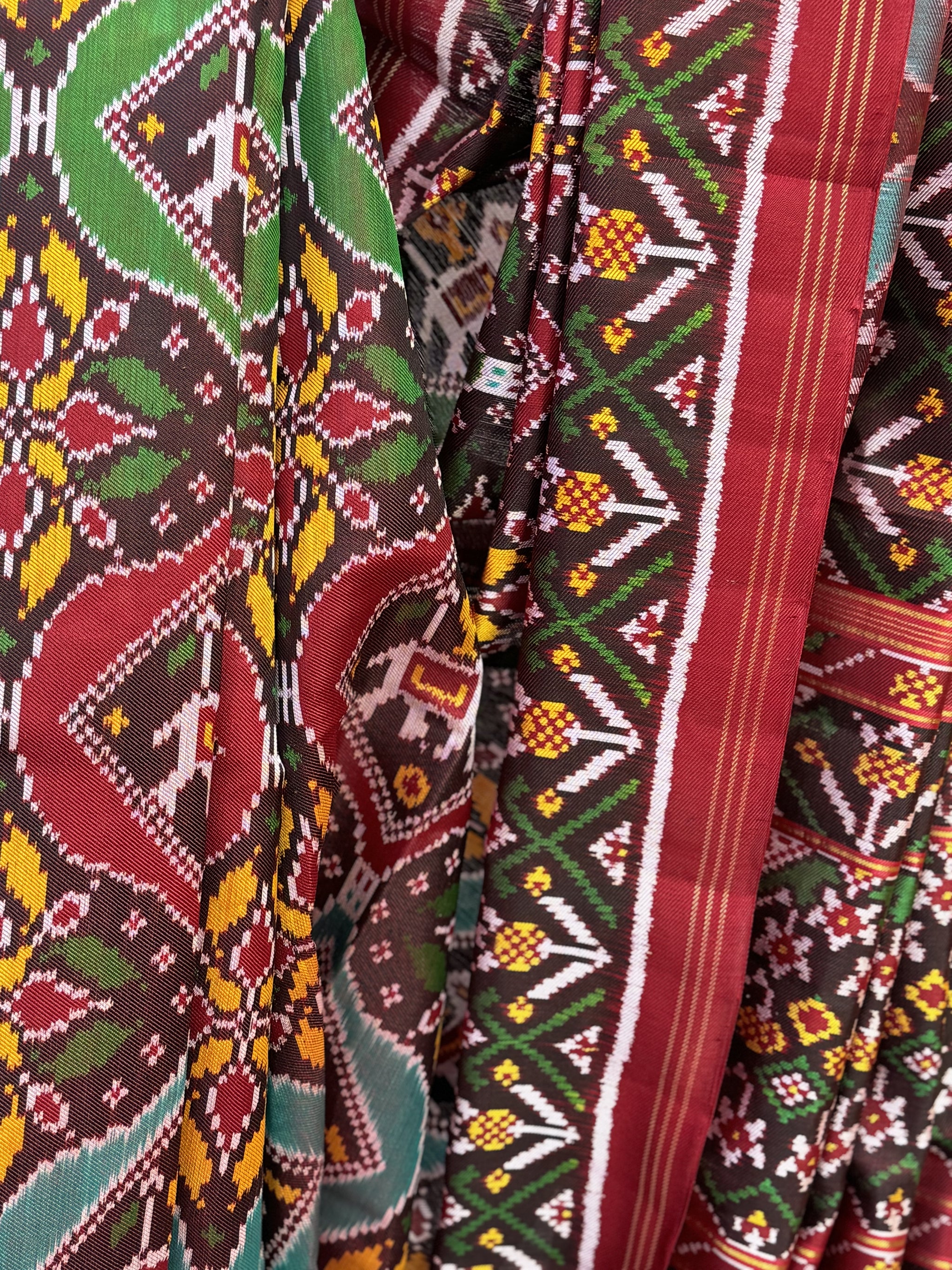 Handloom brown silk rajkot patola saree with golden ikat border. Beautiful pallu with intricate ikat weave and contras plain blouse piece. Beautiful double ikat weave all over the saree.