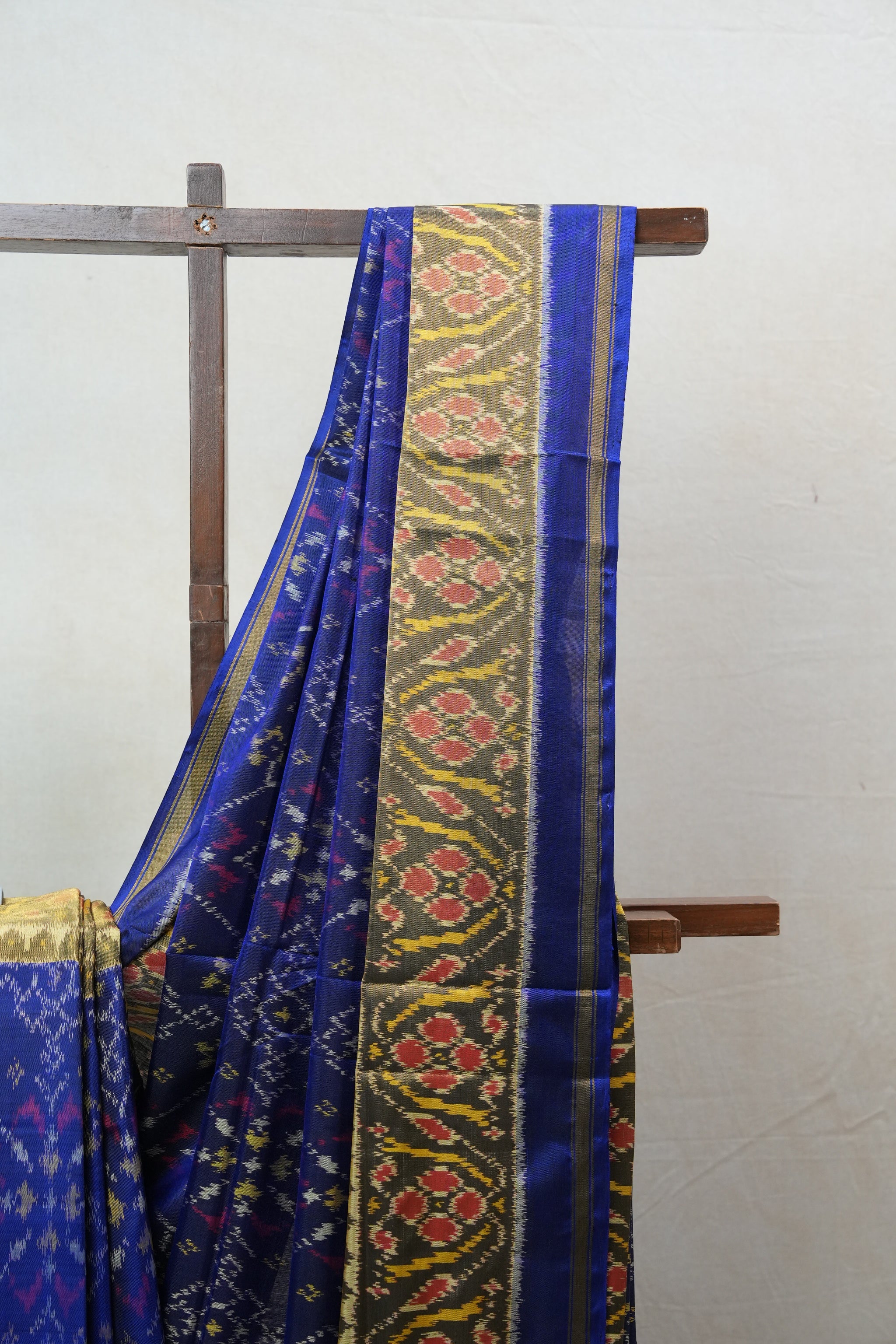 Work - A vibrant Rajkot Patola saree with bold blue tones and intricately woven geometric borders, blending tradition with festive elegance.