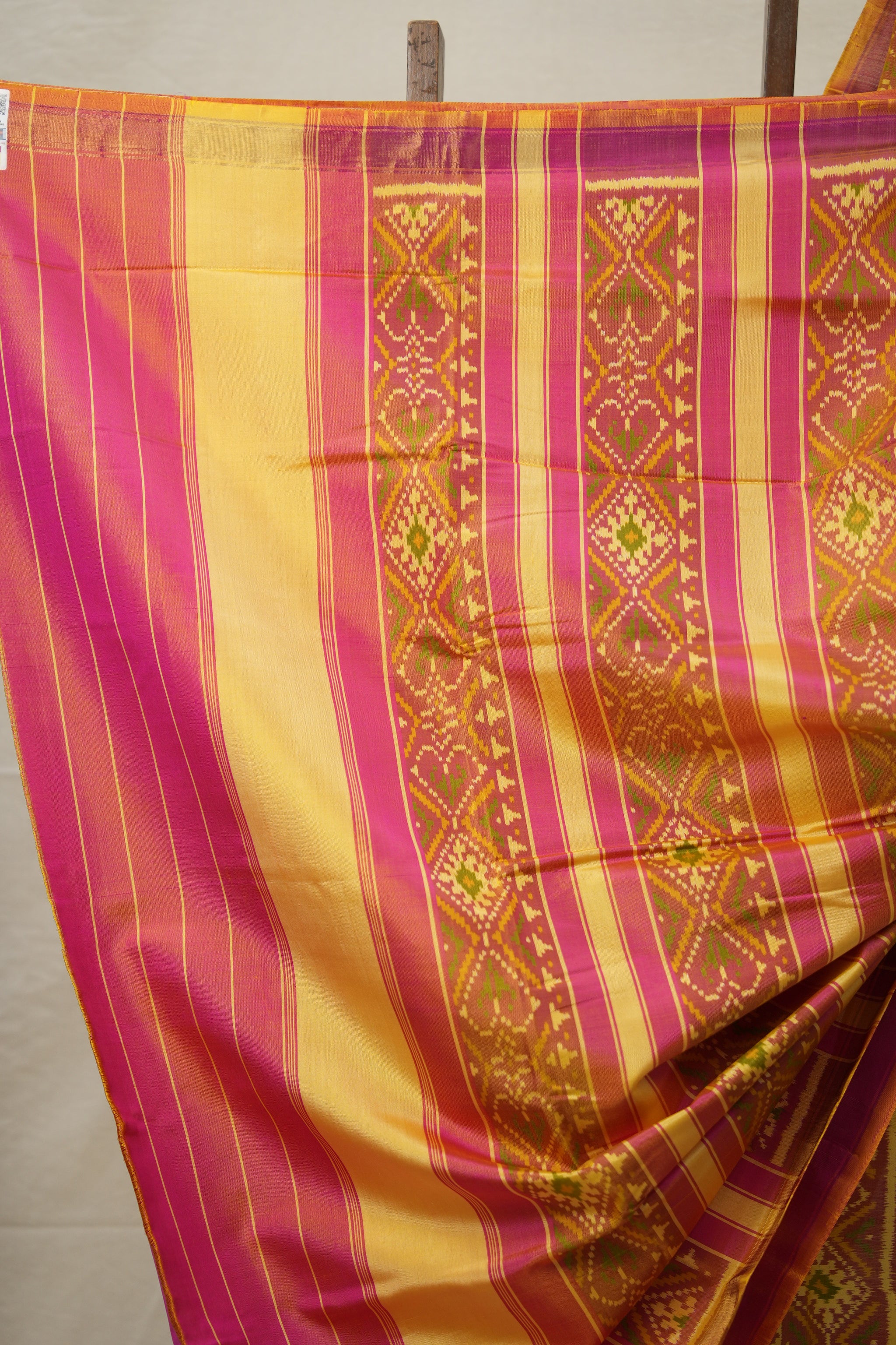 Work - A vibrant Rajkot Patola saree with bold pink and intricately woven geometric borders, blending tradition with festive elegance.