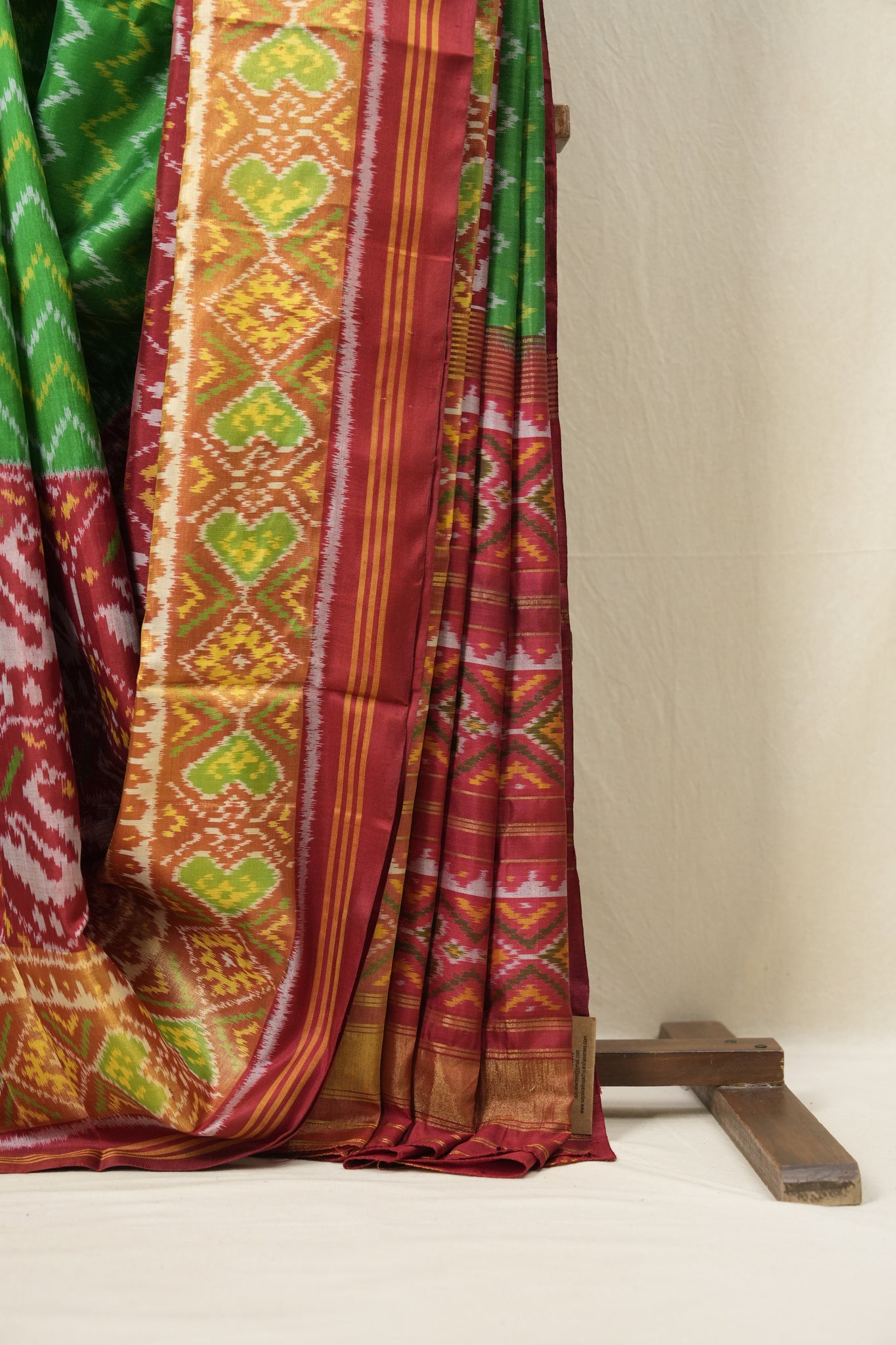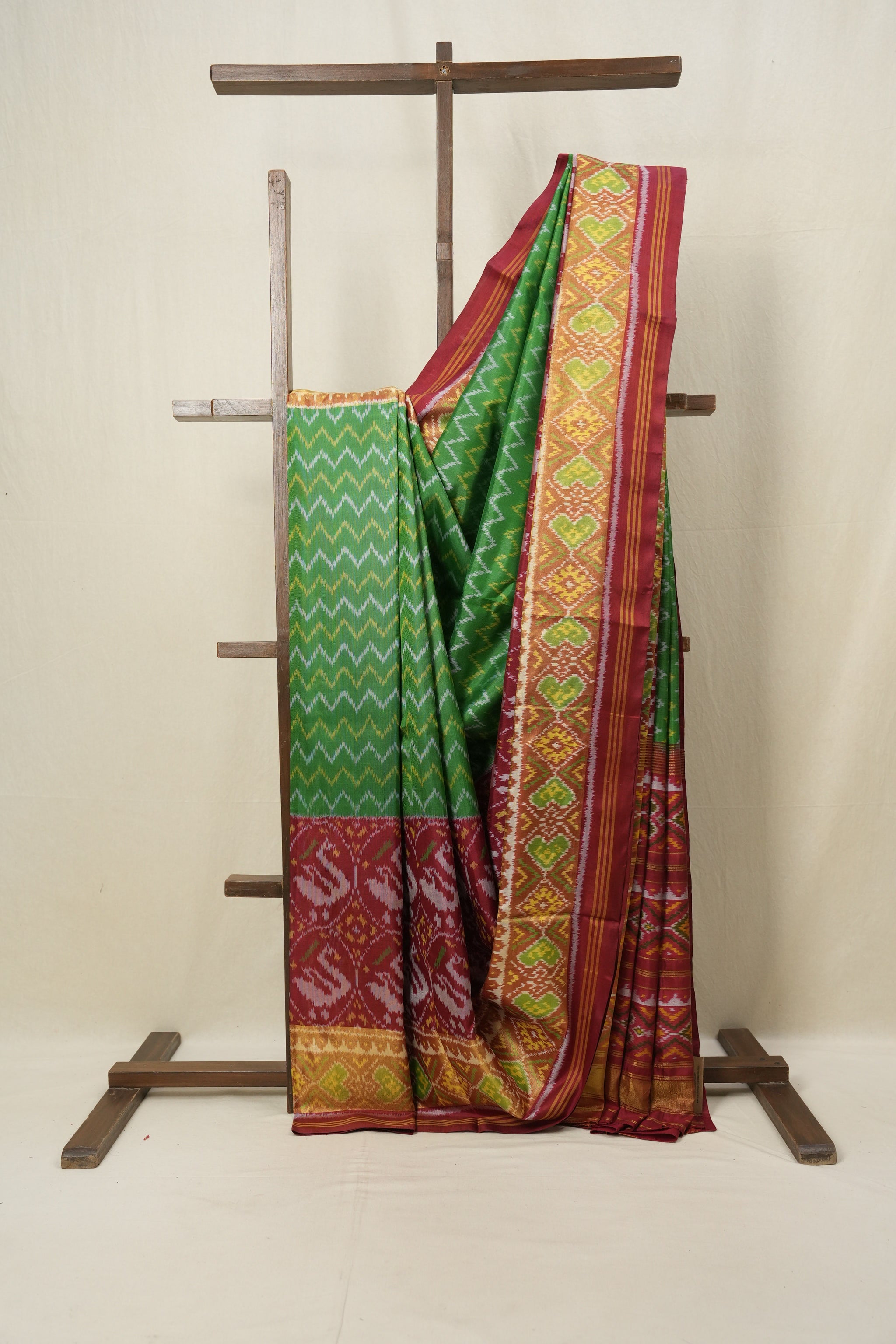 Work - Green rajkot patola silk saree with a deep red border, featuring a vibrant zigzag pattern on the body and traditional motifs along the border and pallu.
