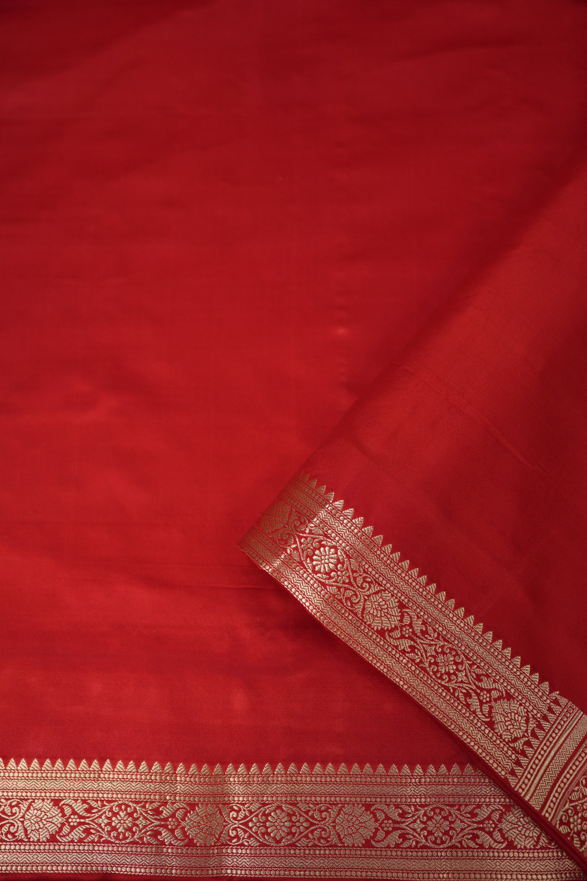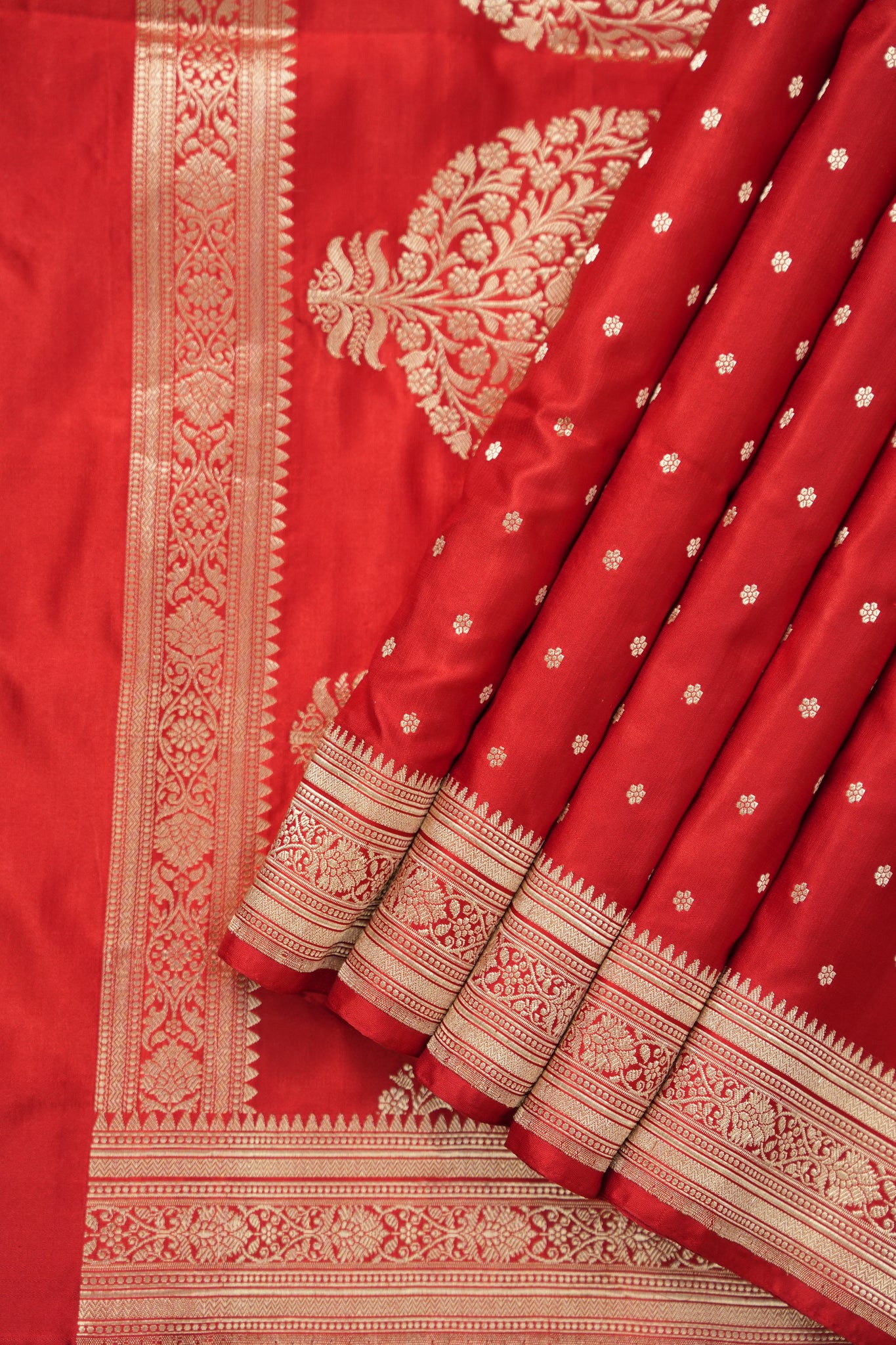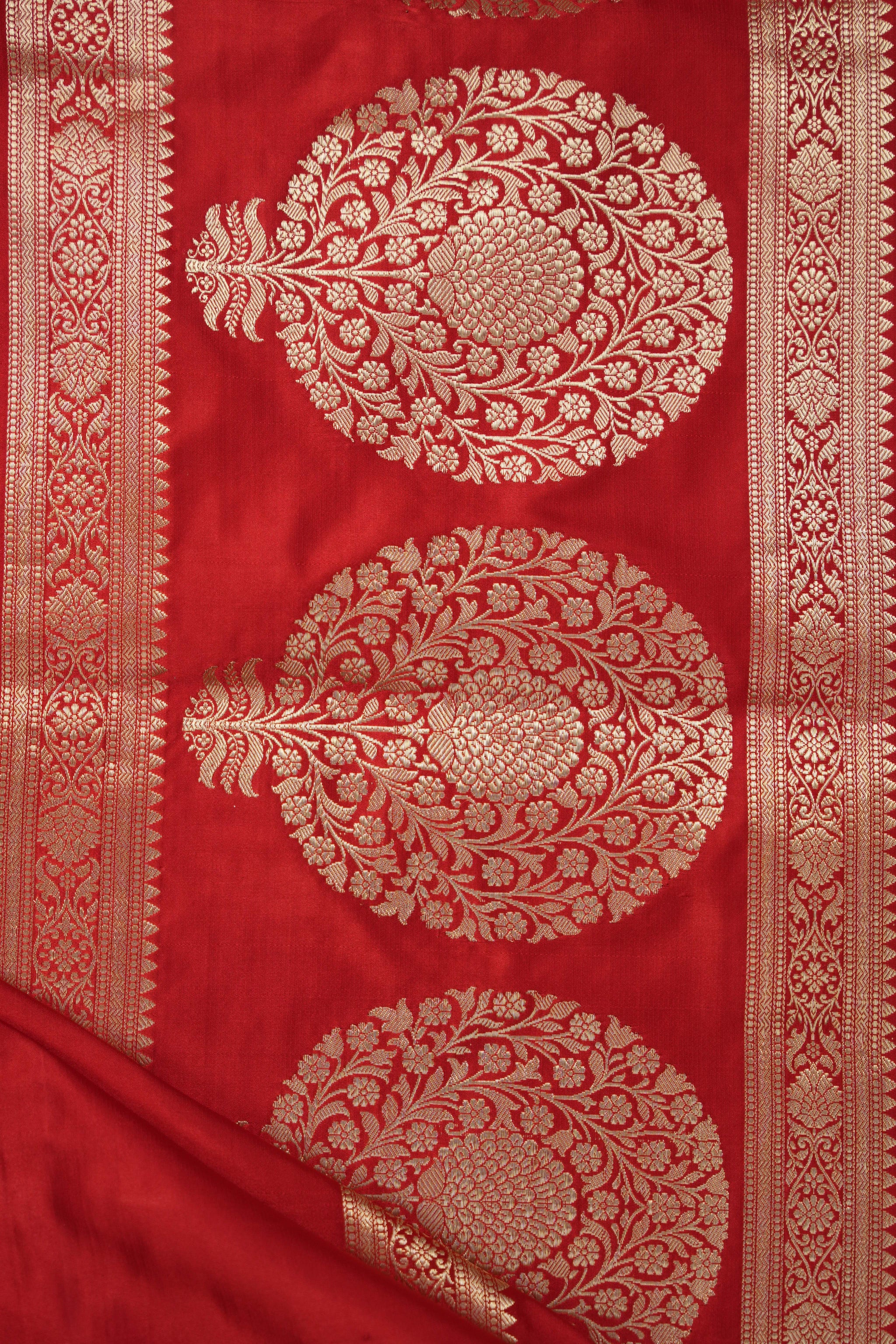 Saree Color – Rich red base adorned with antique gold zari floral motifs, radiating timeless Banarasi elegance