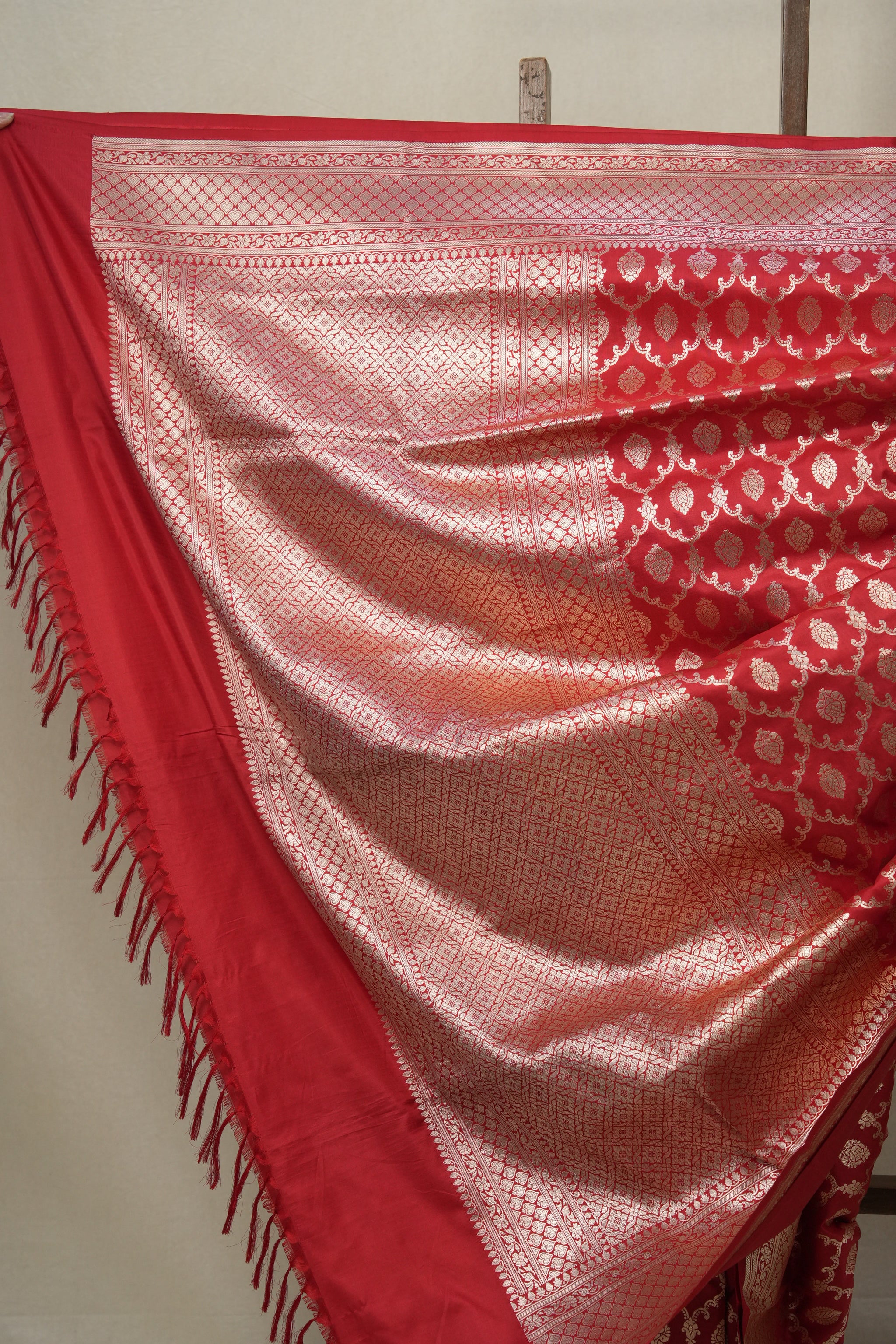 Work - Features a gold zari floral and geometric motifs intricately woven across the red silk body, complemented by a rich gold zari border featuring elaborate floral and paisley patterns and a matching pallu with similar intricate zari designs.