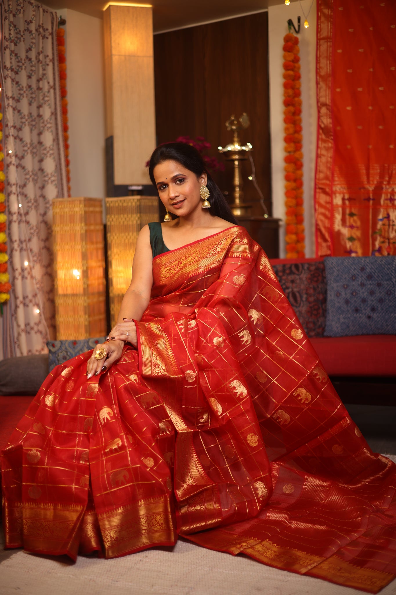 Work - The vibrant red Chanderi silk saree features a gold zari check pattern with elephant motifs on the body and a rich gold zari border and pallu with intricate traditional designs.
