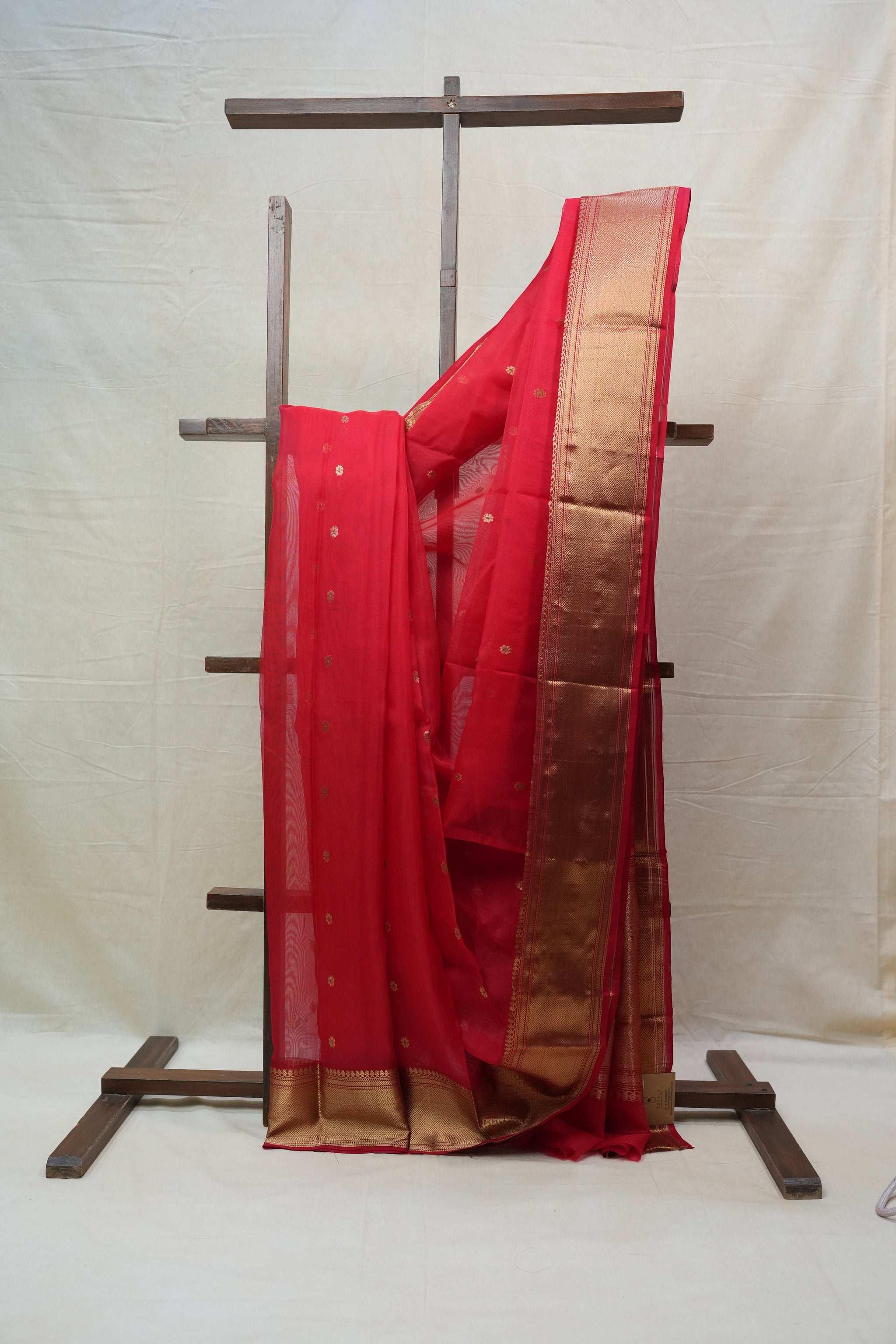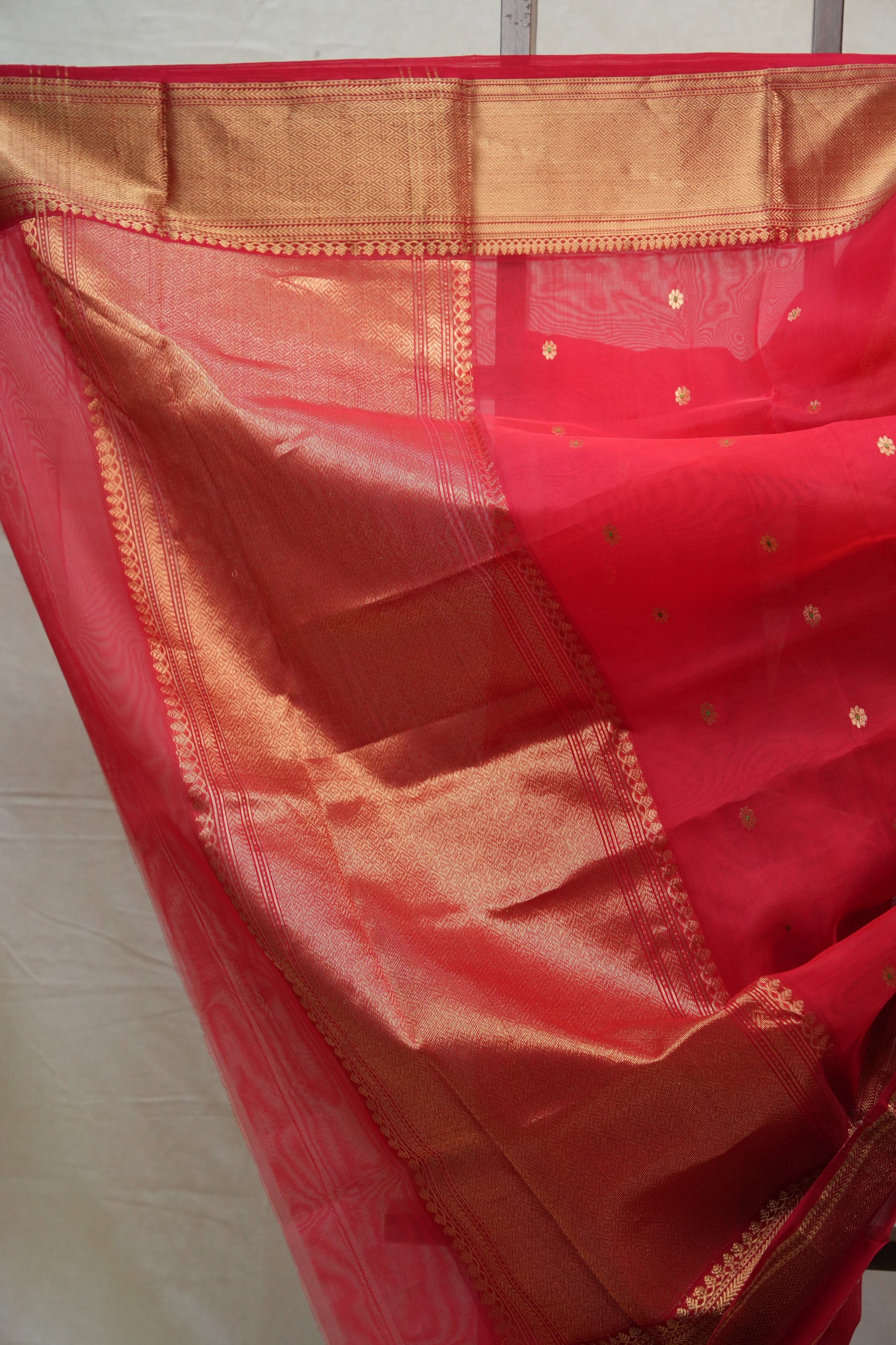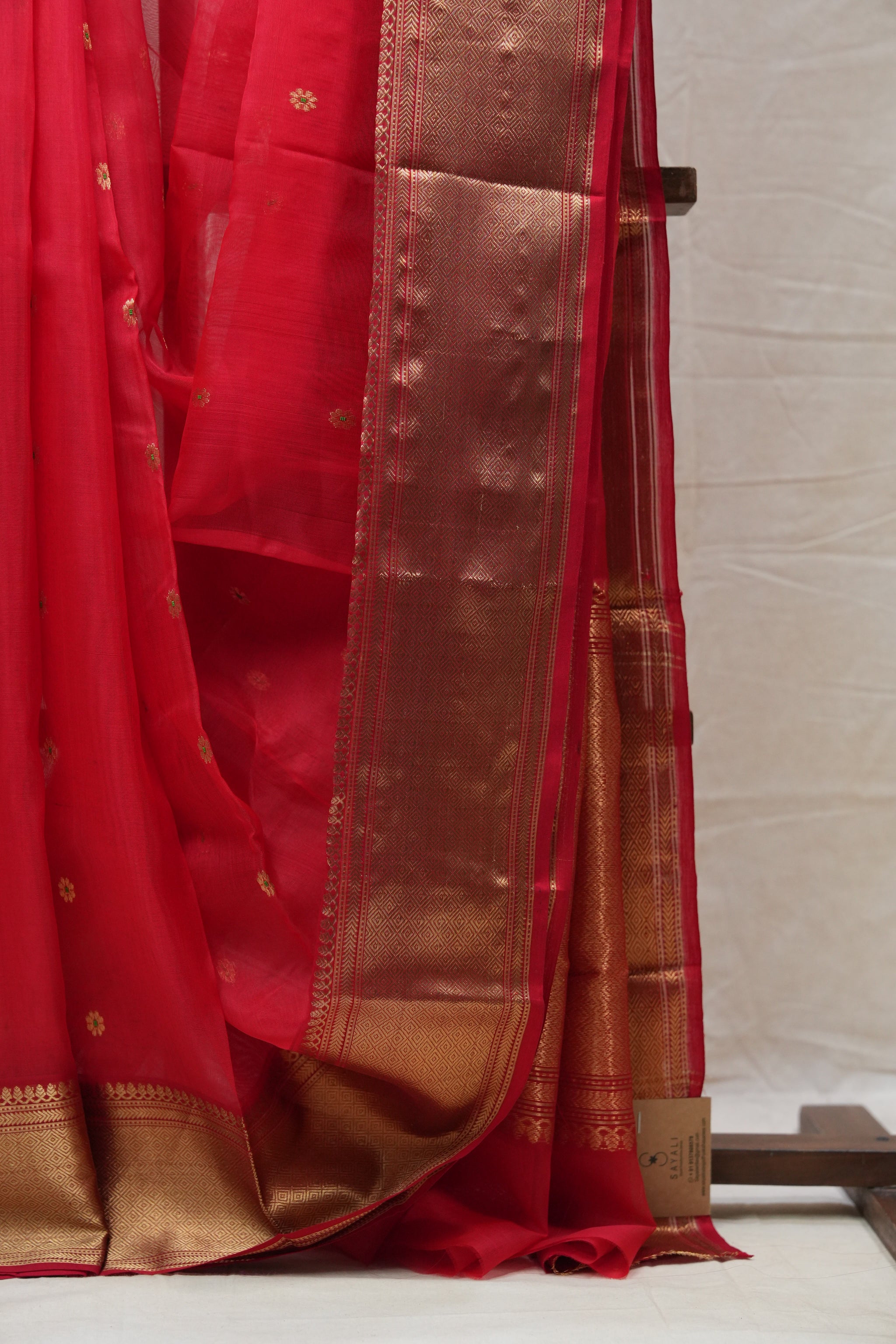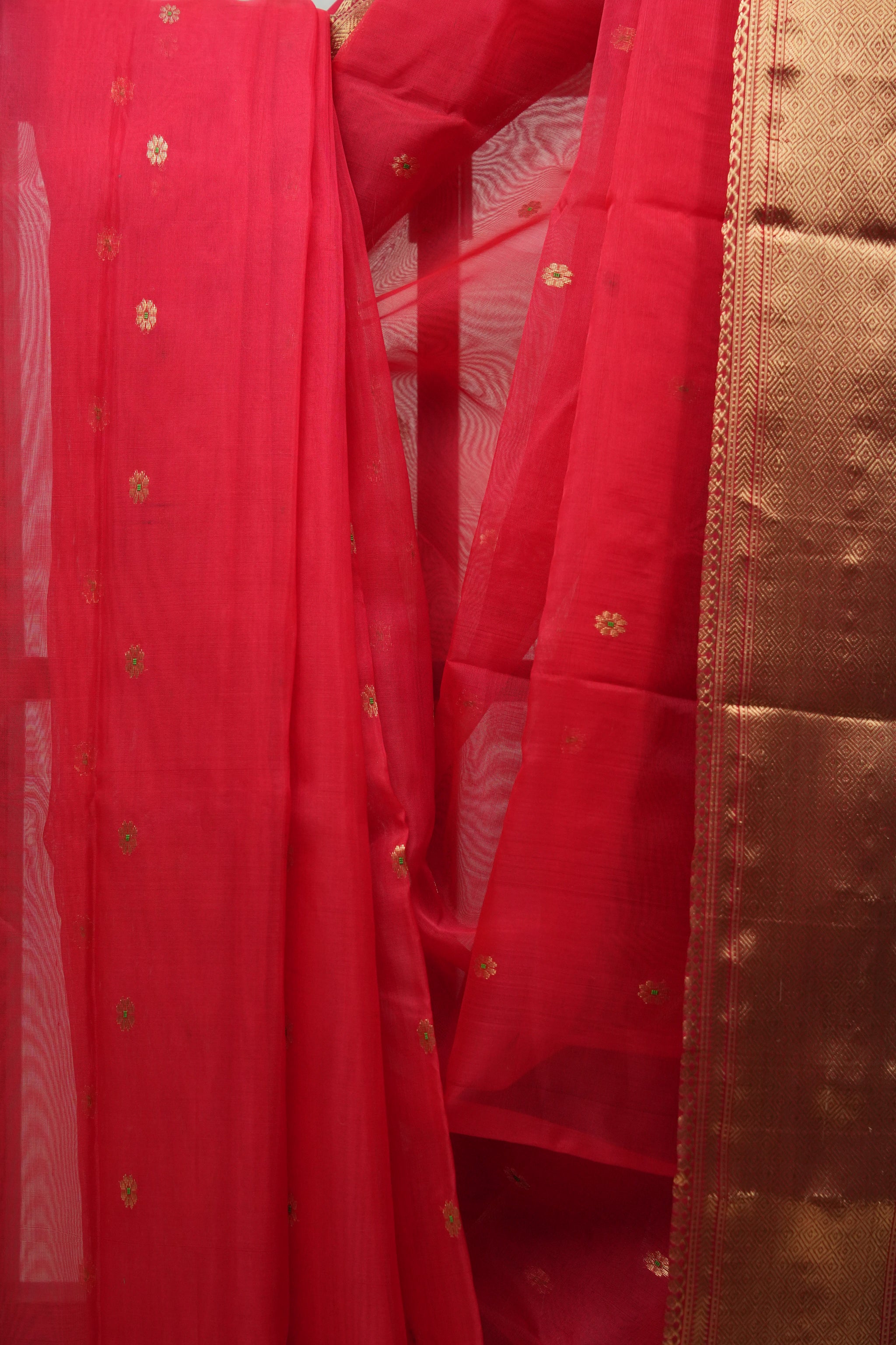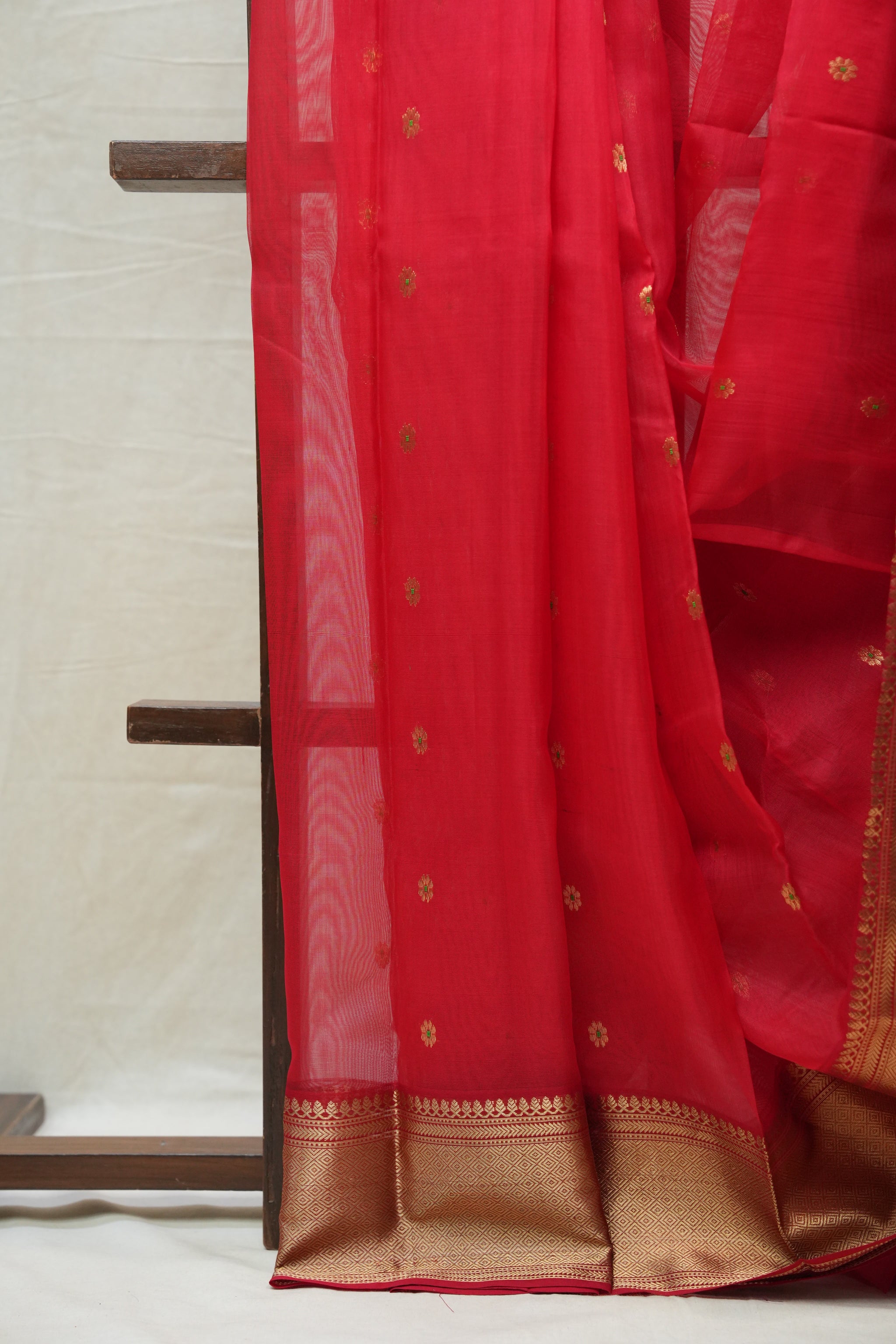 Work - Chanderi silk saree with red body, gold buti motifs, and elegant zari border.