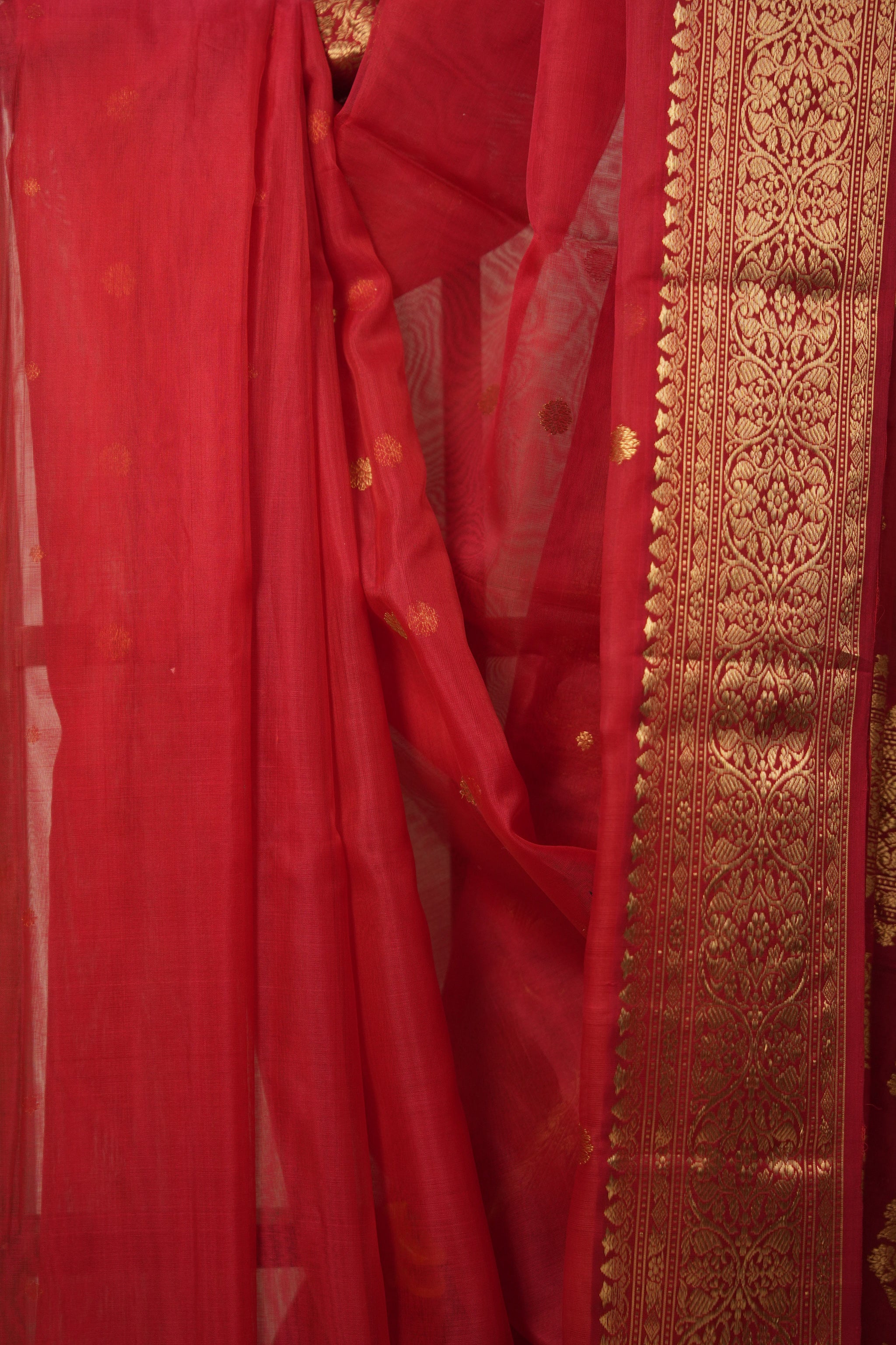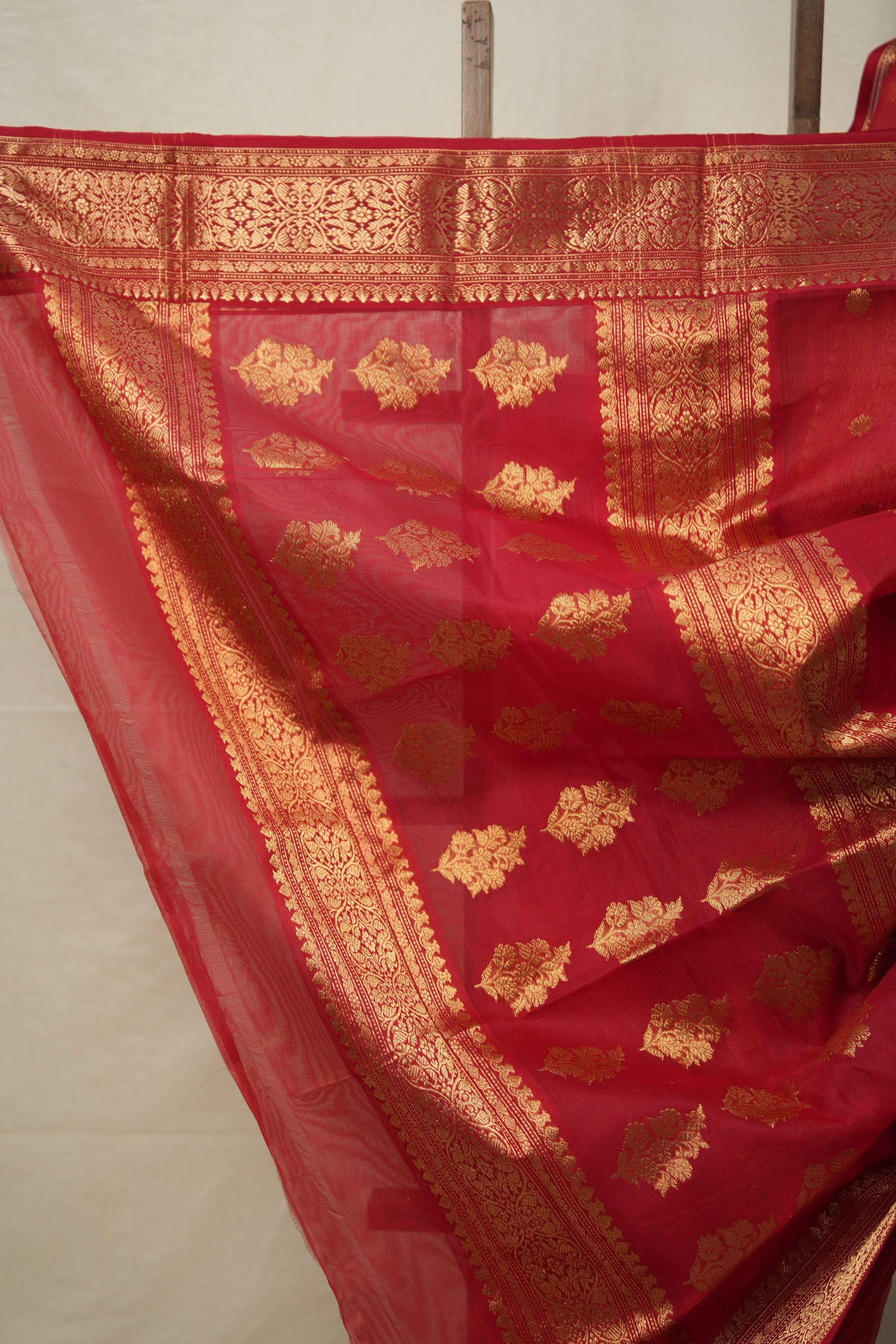 Work - Chanderi silk saree with red body, gold buti motifs, and elegant gold zari with floral design border.
