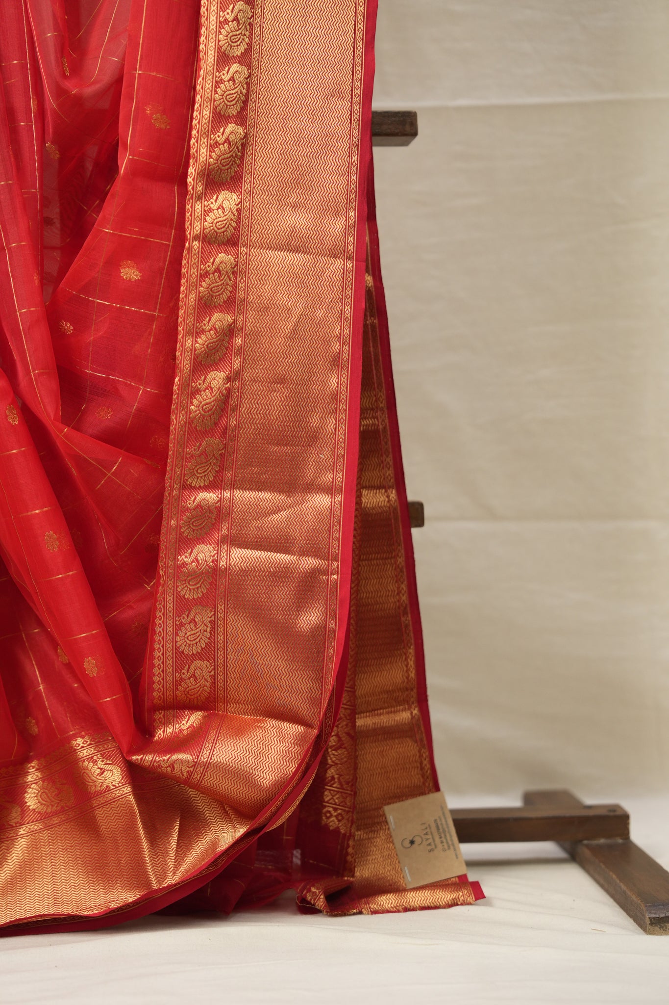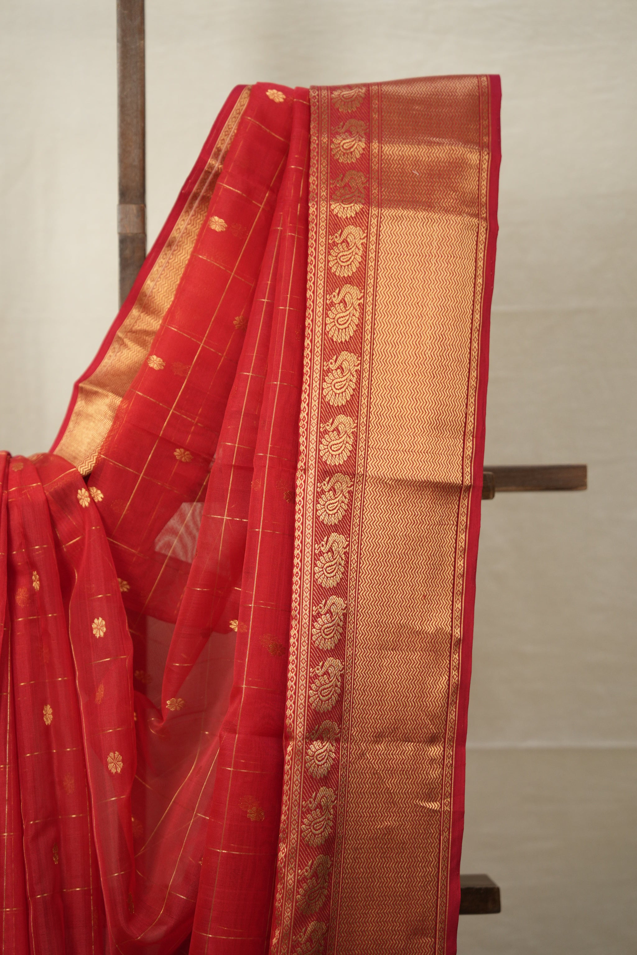 Work - Chanderi silk saree with red body, gold buti checks pattern, and elegant gold zari with motifs border.