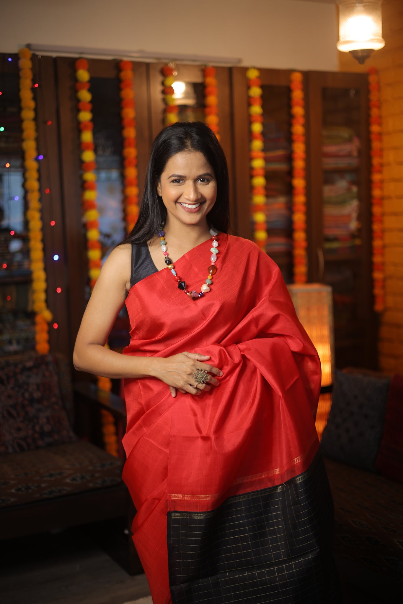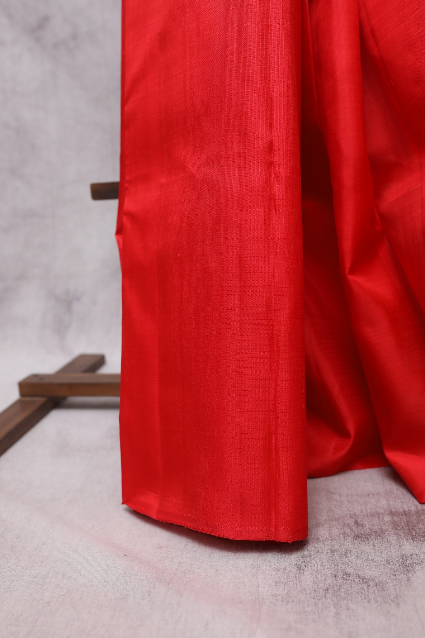 Handloom red pure kanjeevaram silk saree has a plain body without a border. It has a contrast pallu and a blouse piece with border.