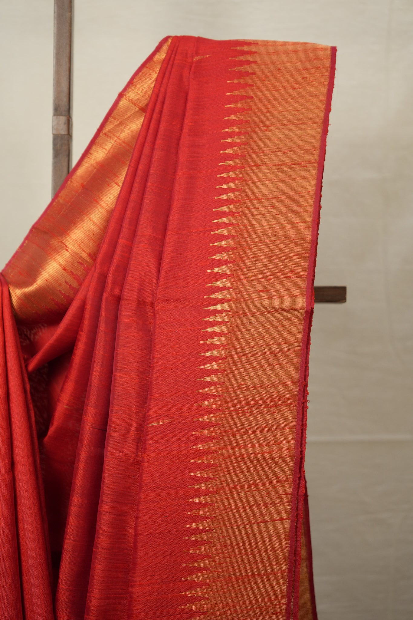 Work - This raw silk saree features a red base with plain body and gold temple border, showcasing a rich and elegant look.