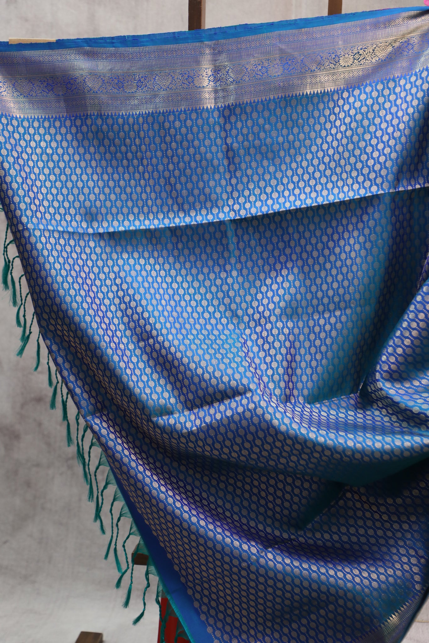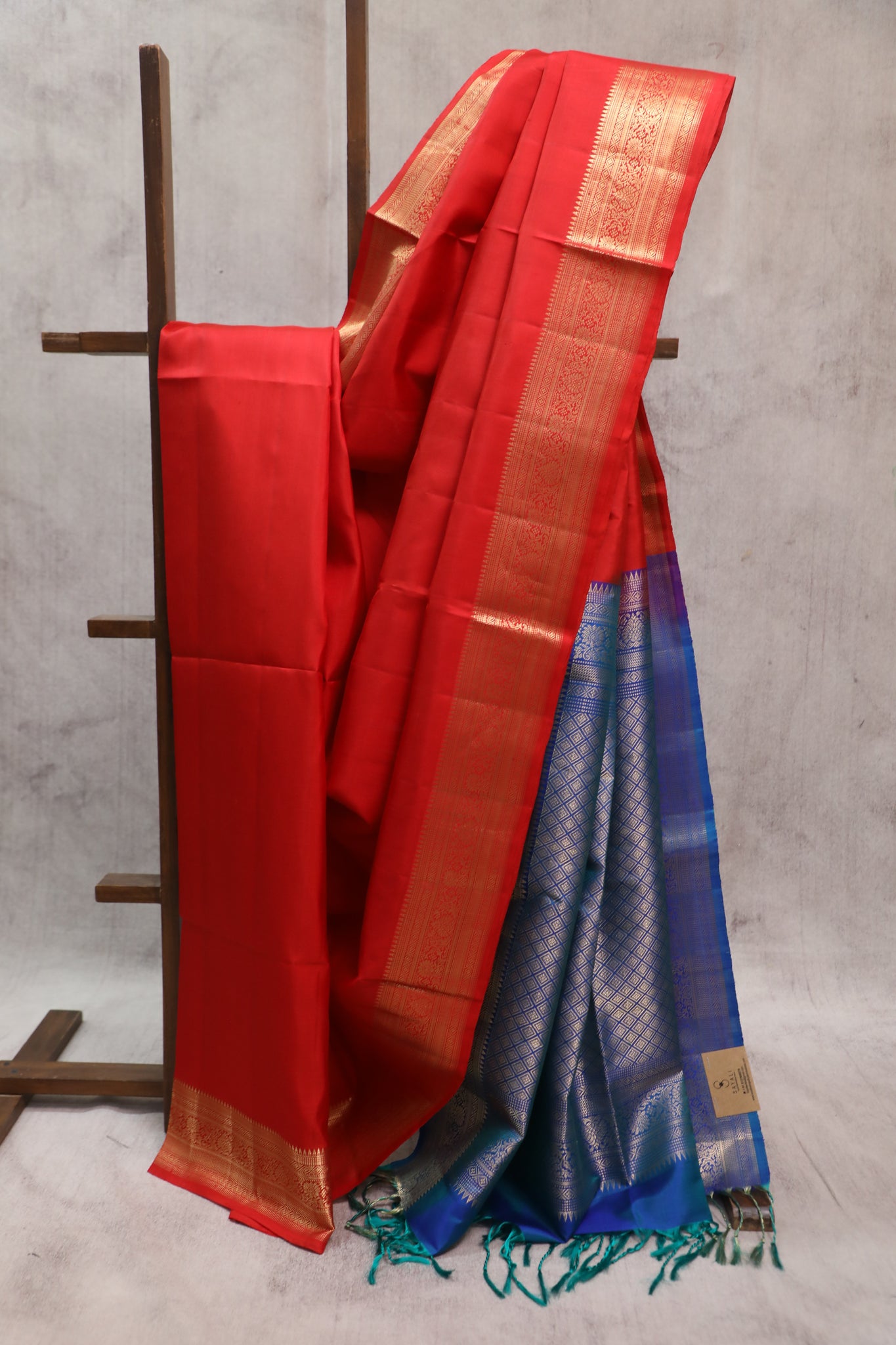 Work - Soft silk saree with a rich red body, golden zari border, and contrasting blue pallu adorned with silver zari diamond motifs.