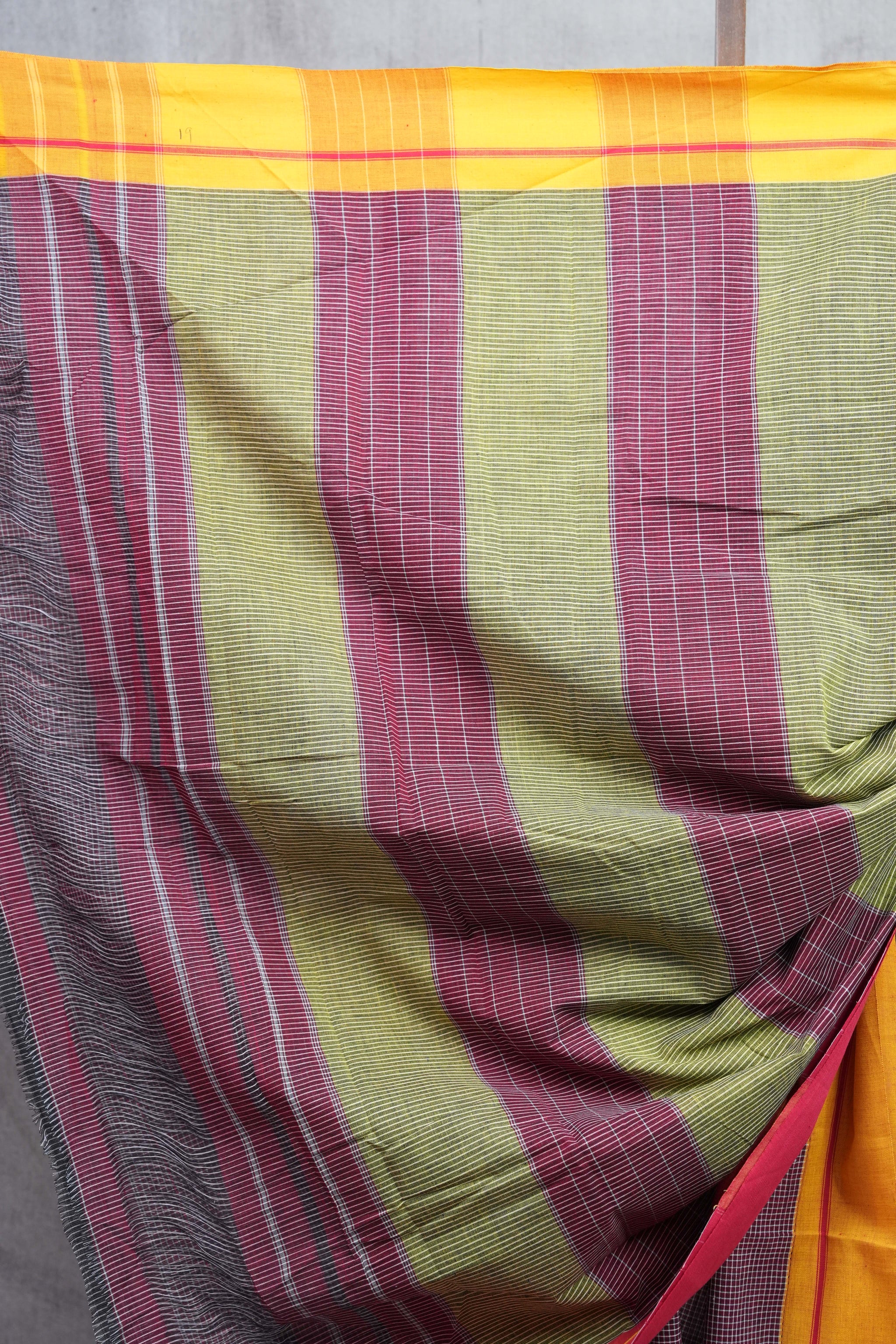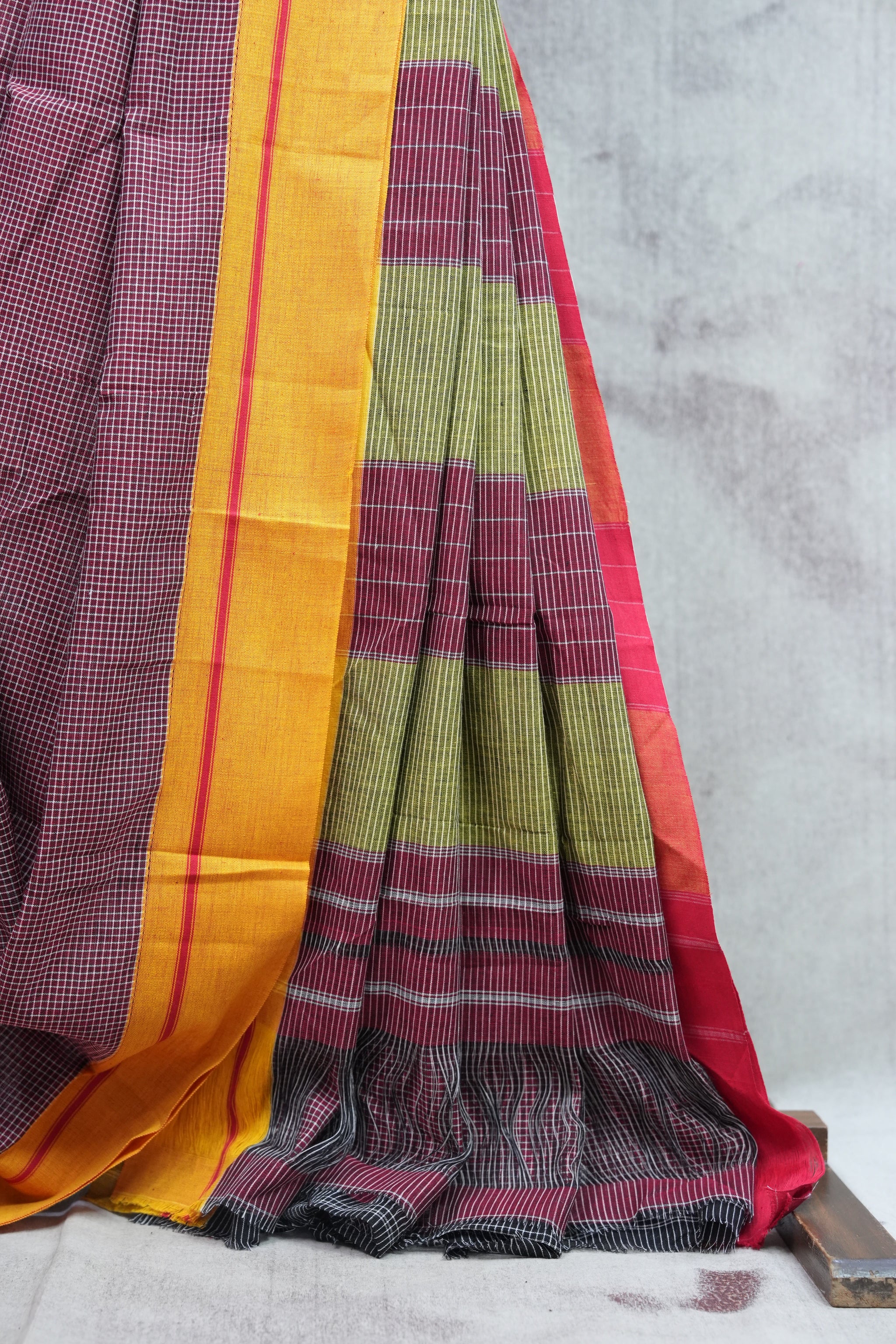 Work - The patteda anchu saree features a maroon body with small checks, a vibrant yellow border, and a pallu with prominent olive green and maroon stripes.