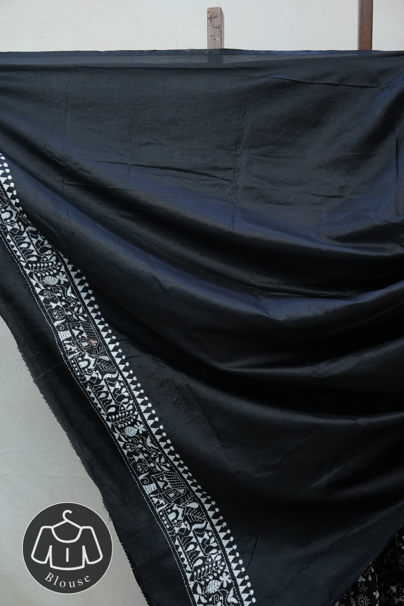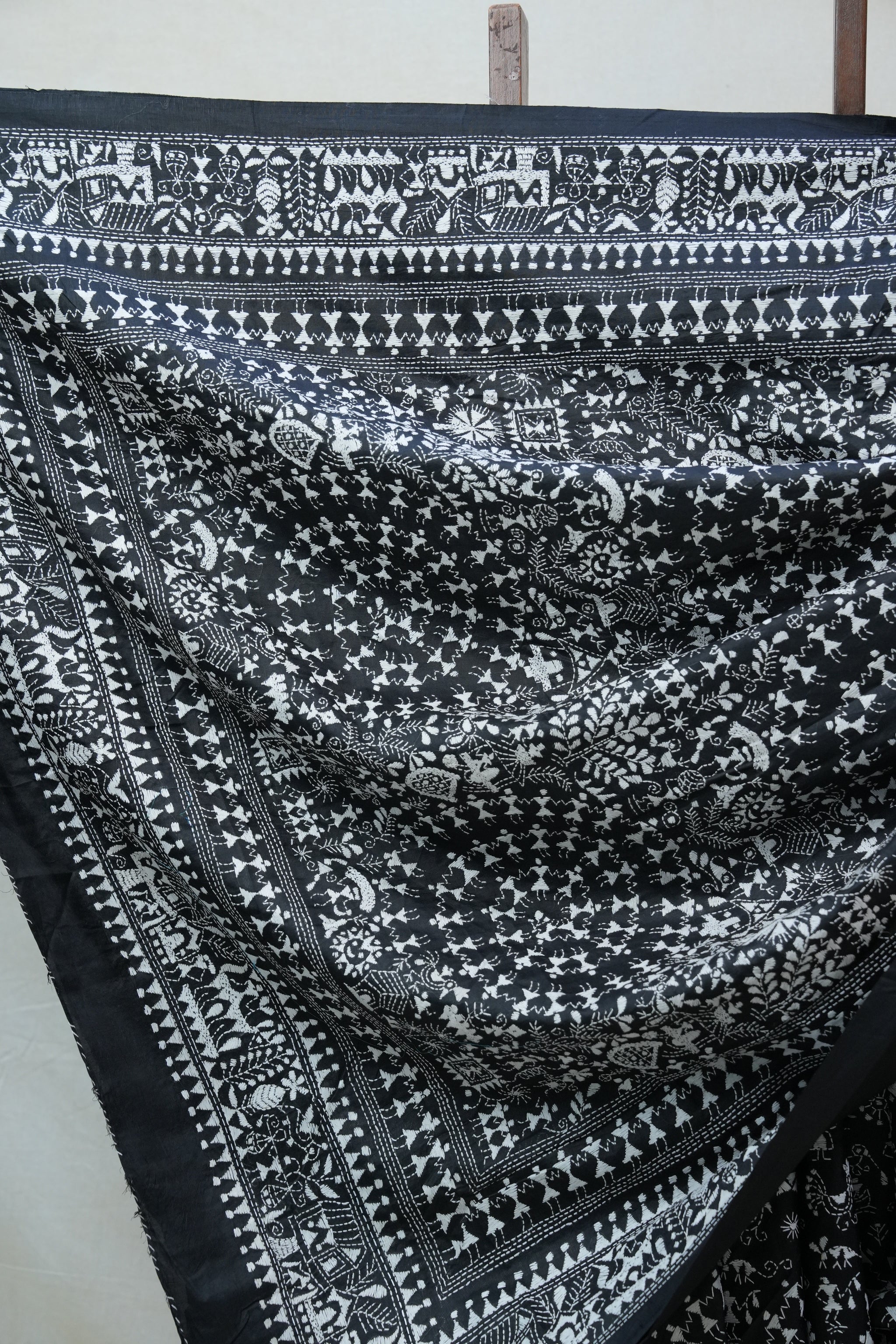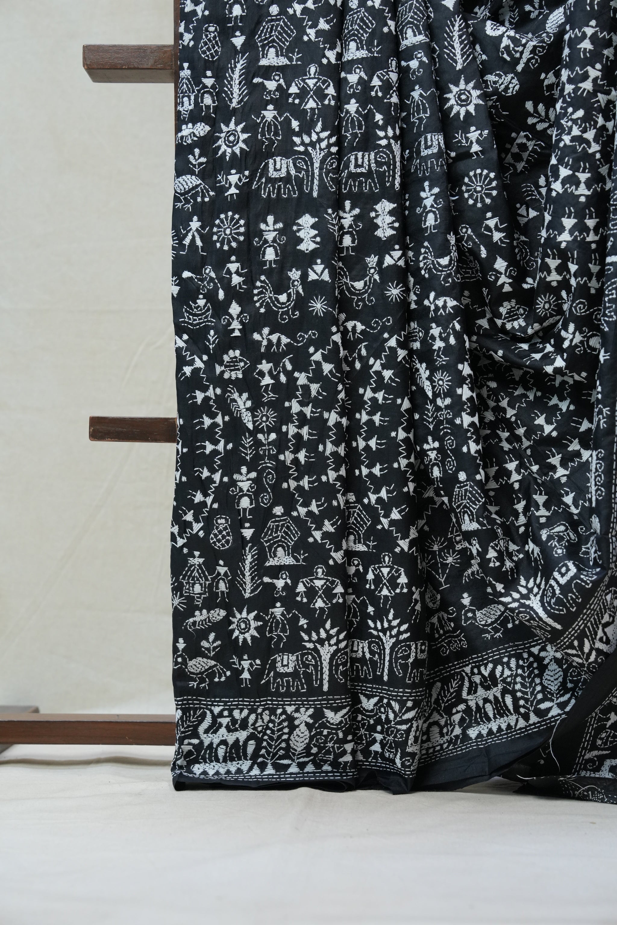 Work - This kantha tussar saree features intricate hand-embroidered kantha work with vibrant floral and paisley motifs.