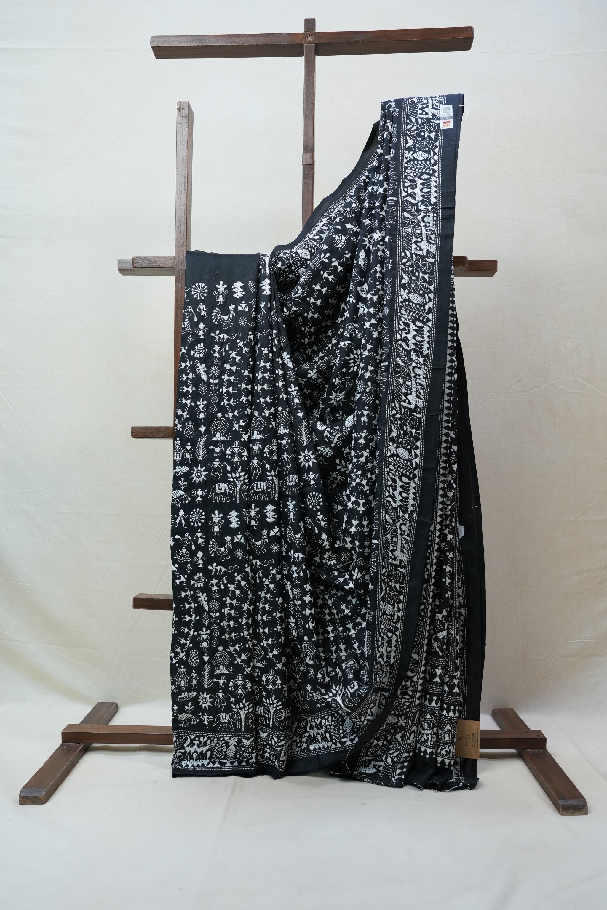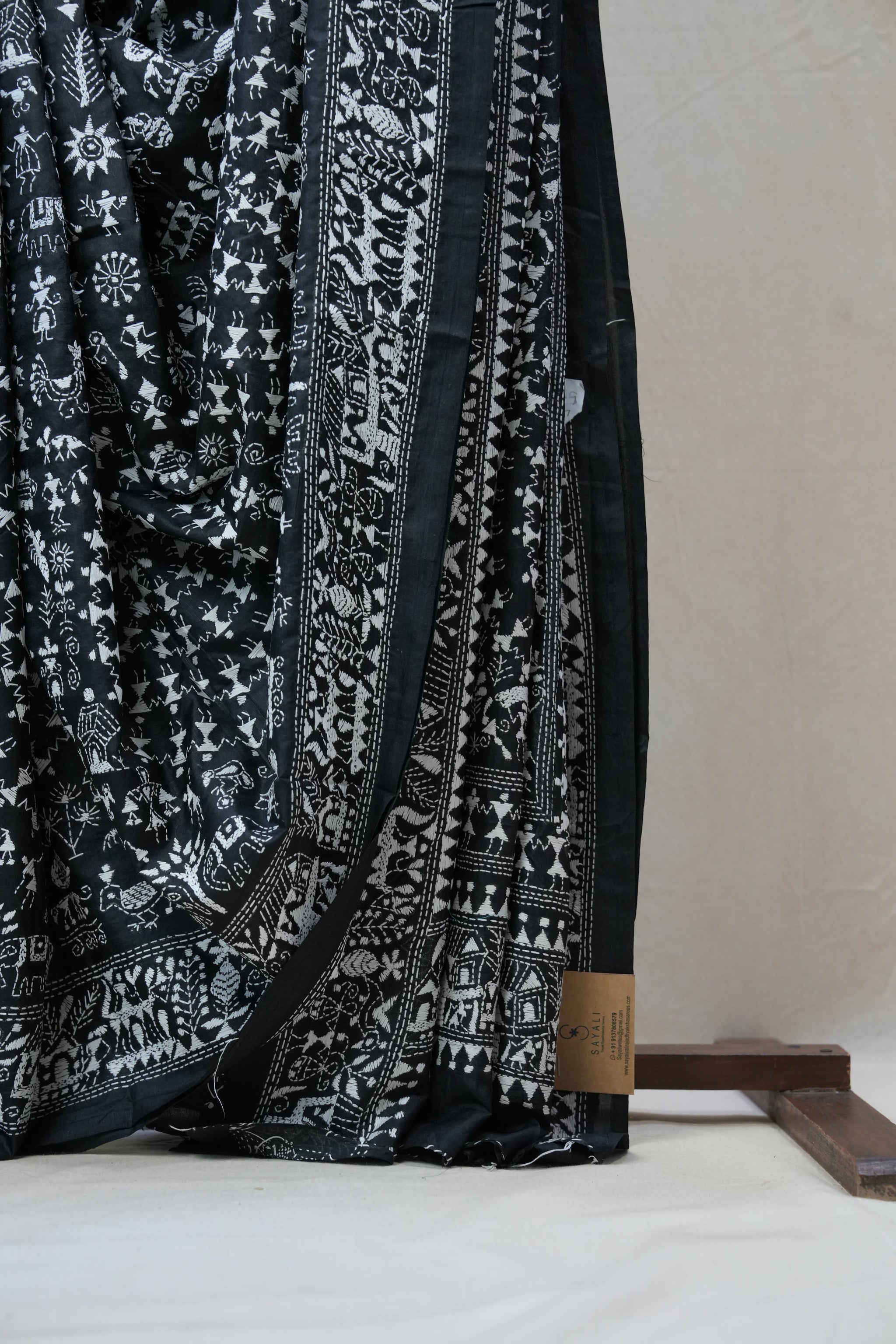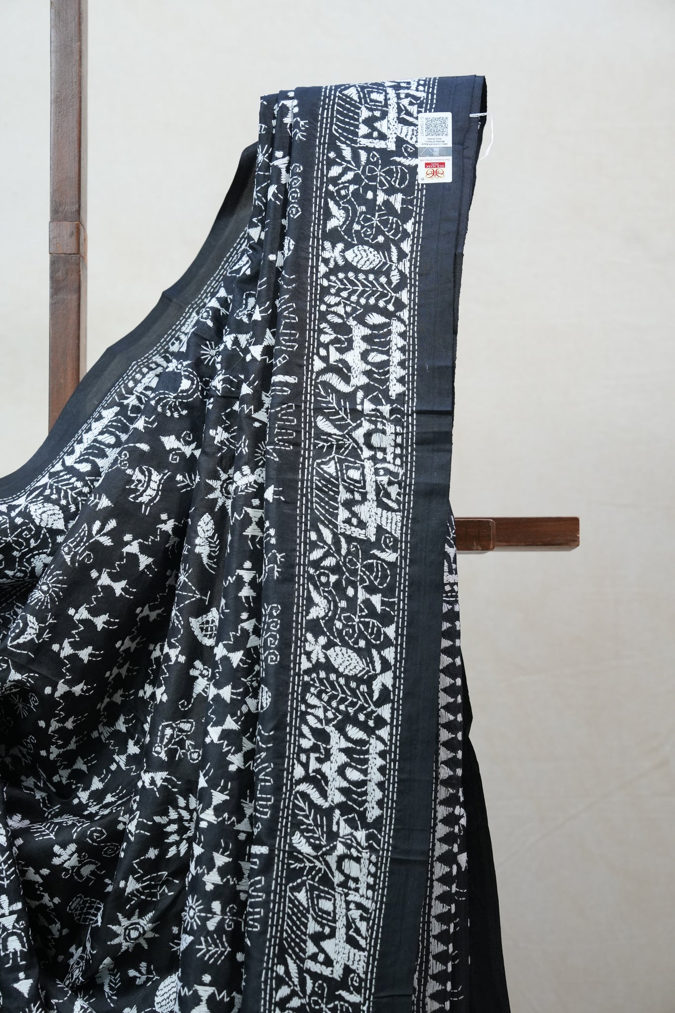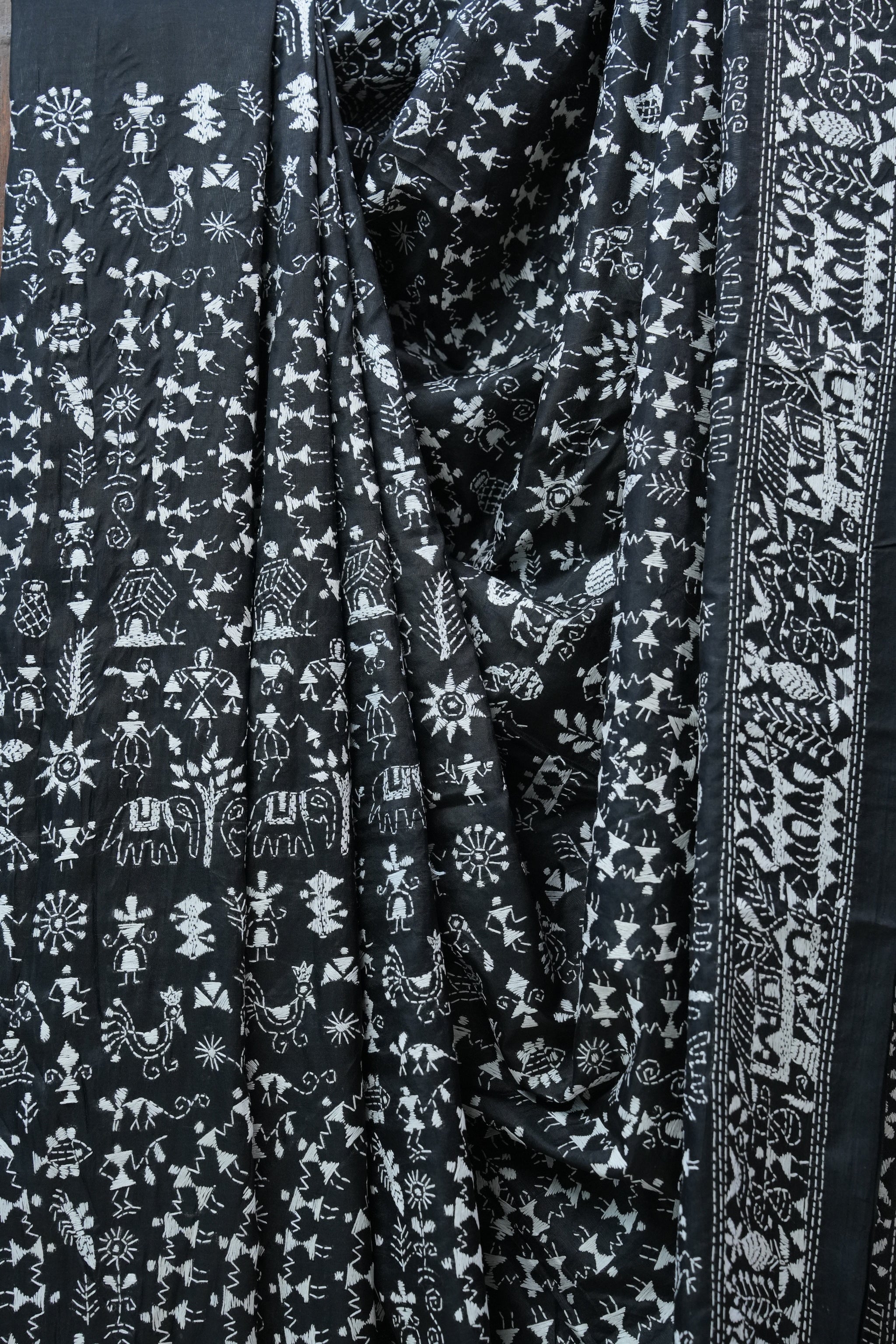 Work - This kantha tussar saree features intricate hand-embroidered kantha work with vibrant floral and paisley motifs.