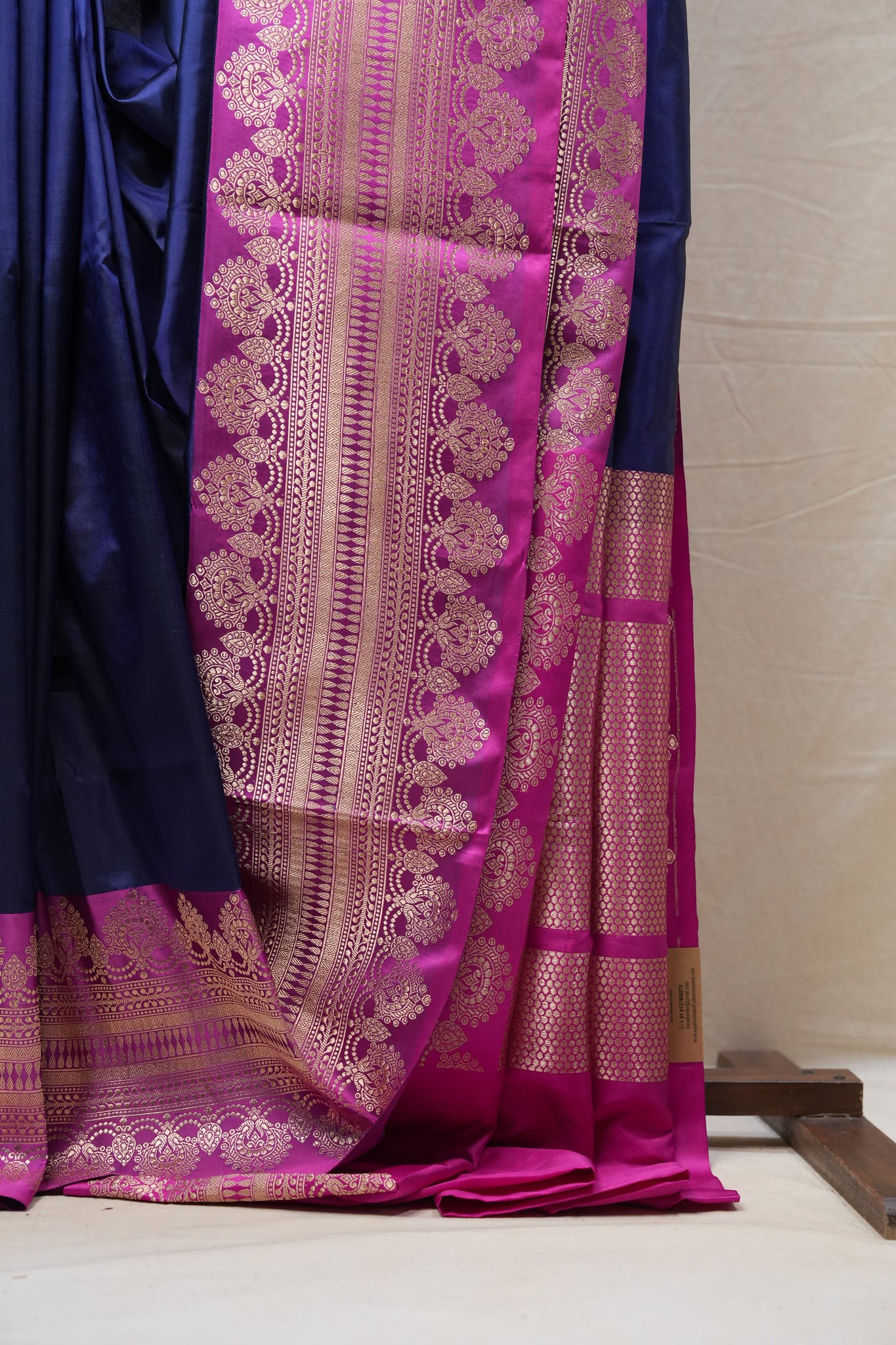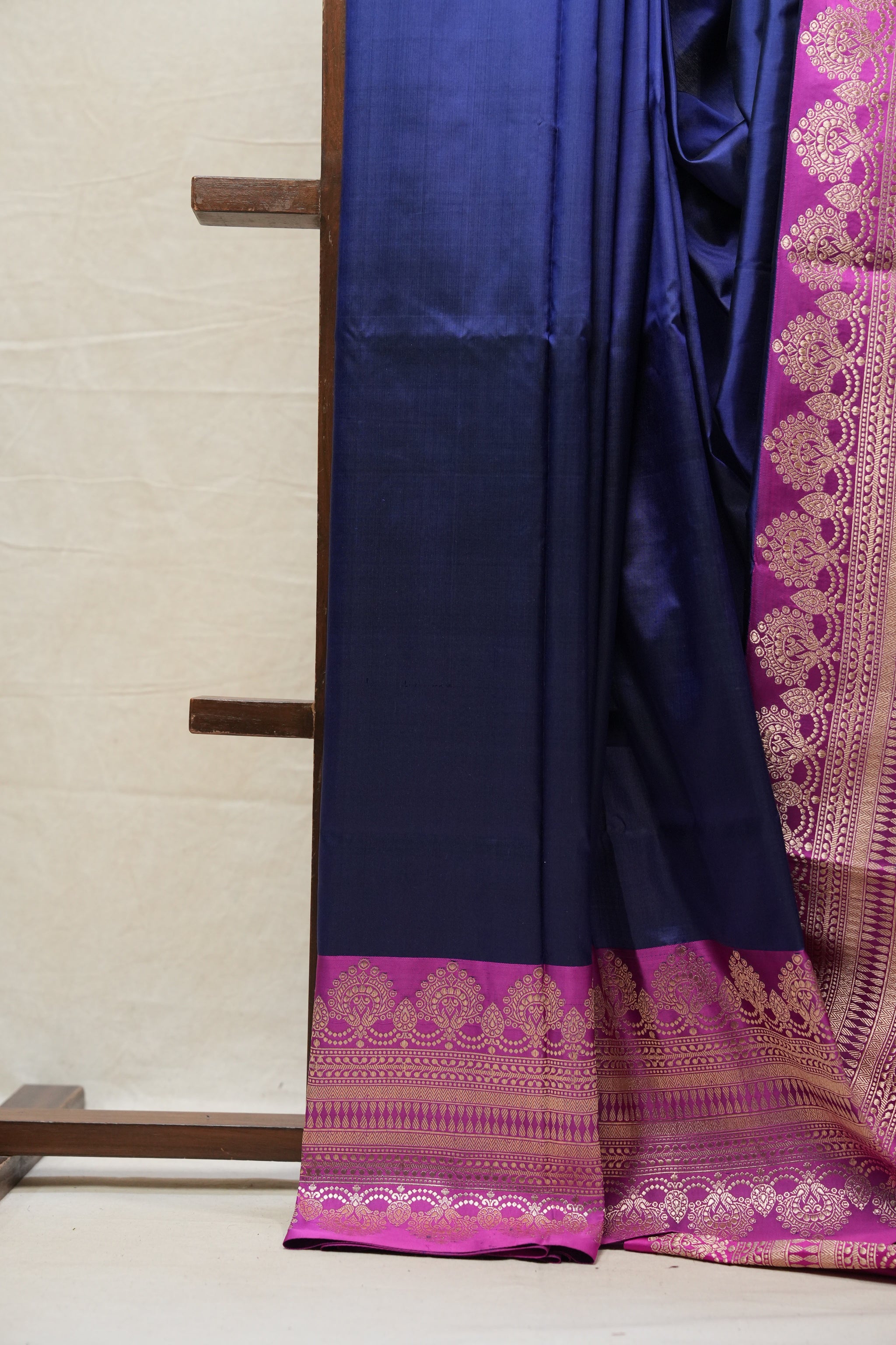 Work - This is a banarasi silk saree in a blue base, featuring small buti motifs woven across the body and a rich red zari floral border and pallu with intricate traditional designs.