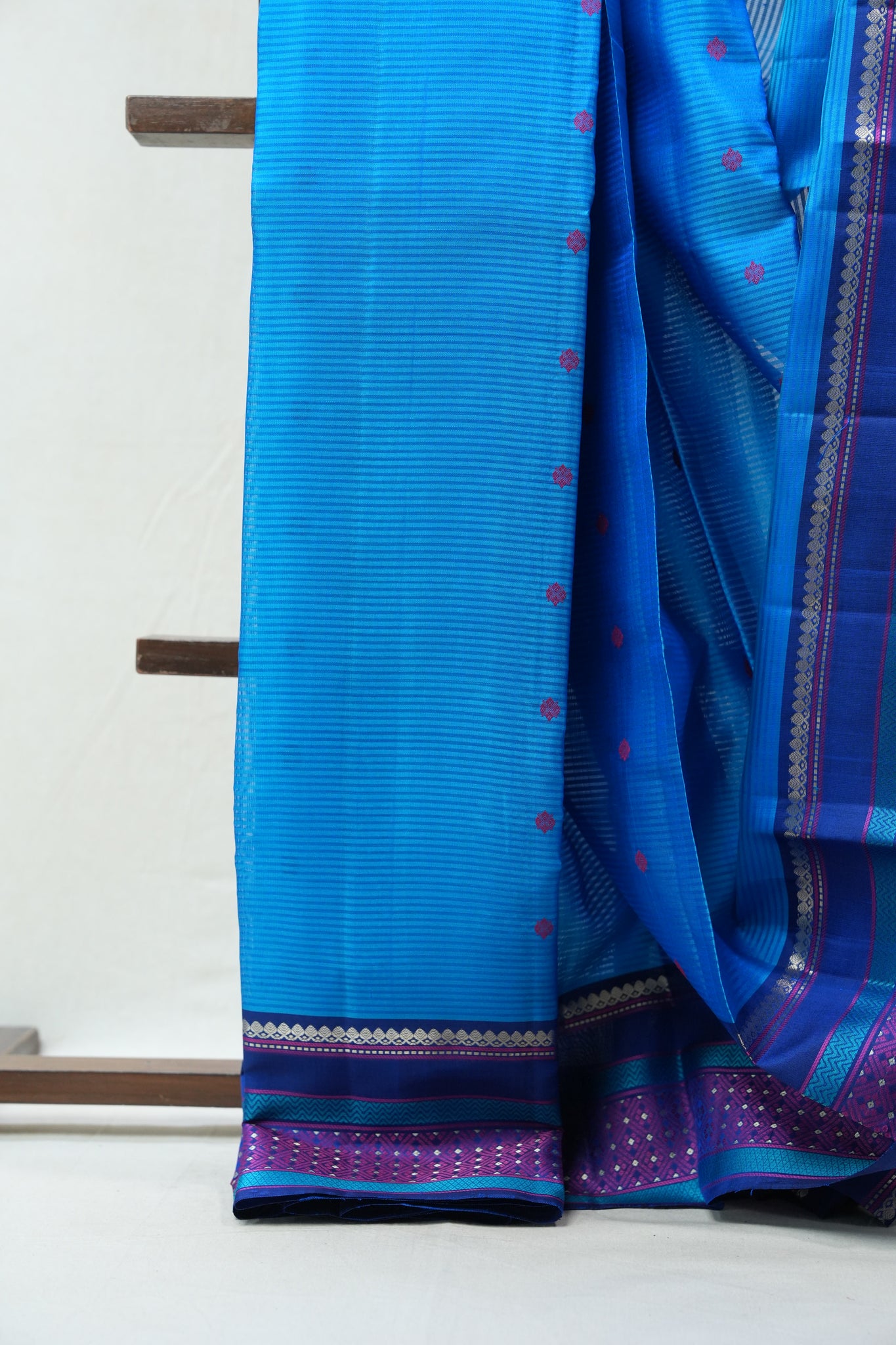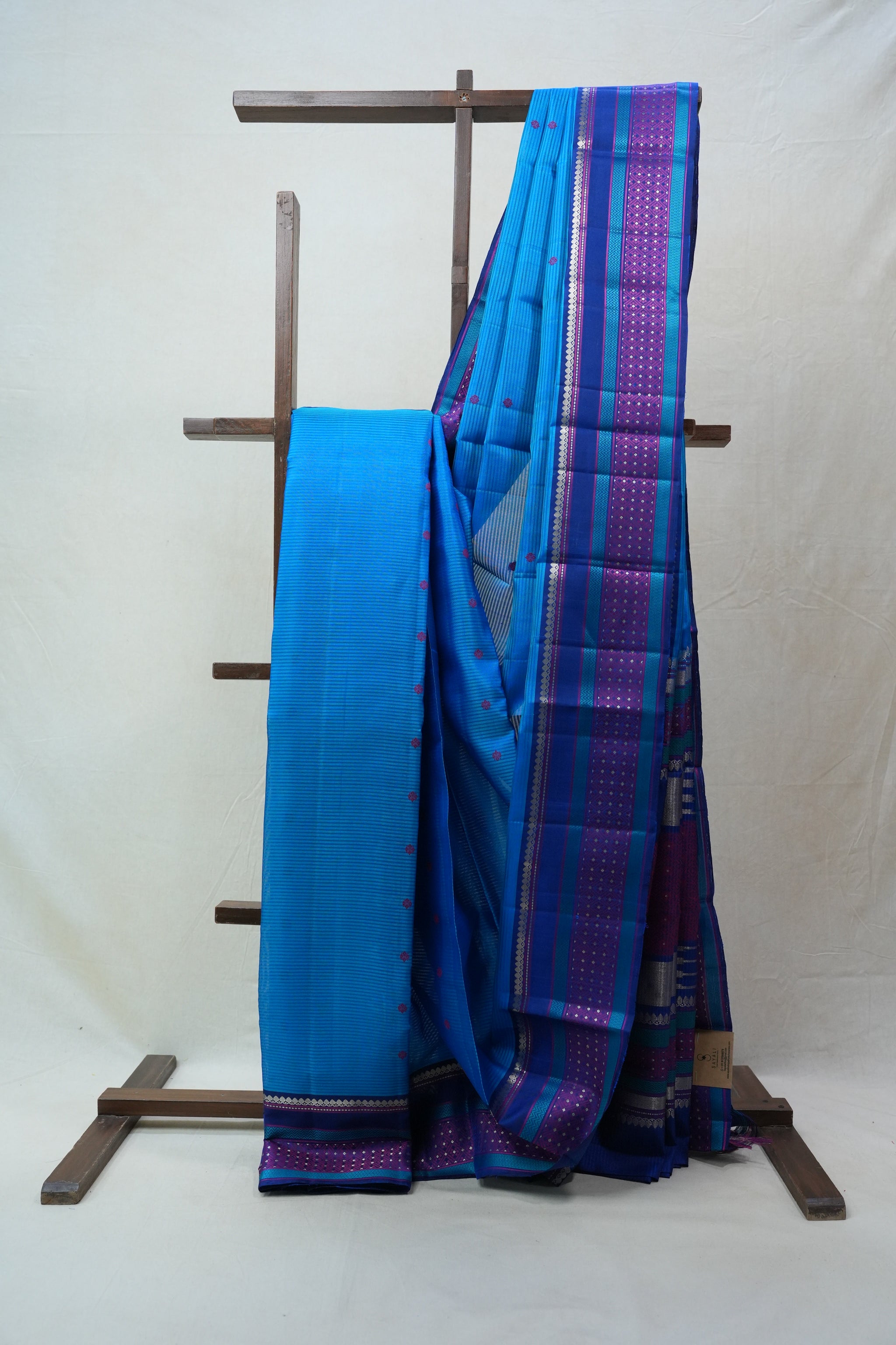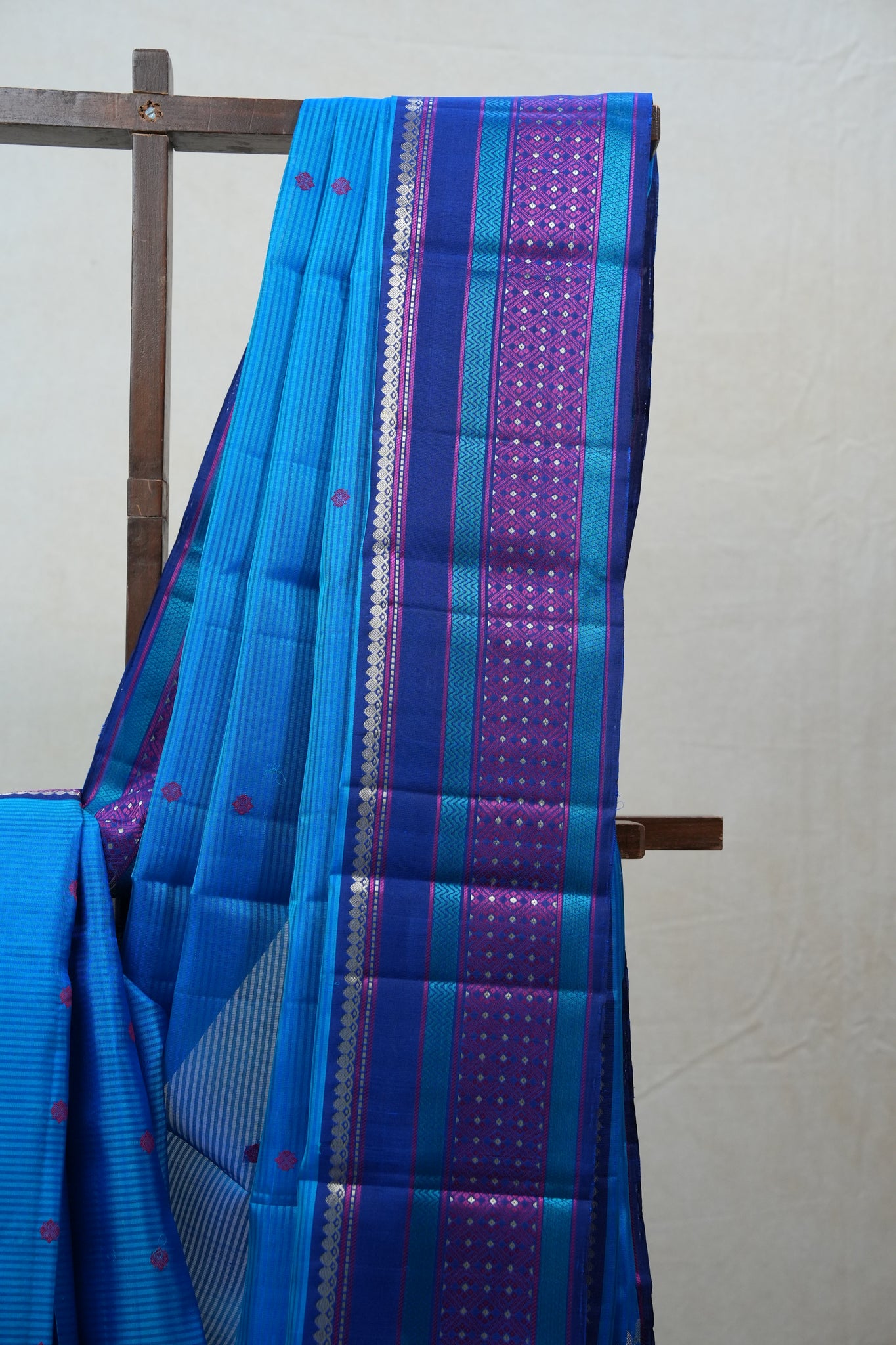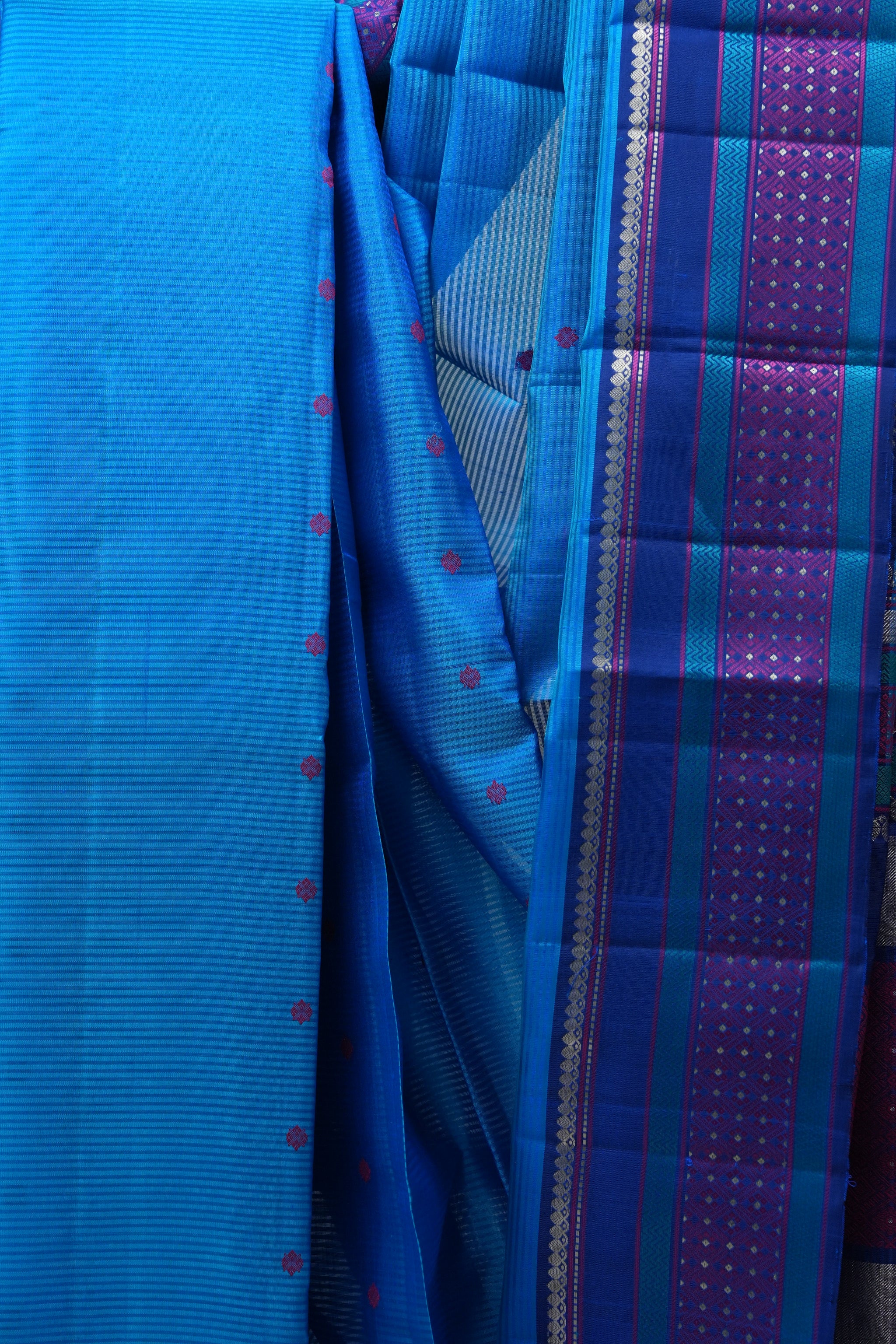 Work - This Kanjeevaram silk saree features a vibrant blue stripes body with butti, paired with a contrasting pallu and border.