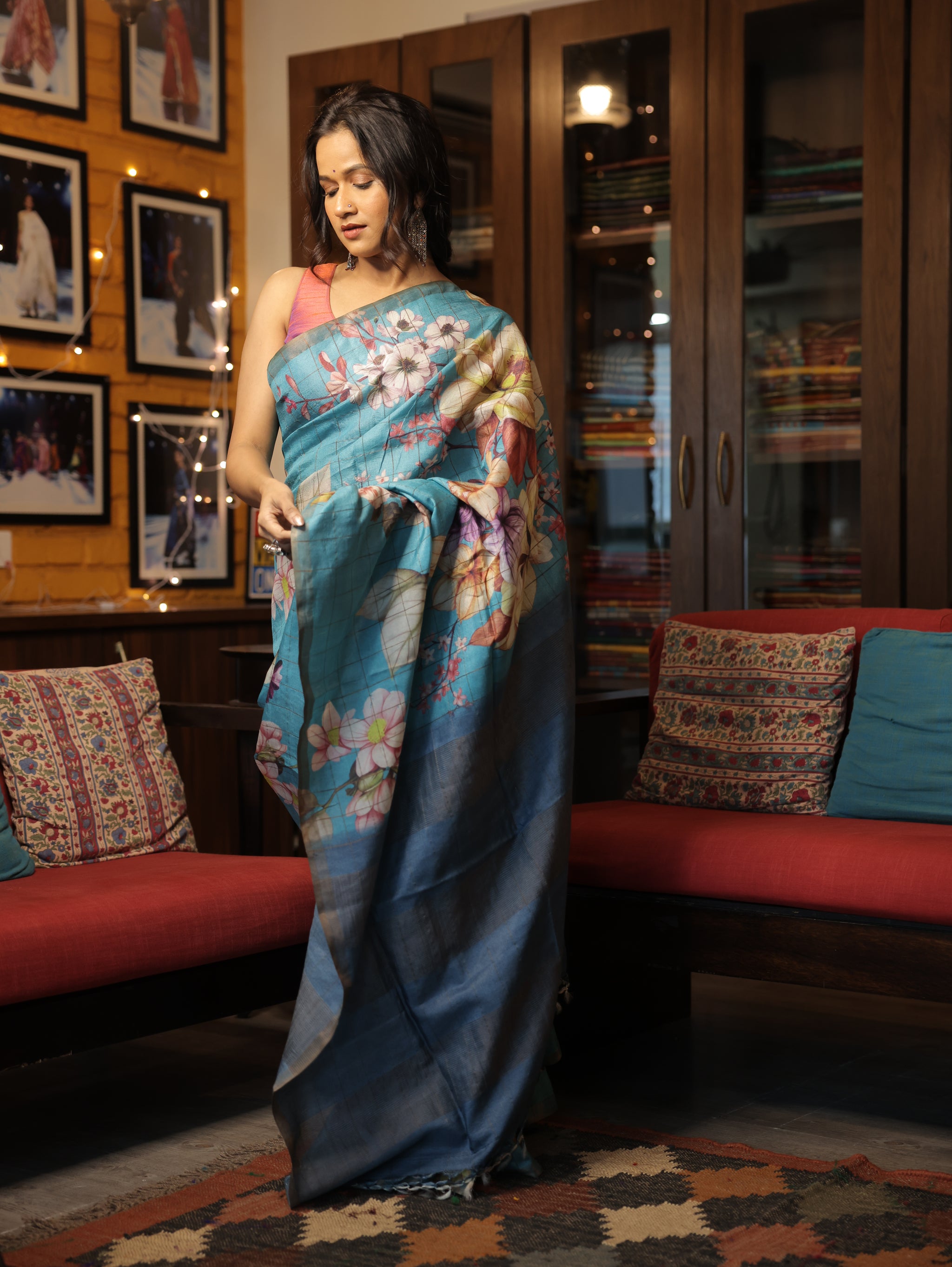 Work - Blue tussar silk with floral print work and subtle checked texture.