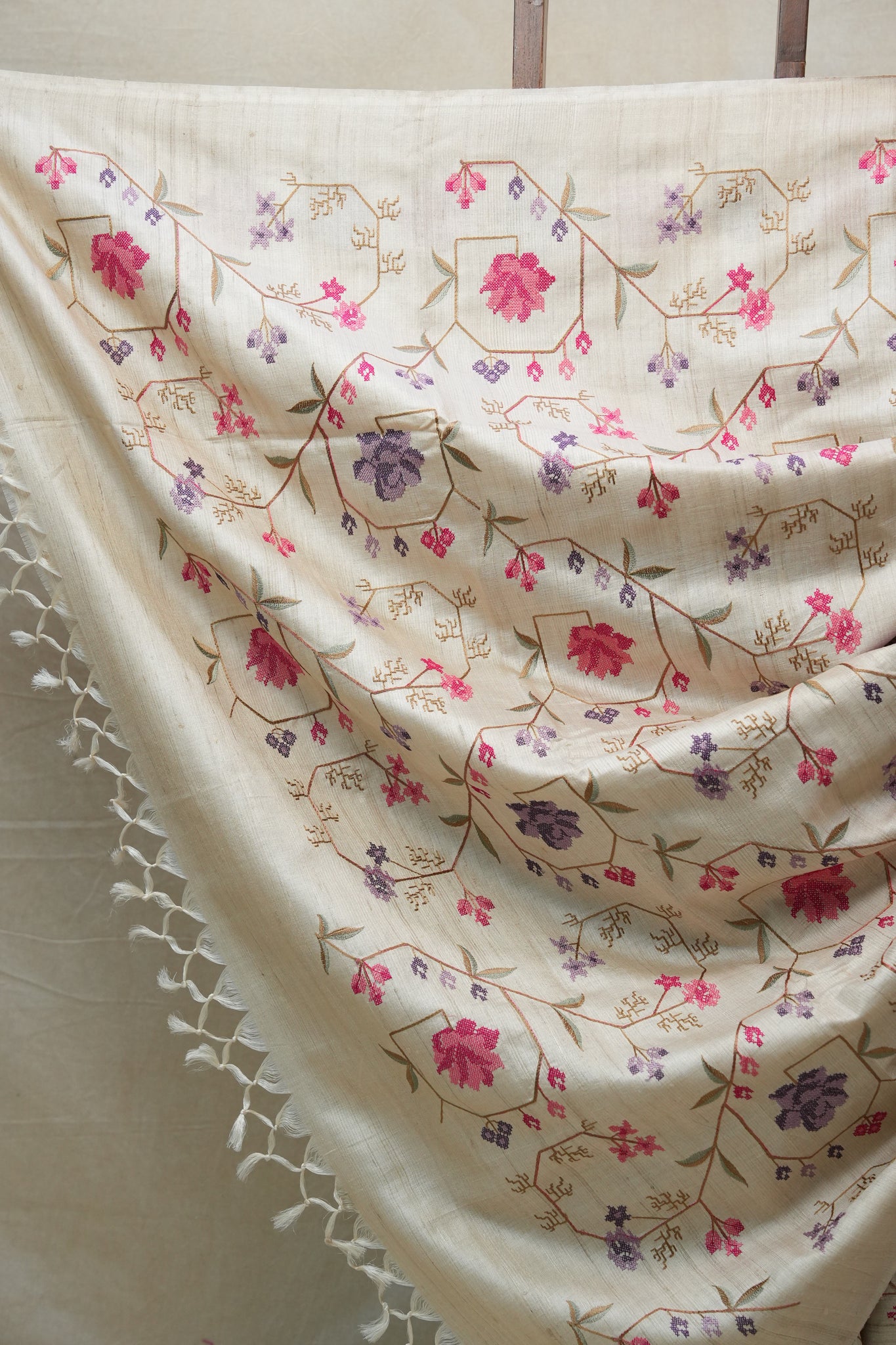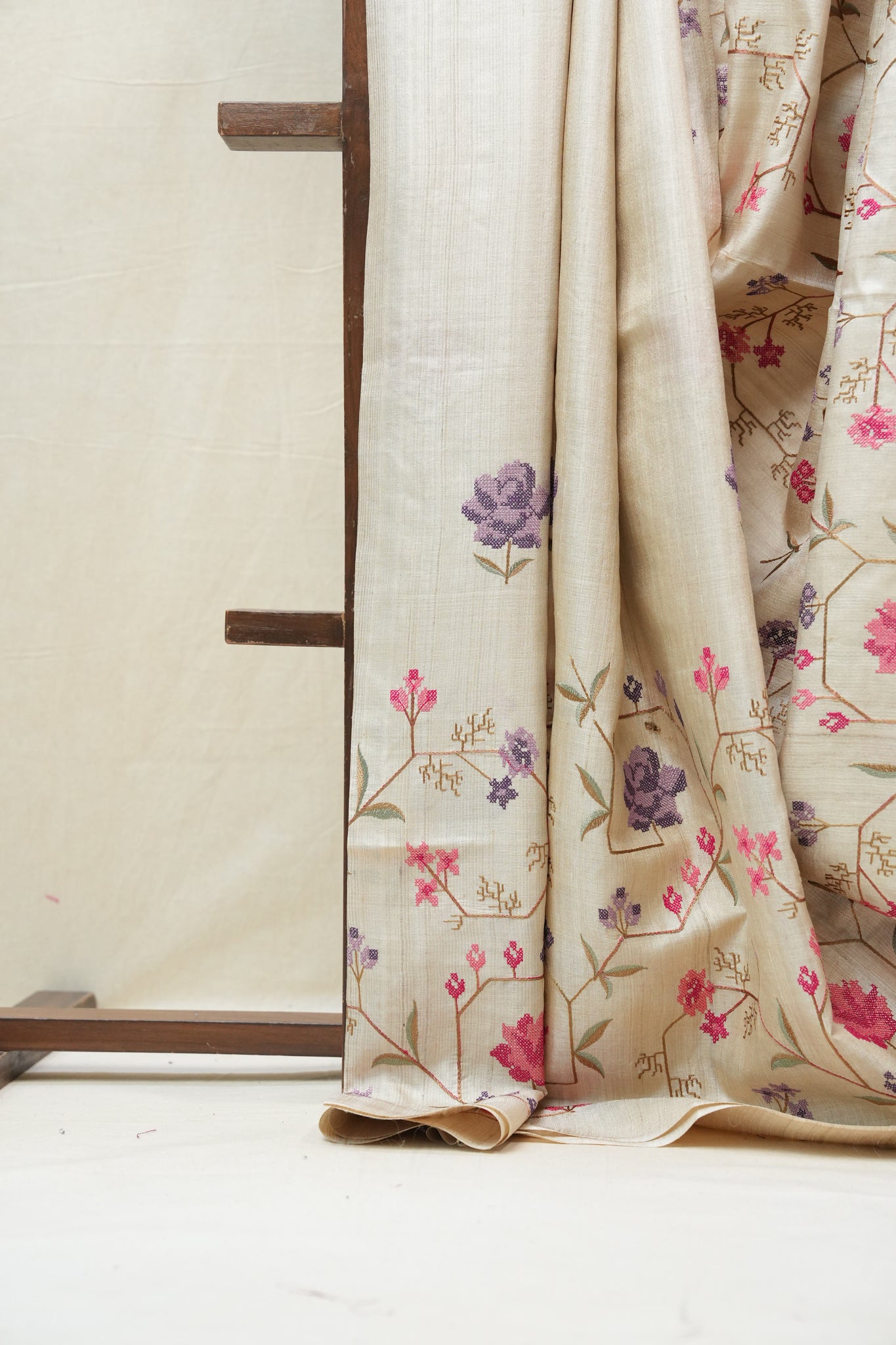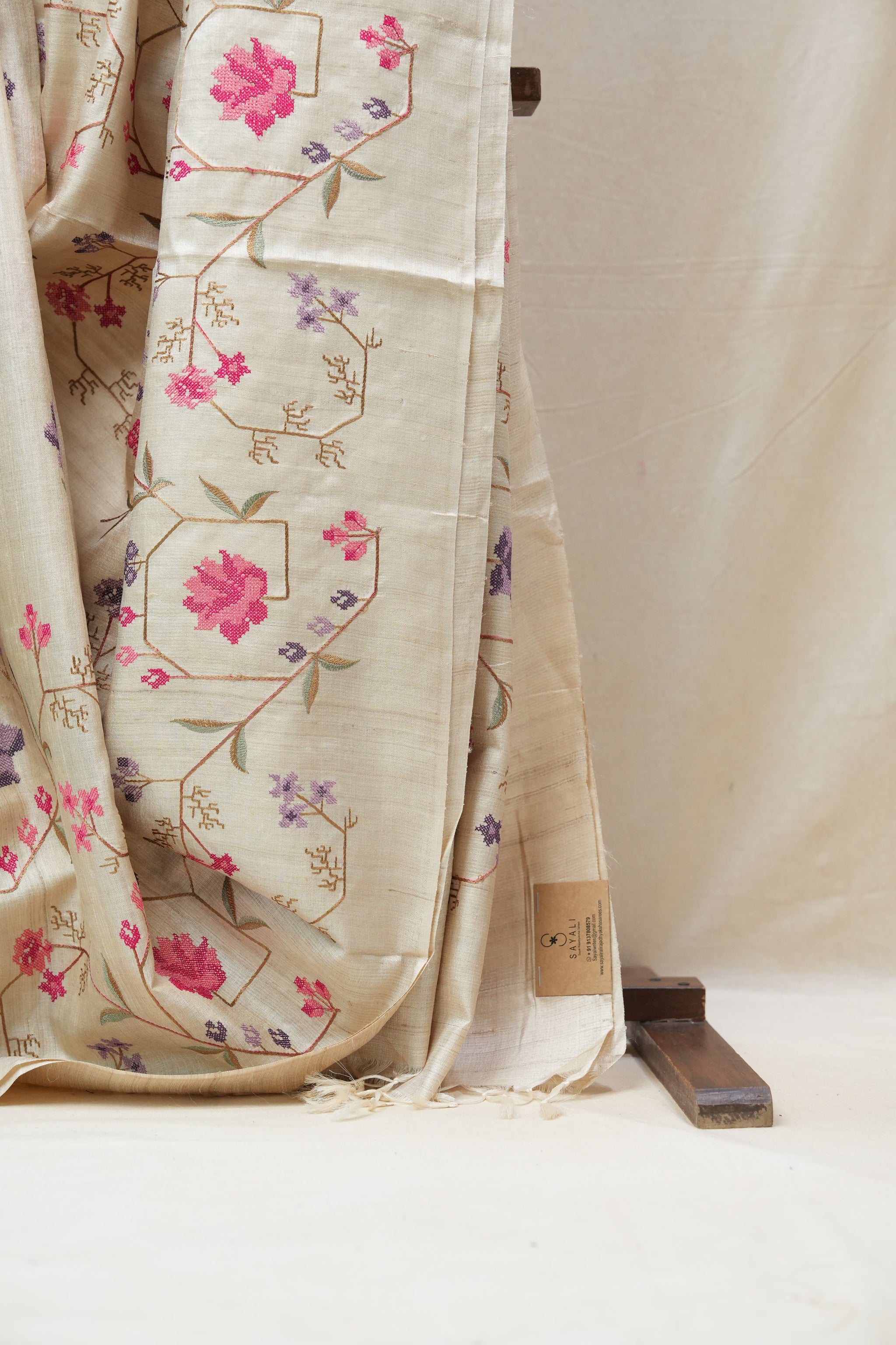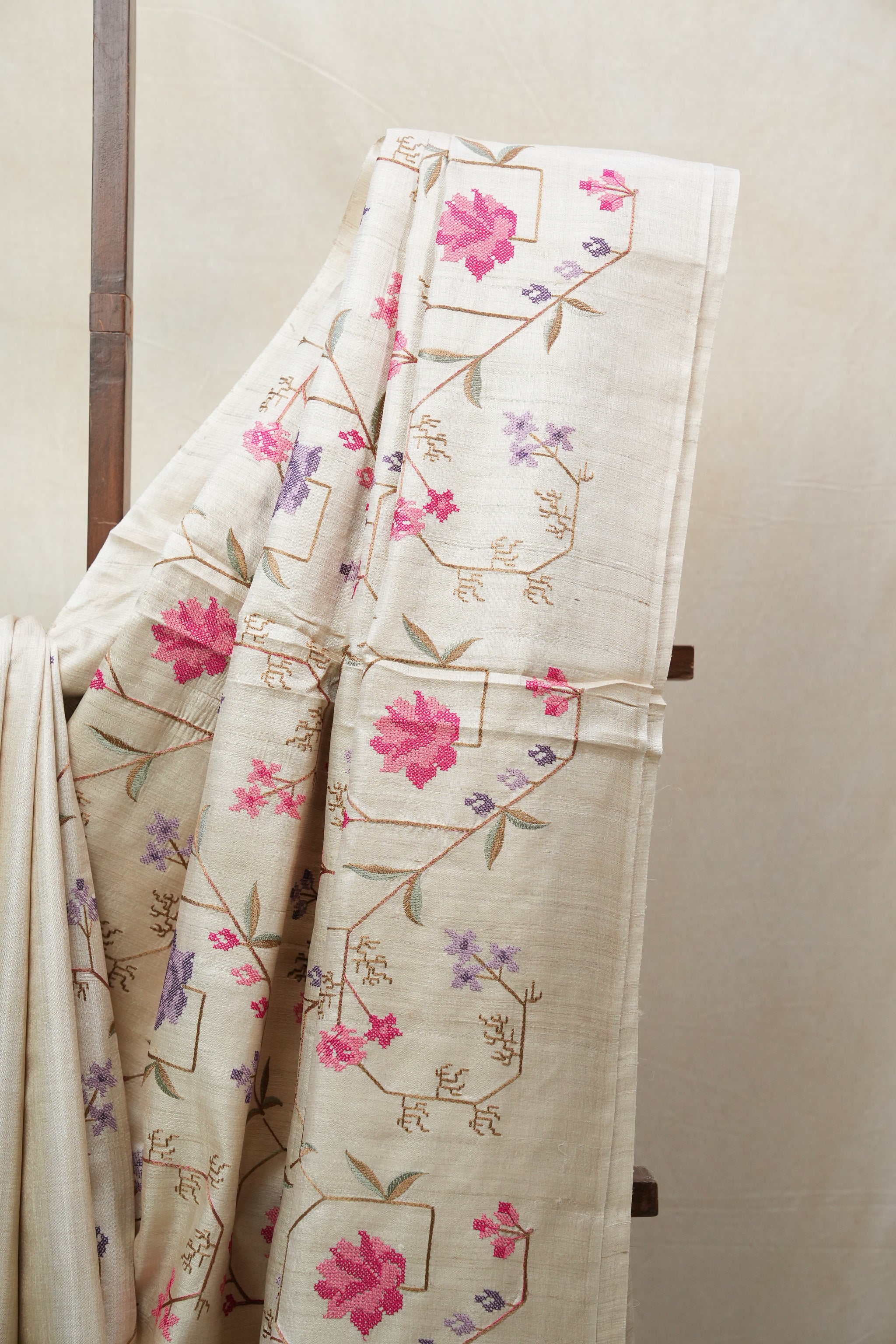 Cream Machine Embroidered Tussar Silk Saree - SRCMETSS1448