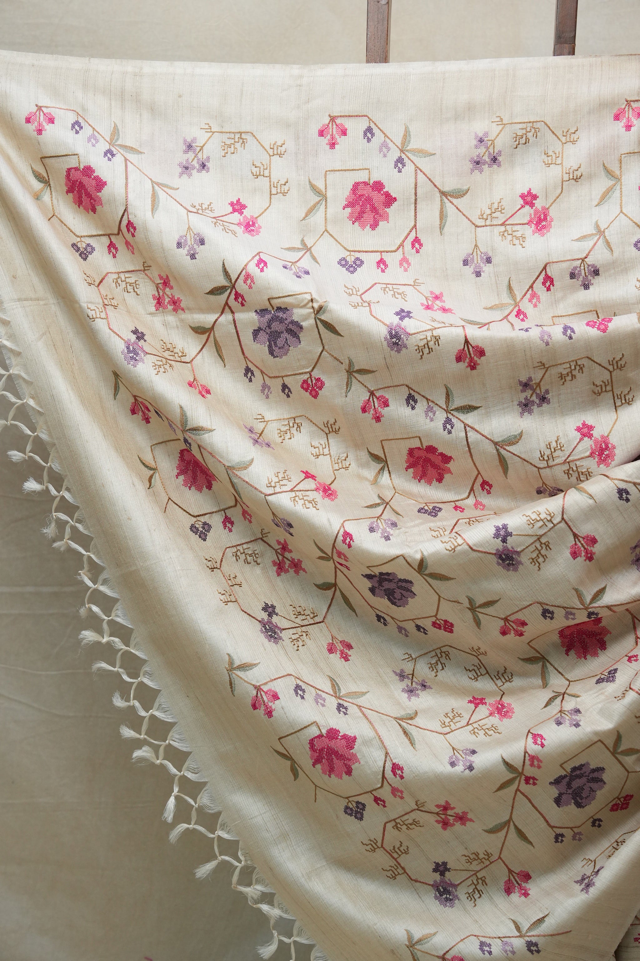 Work - This is a tussar silk saree with elegant multi-color floral embroidery work