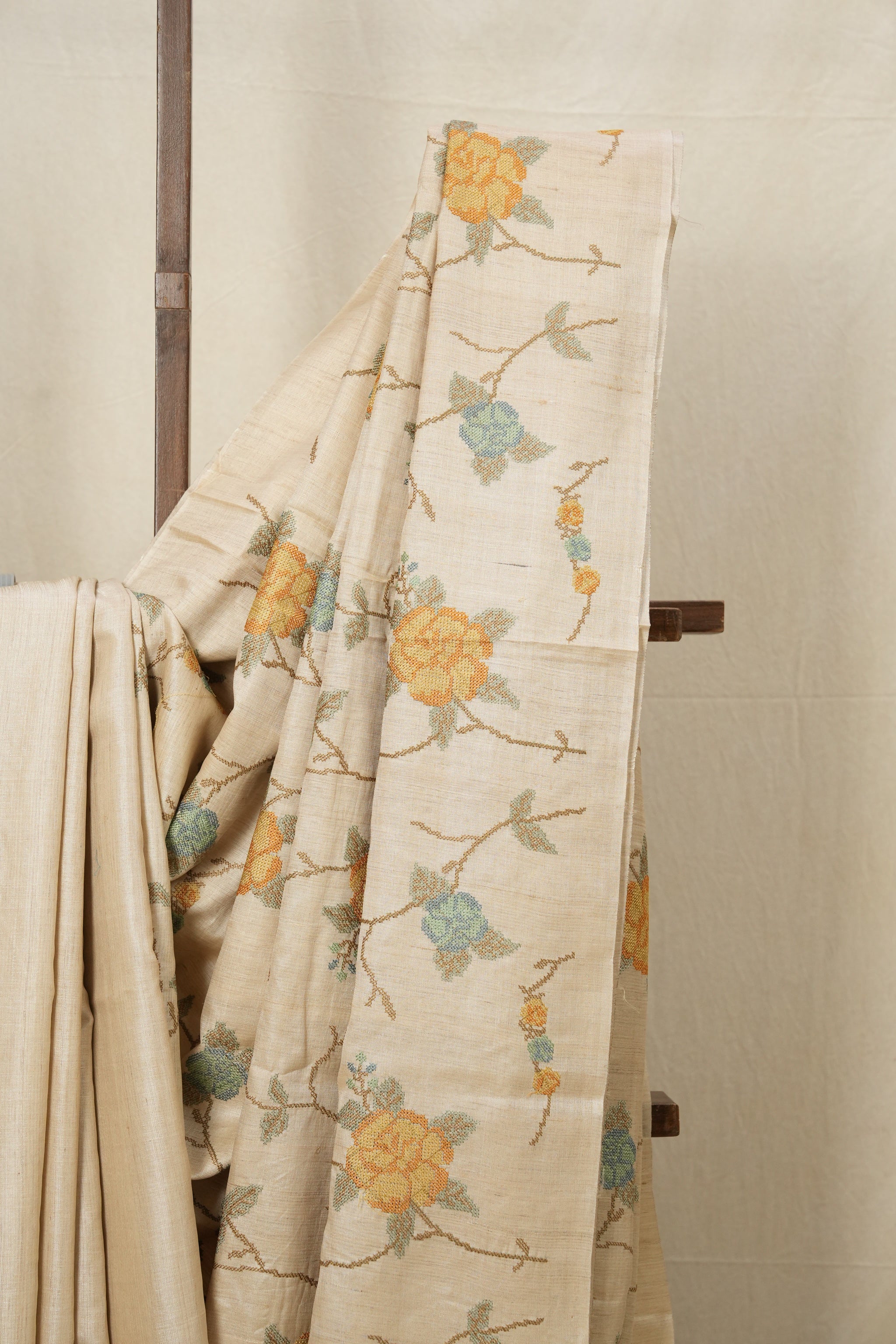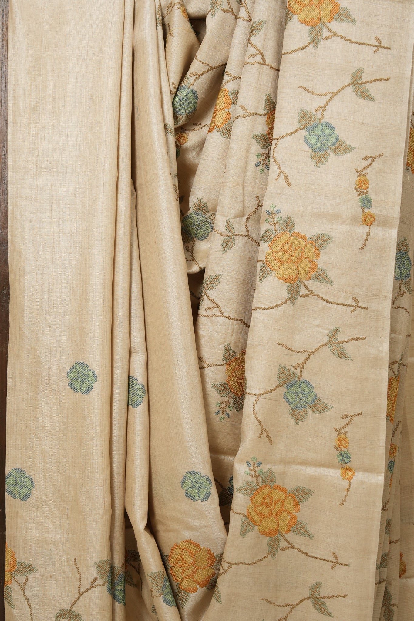 Work - This is a tussar silk saree with elegant multi-color floral embroidery work