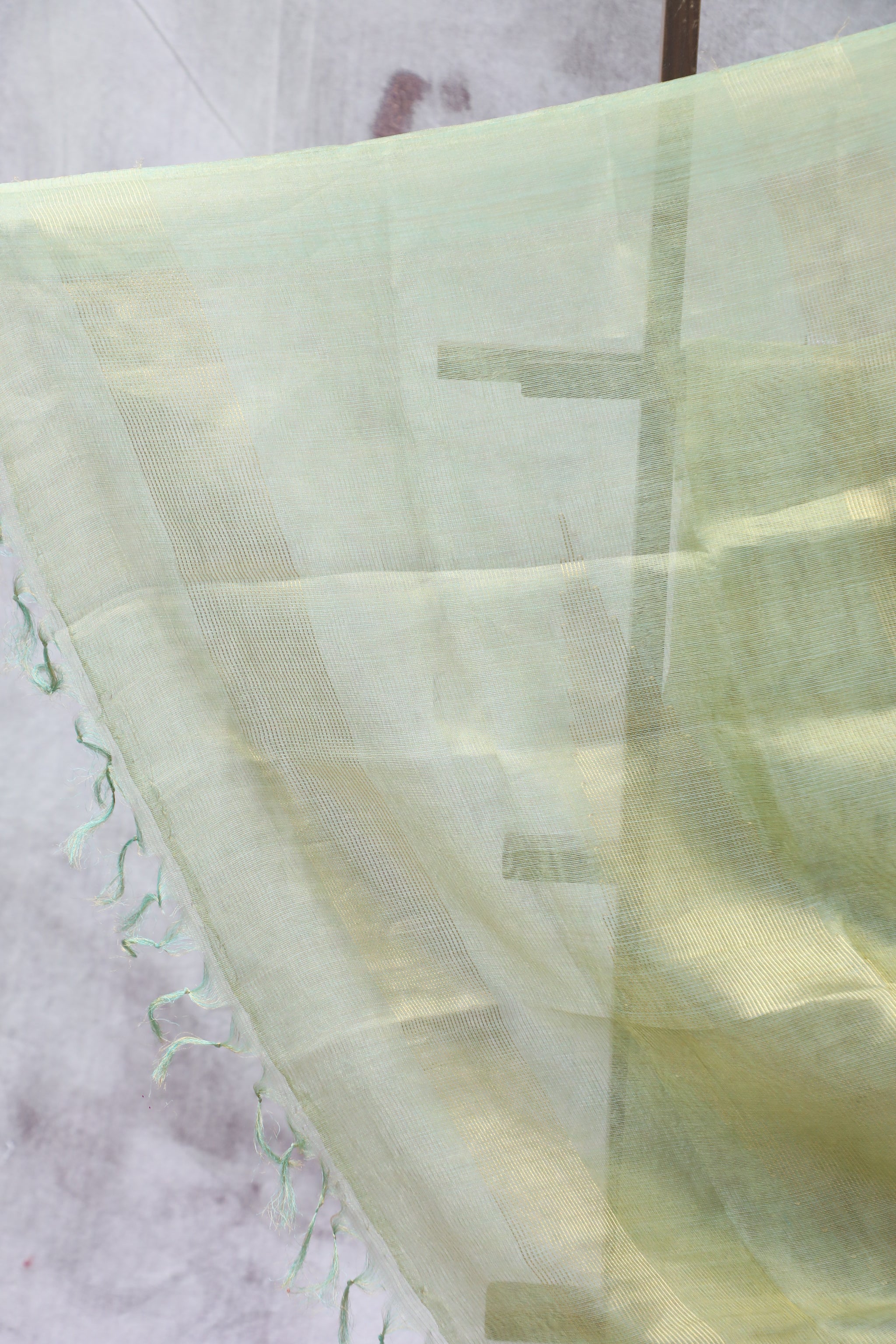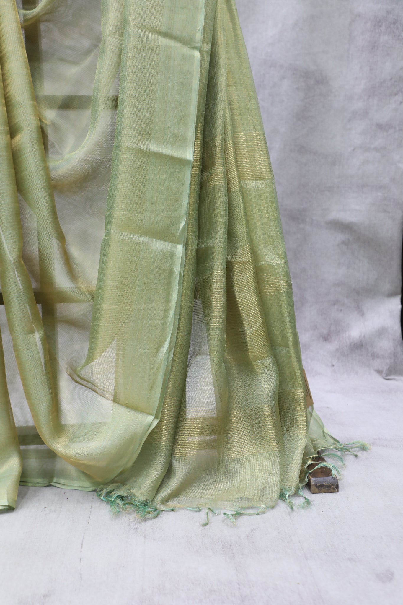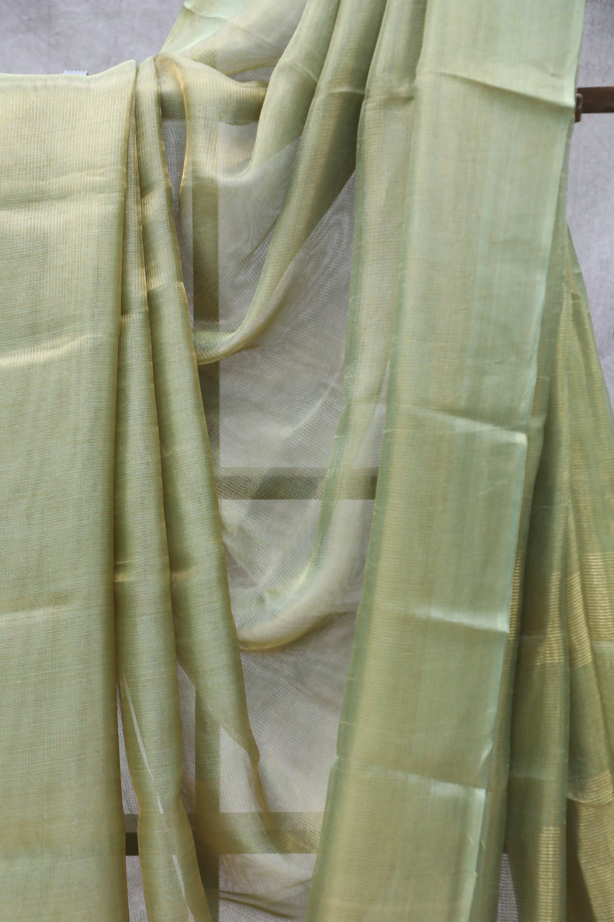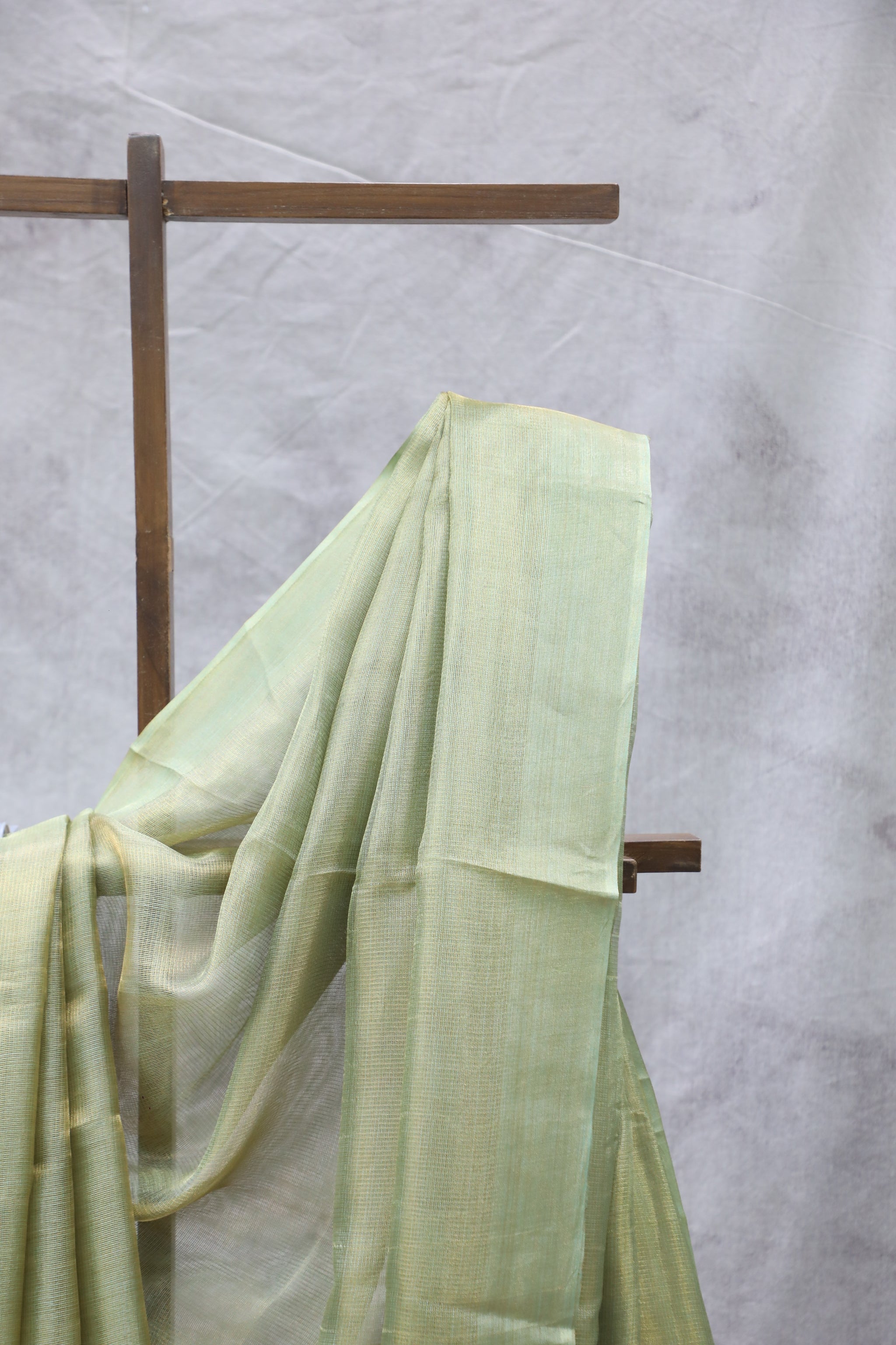 This handloom plain green tussar silk saree self border. Comes with running blouse piece. This saree a perfect option as a function. Tussar tissue silk saree is a luxurious traditional Indian attire crafted from Tussar silk, known for its rich texture and natural silver sheen. The tissue-like finish enhances its elegance, making it a popular choice for special occasions.