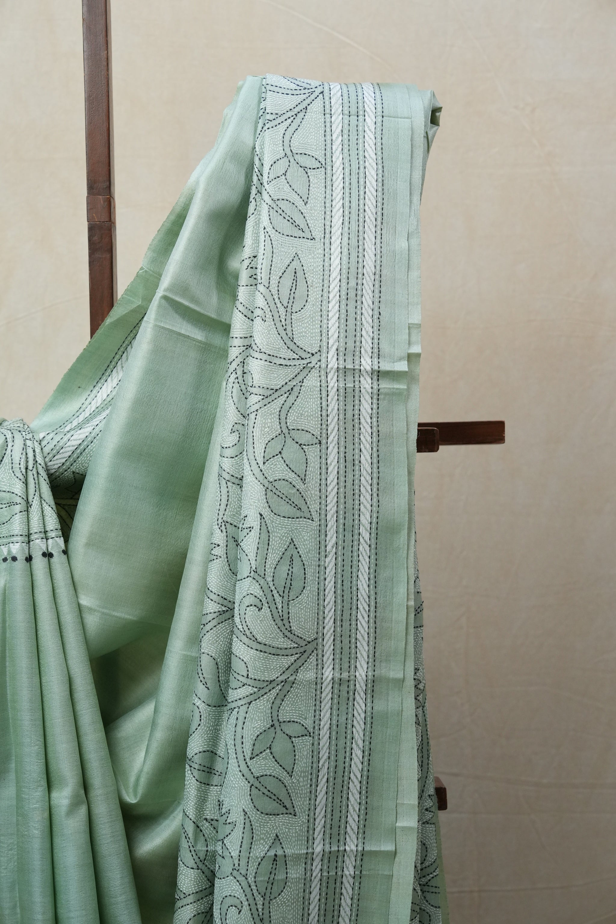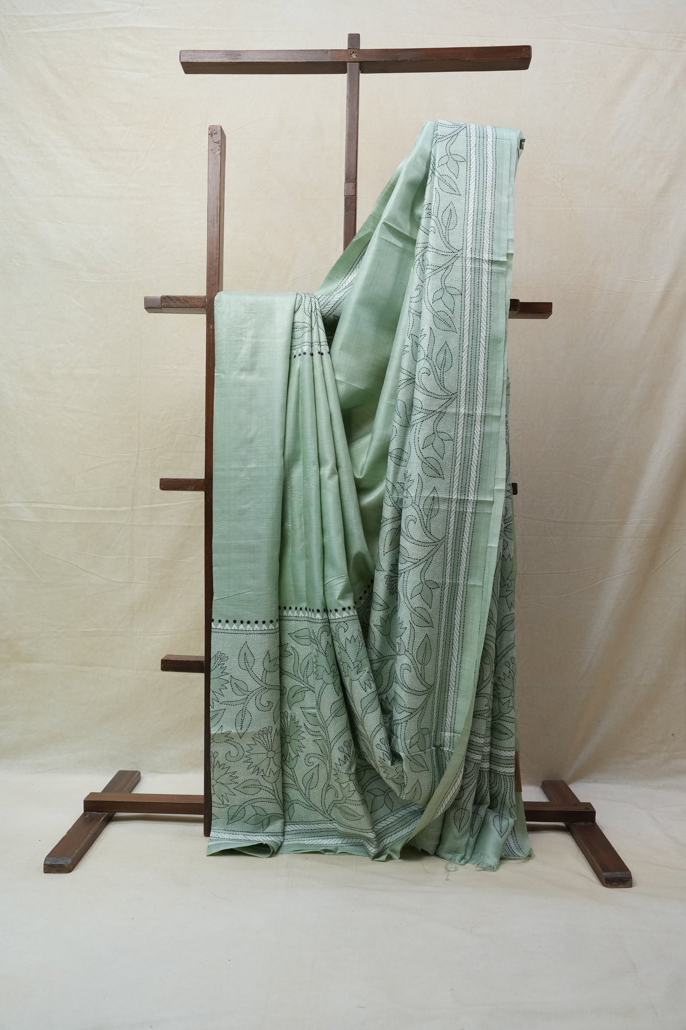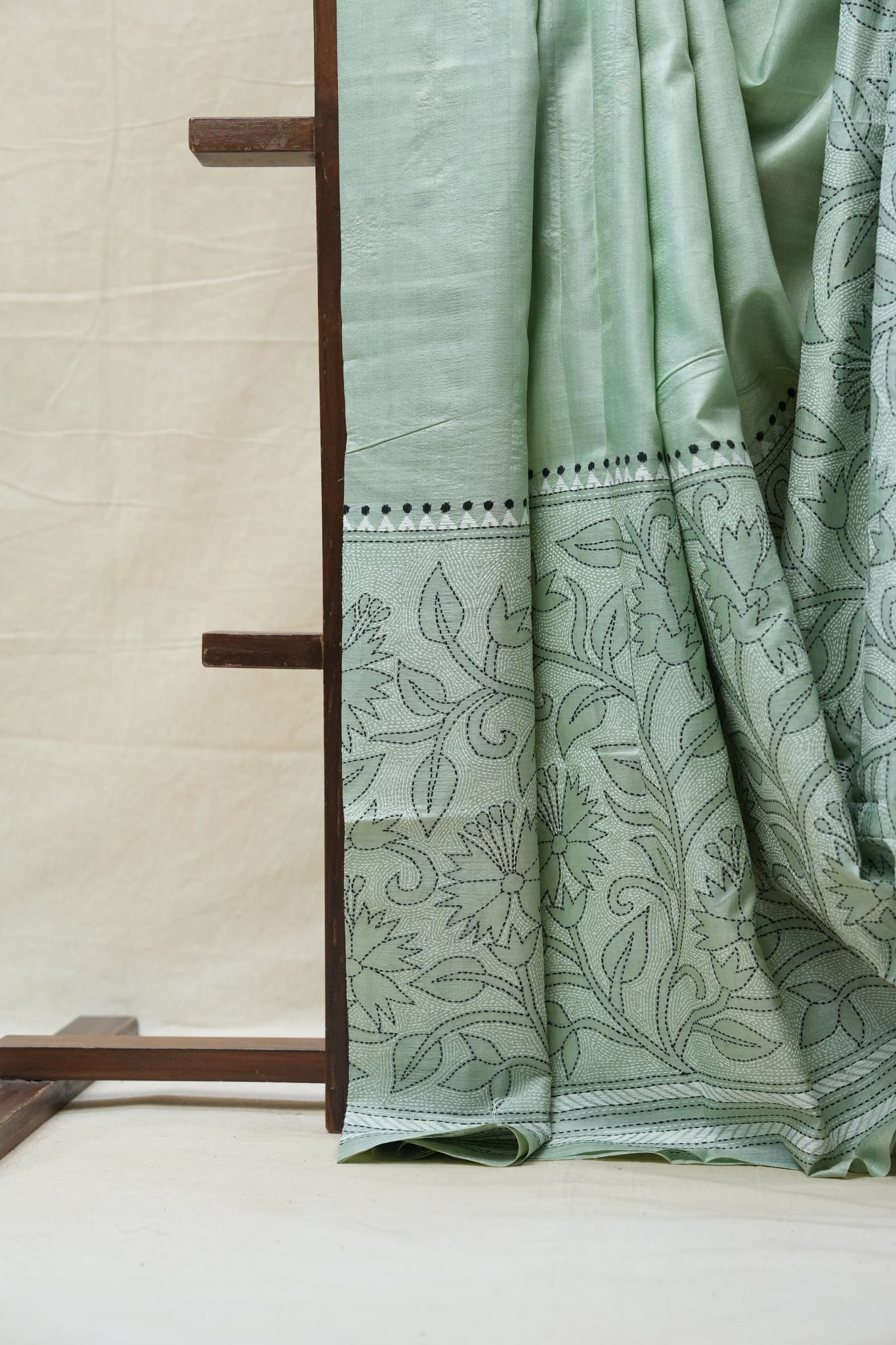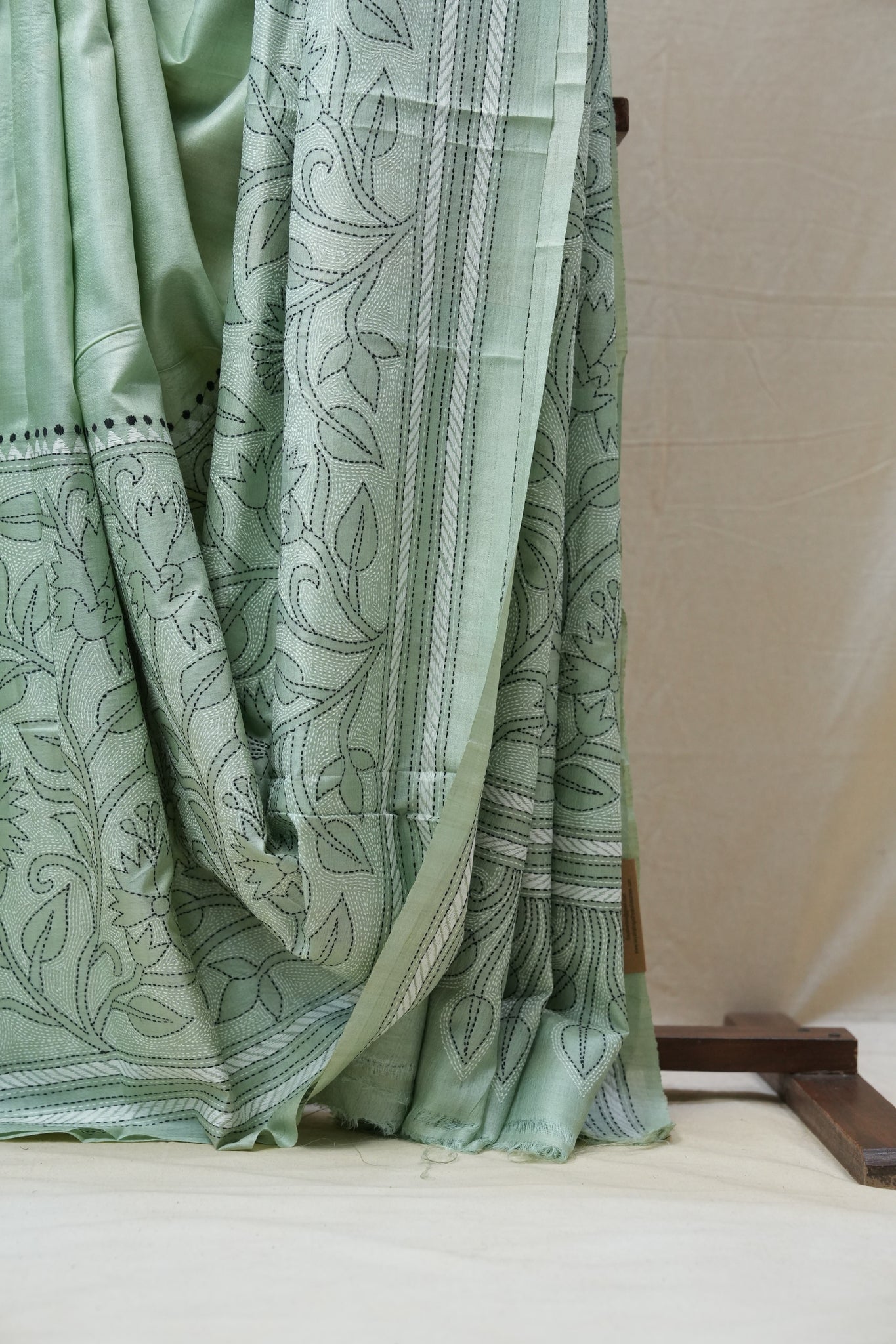Work - This kantha tussar saree features intricate hand-embroidered kantha work with vibrant floral and paisley motifs.