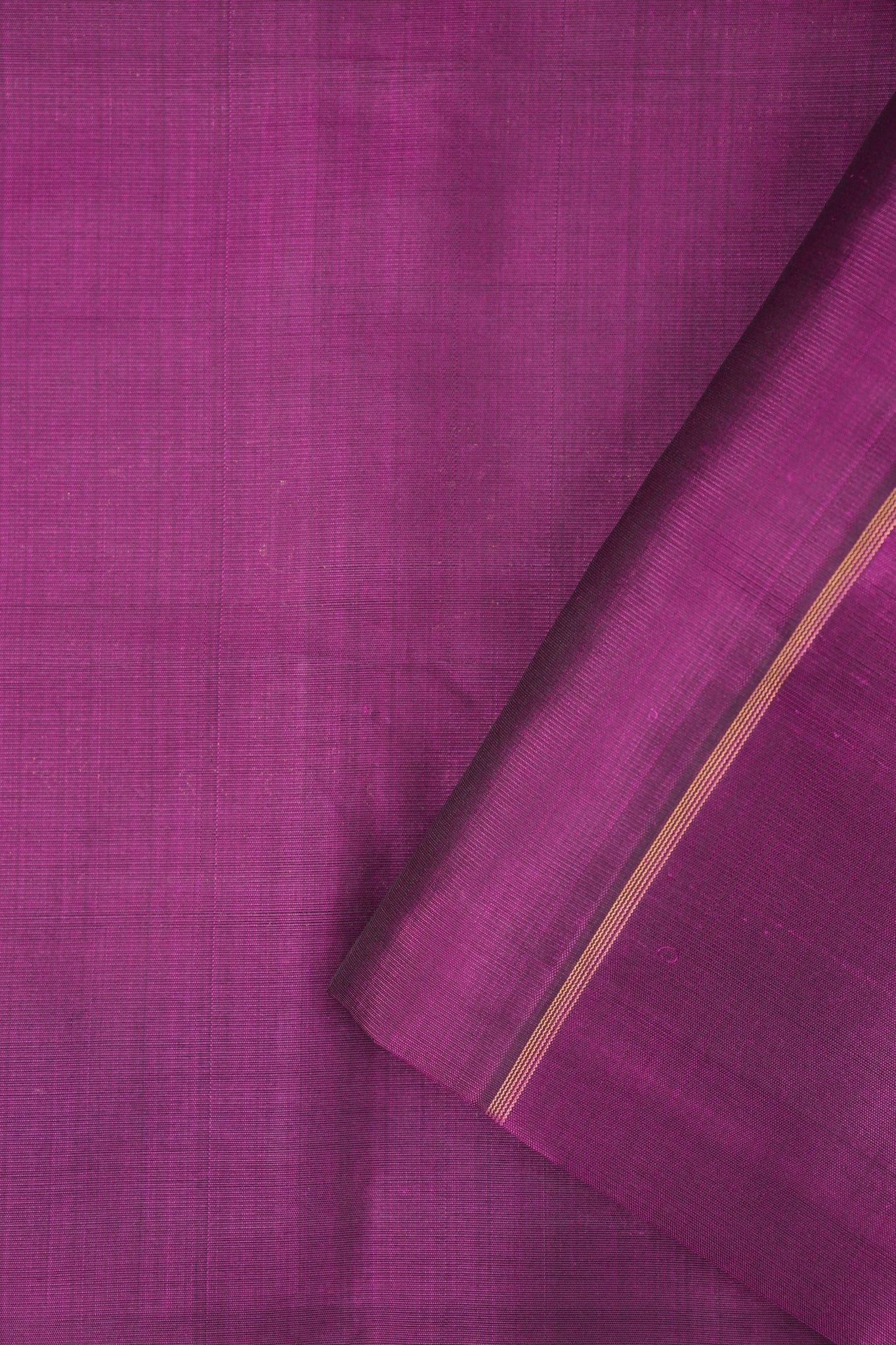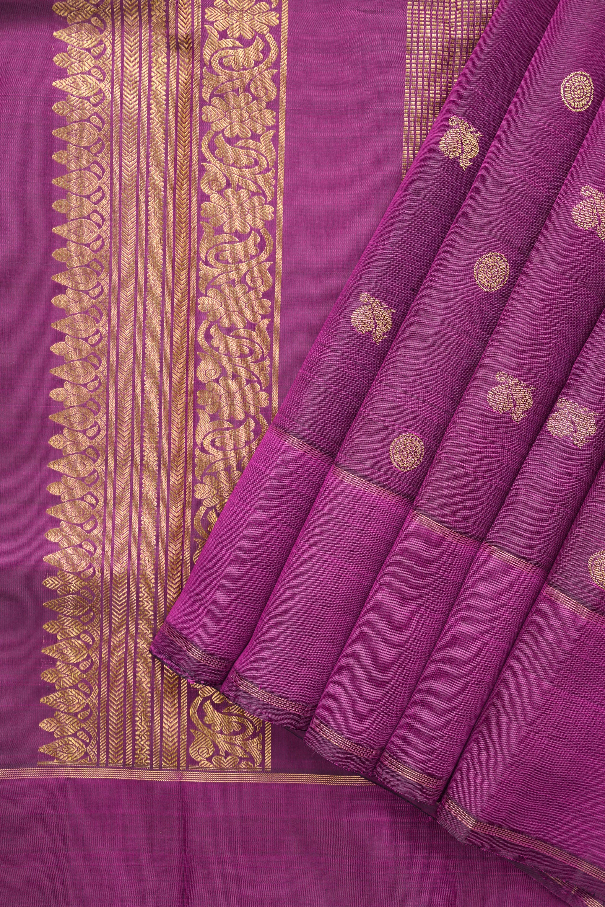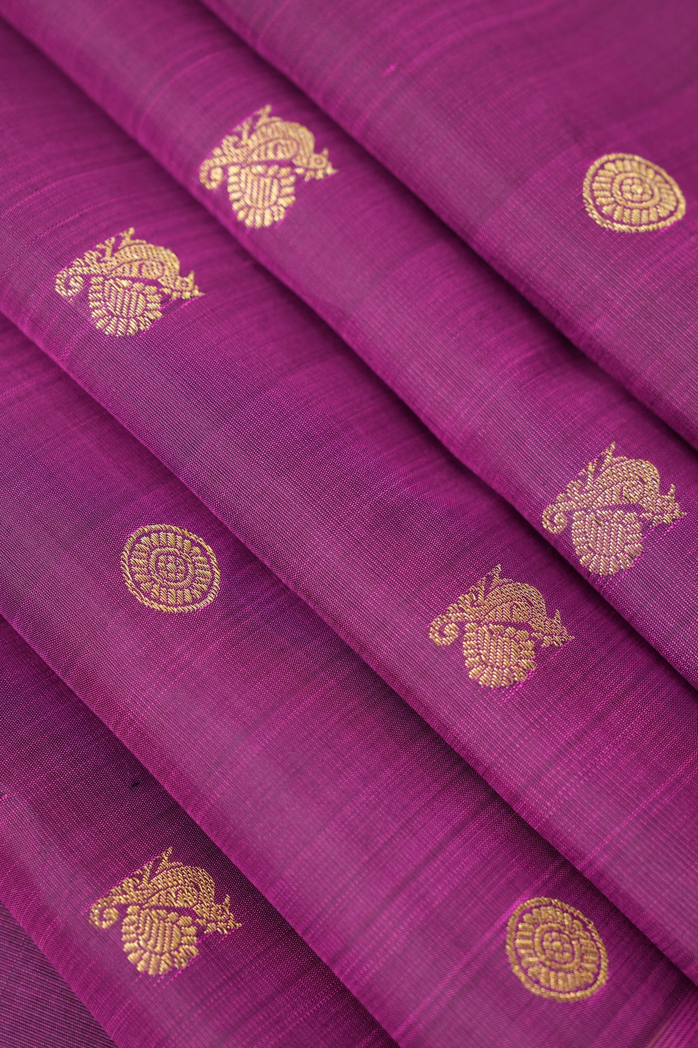 Work - This Kanjeevaram silk saree features a vibrant magenta body with gold zari butti, paired with a contrasting pallu and border.
