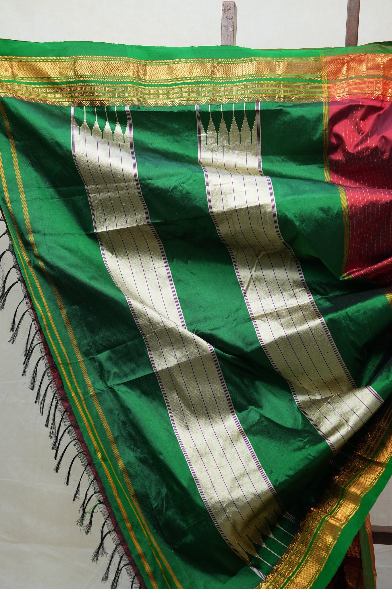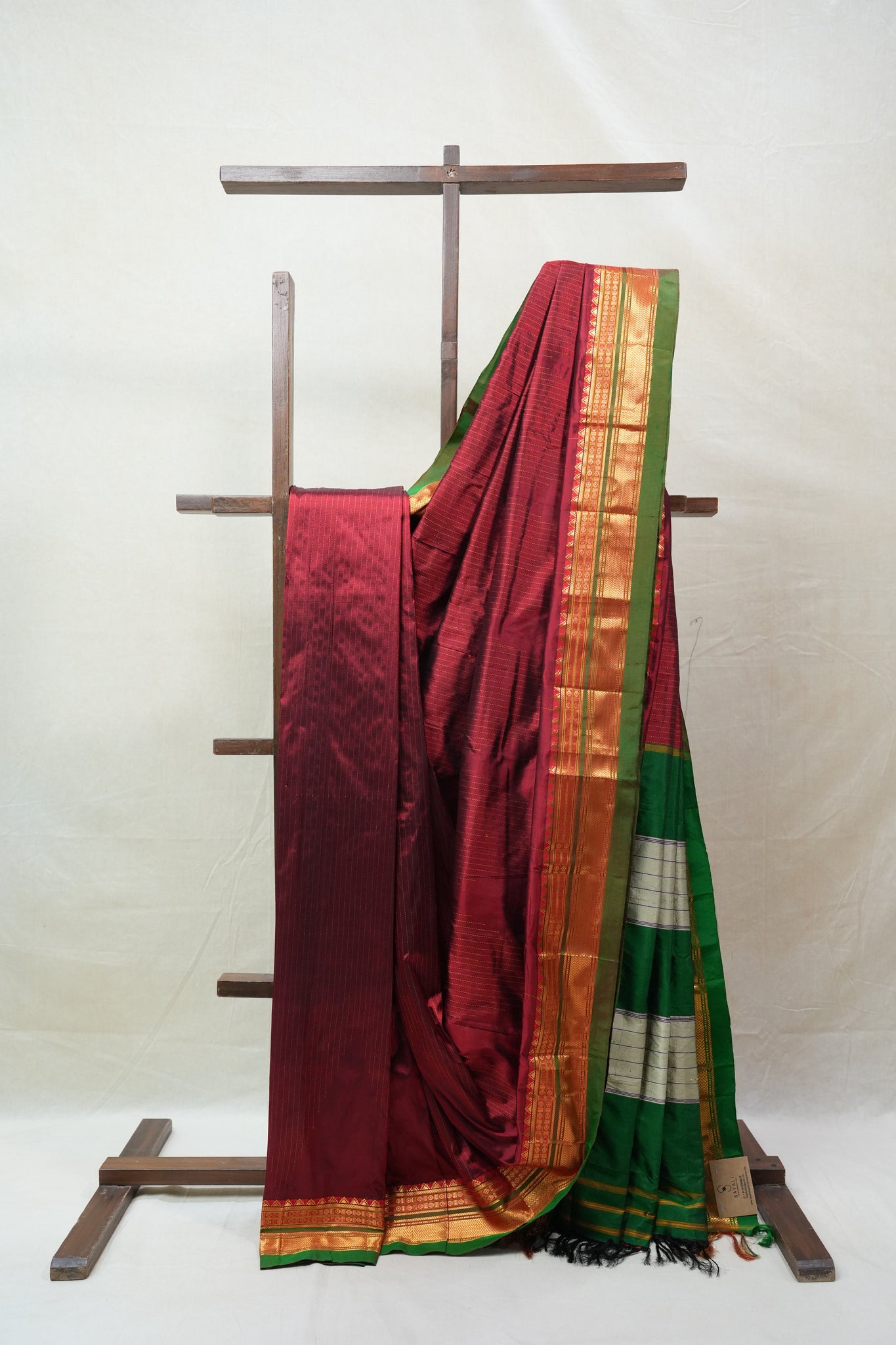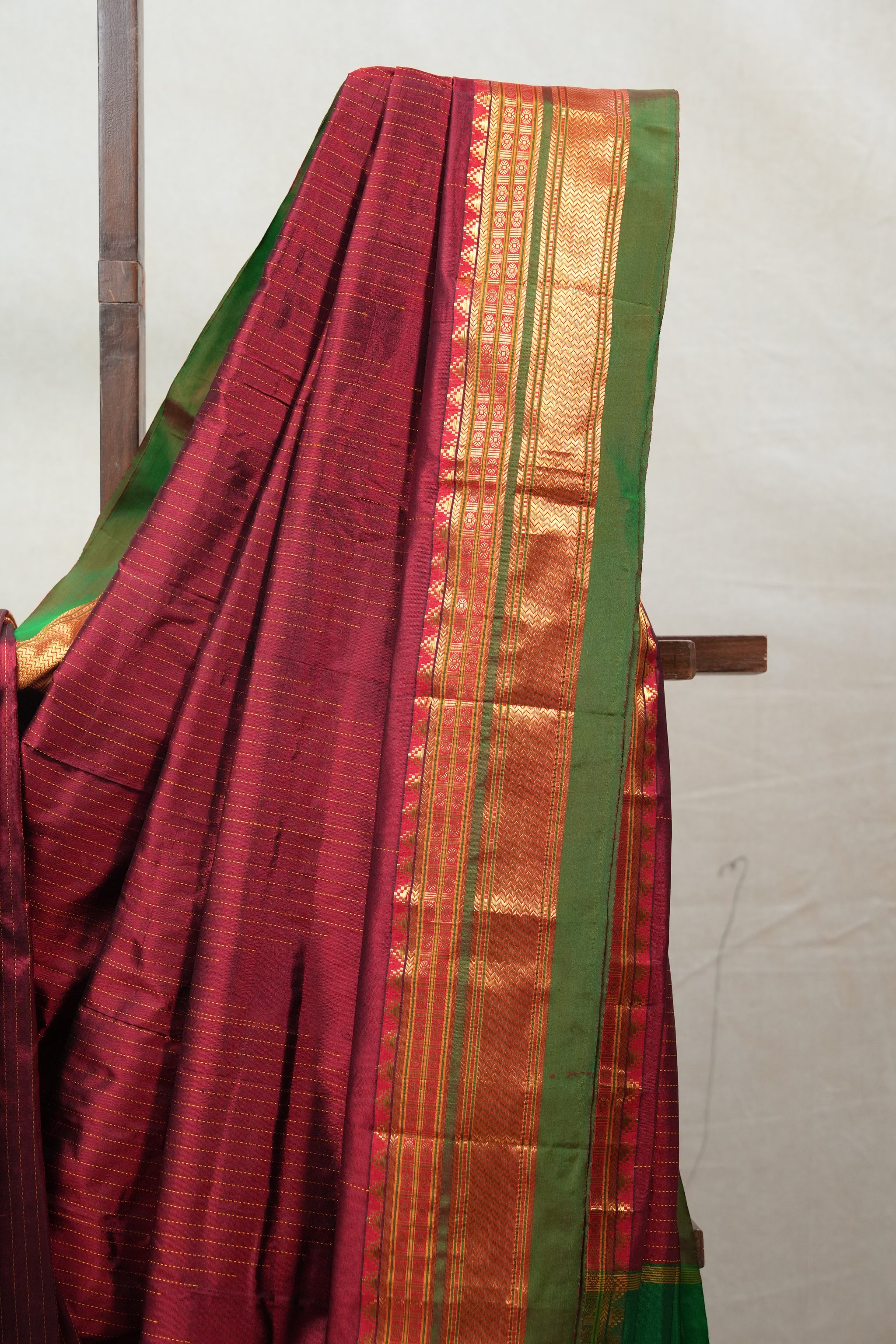 Work - Silk handloom weaving with golden zari, traditional Ilkal border, and Tope Teni pallu.