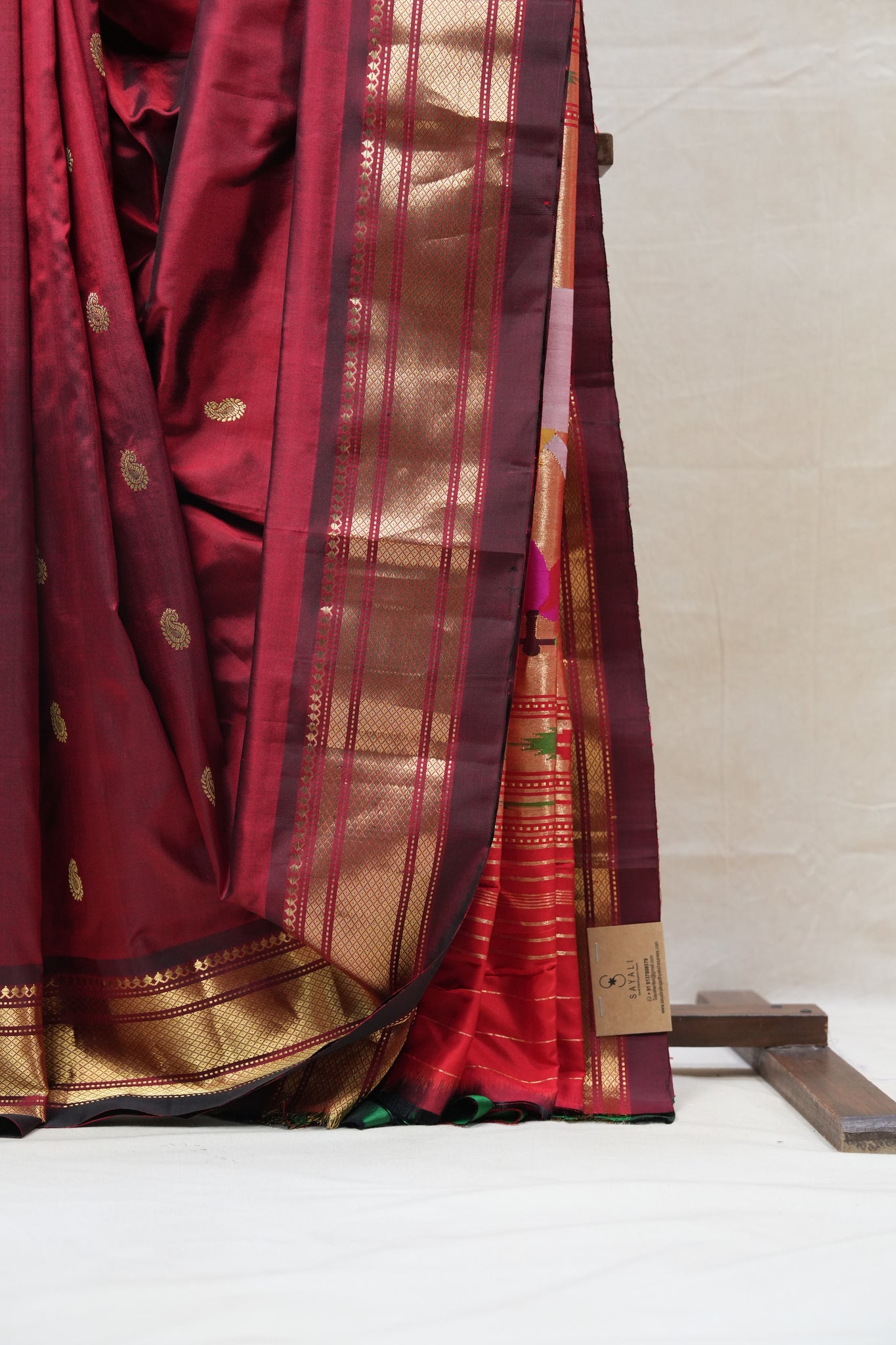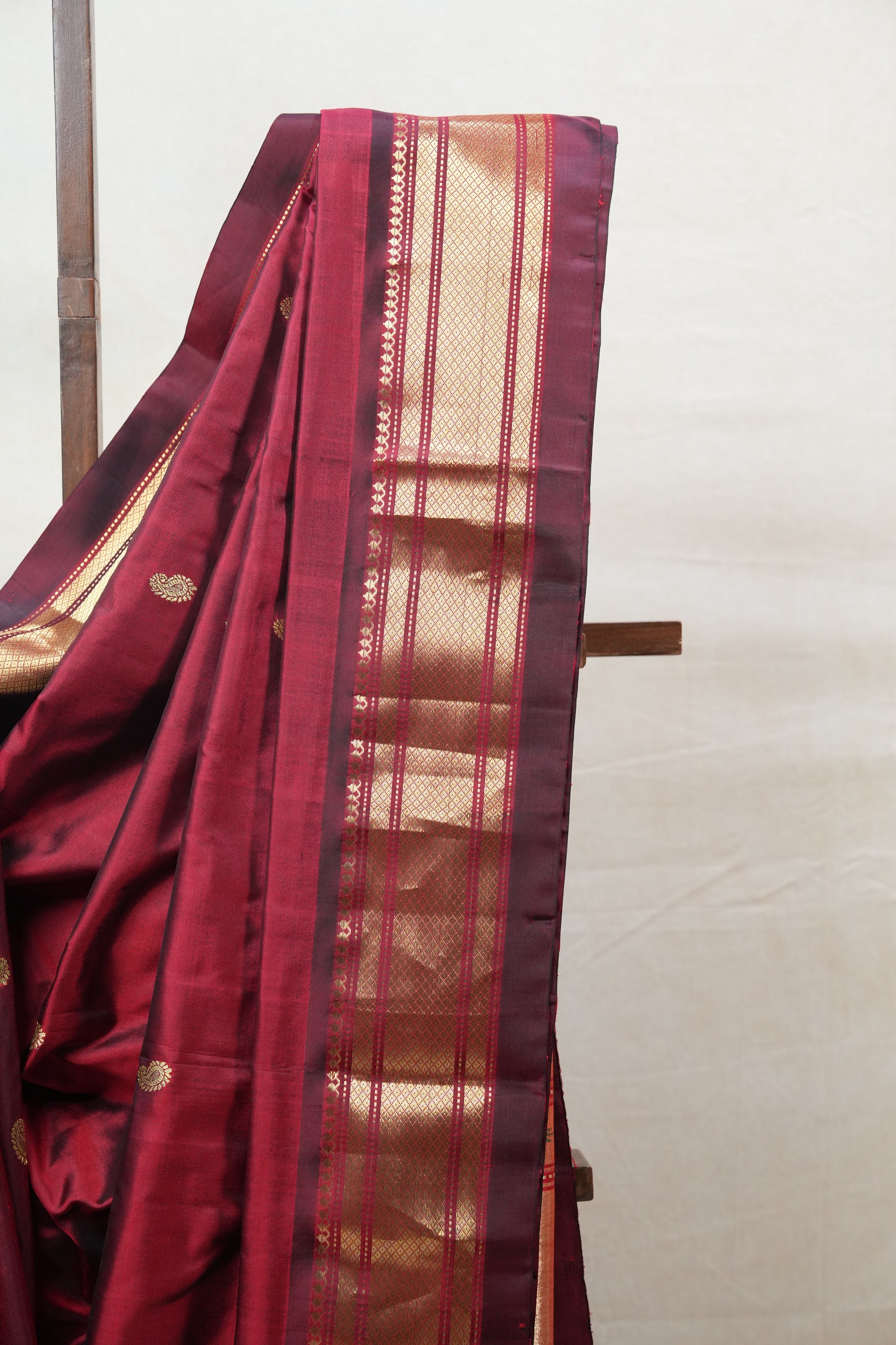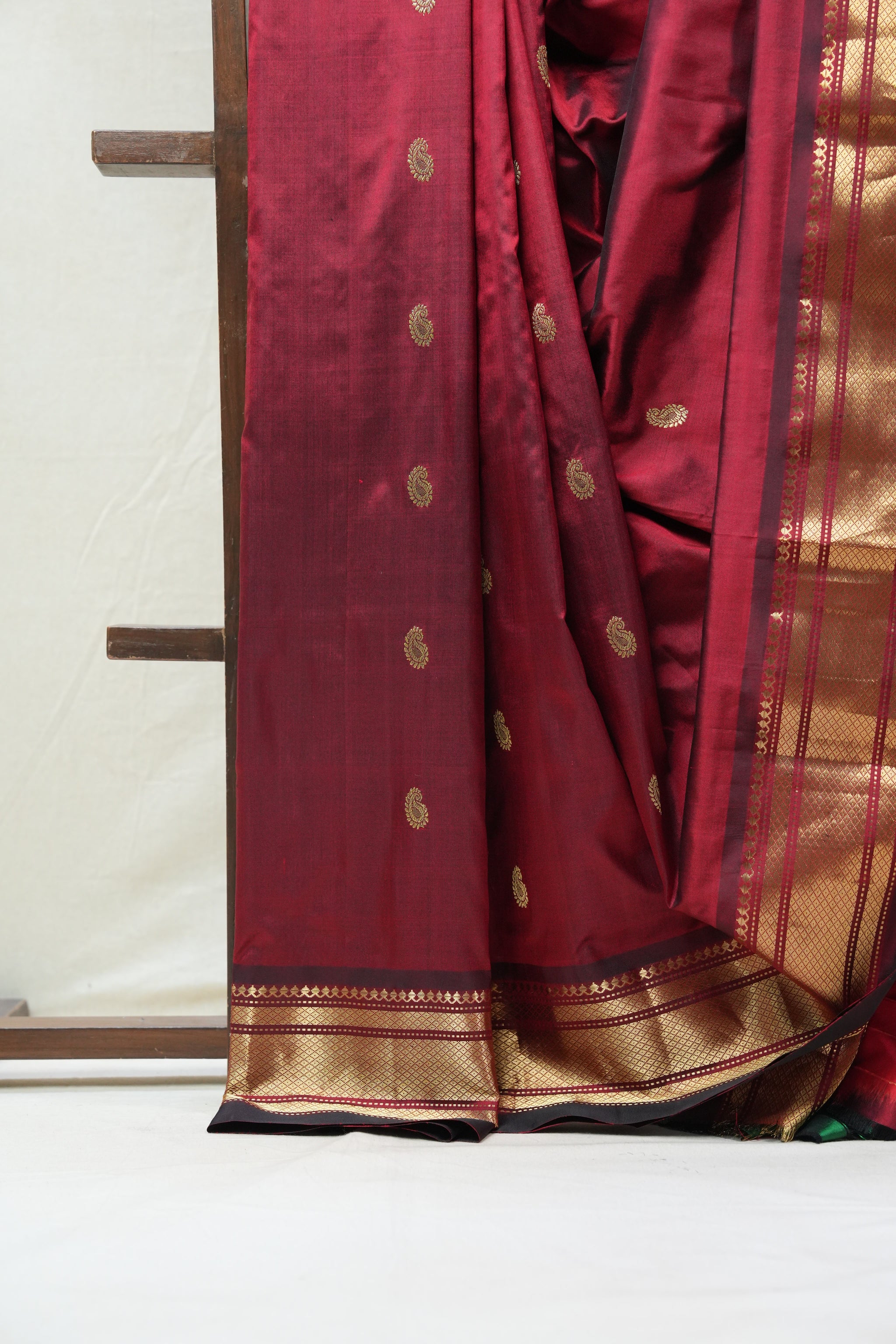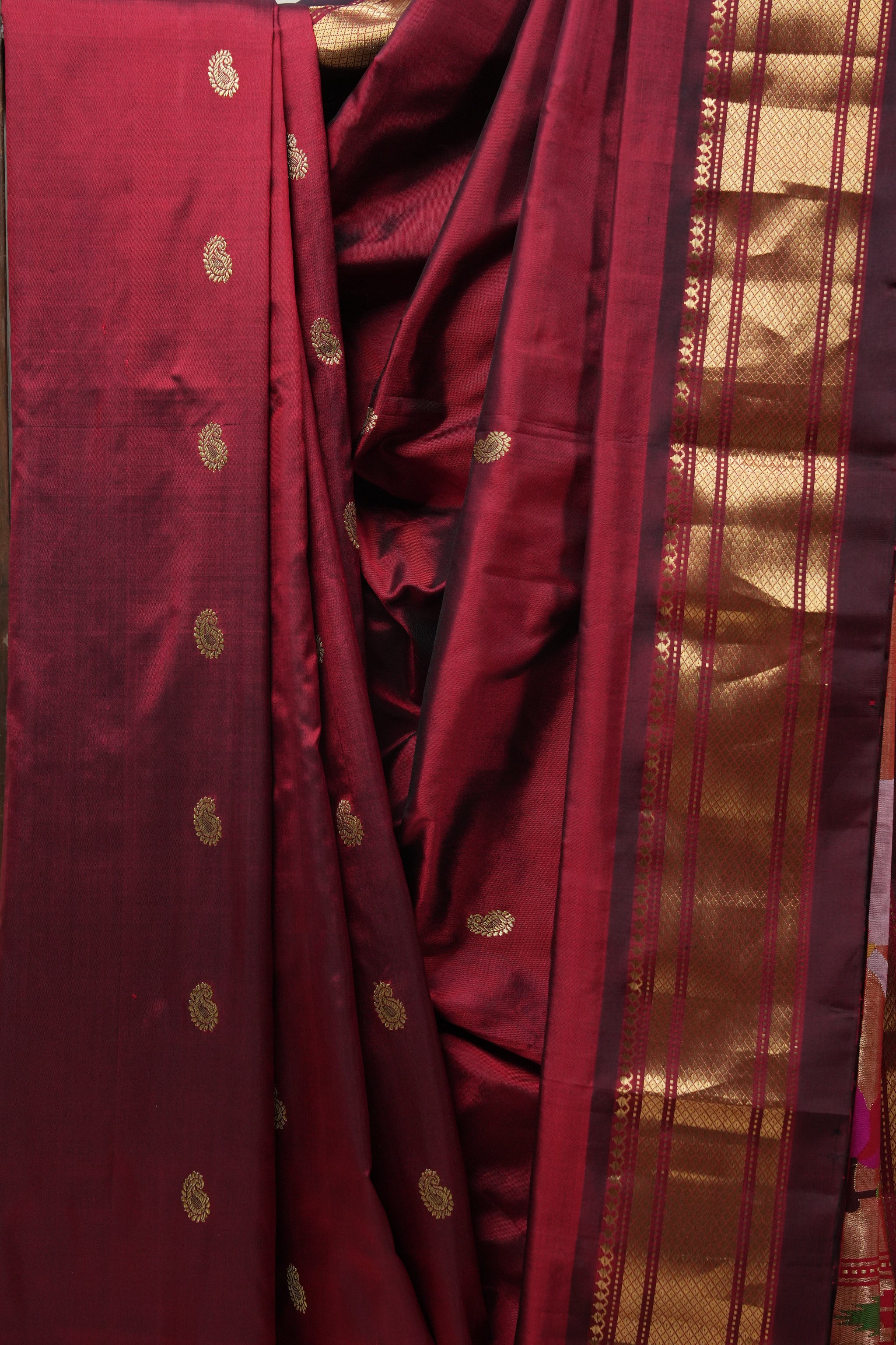 Work - The saree features small zari buttas (motifs) woven throughout the body, with a prominent and intricate golden zari border and fancy pallu.
