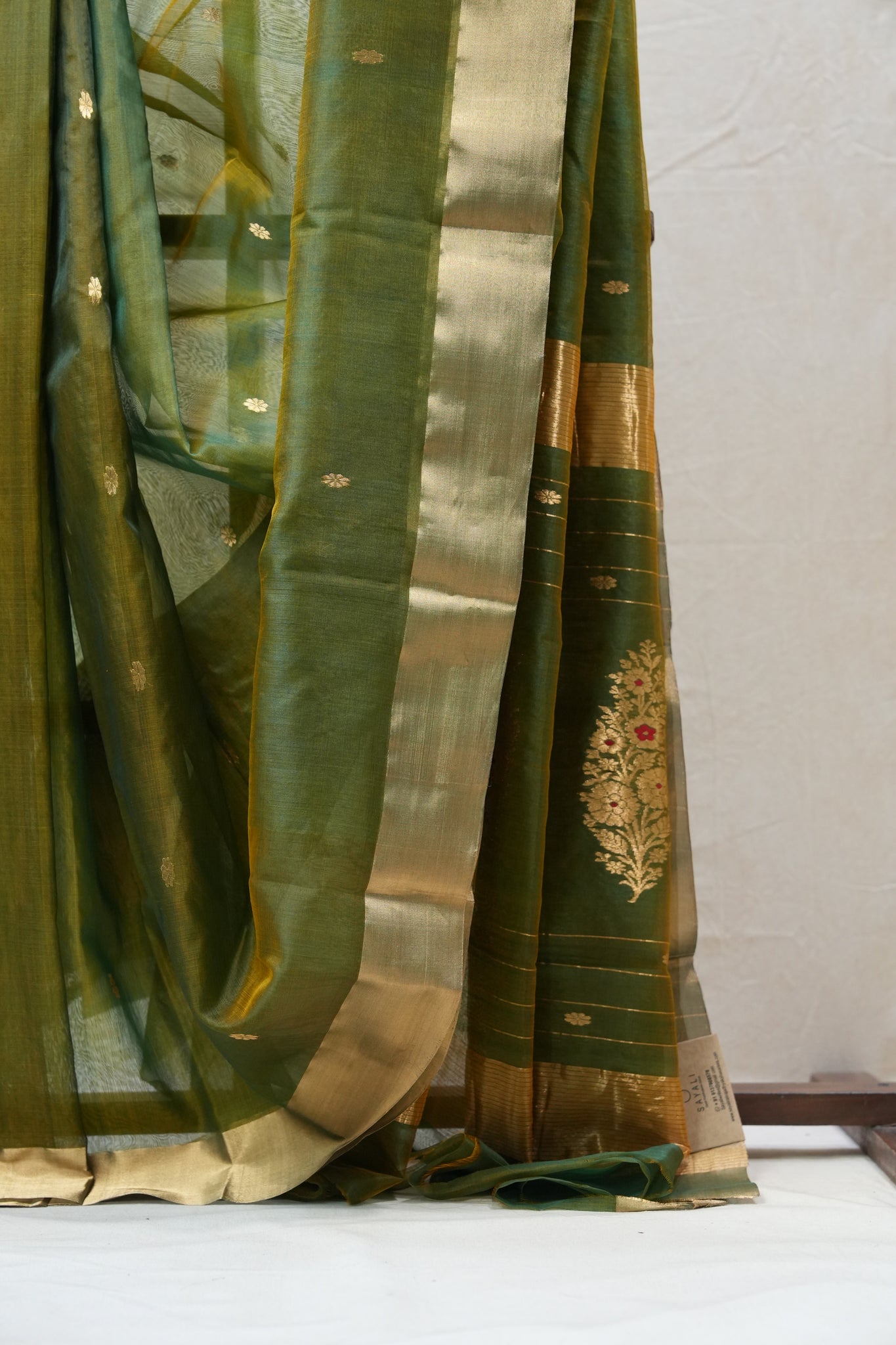 Work - Chanderi silk saree with olive green body, gold buti motifs, and elegant zari border.