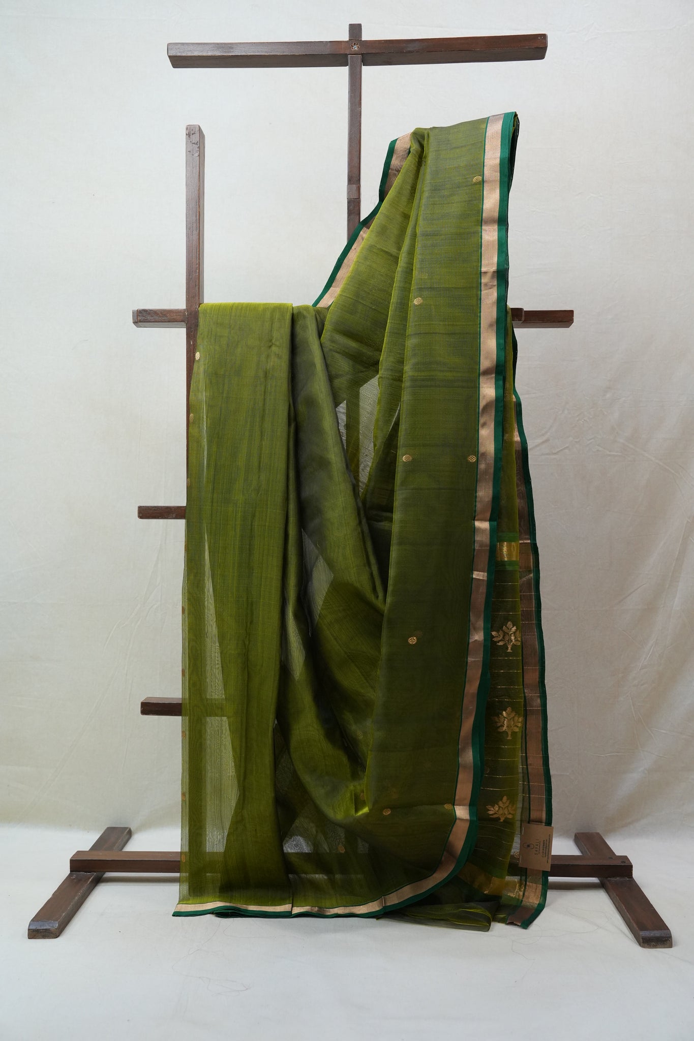 Work - Chanderi cotton silk saree with olive green body, gold buti motifs, and elegant zari border.