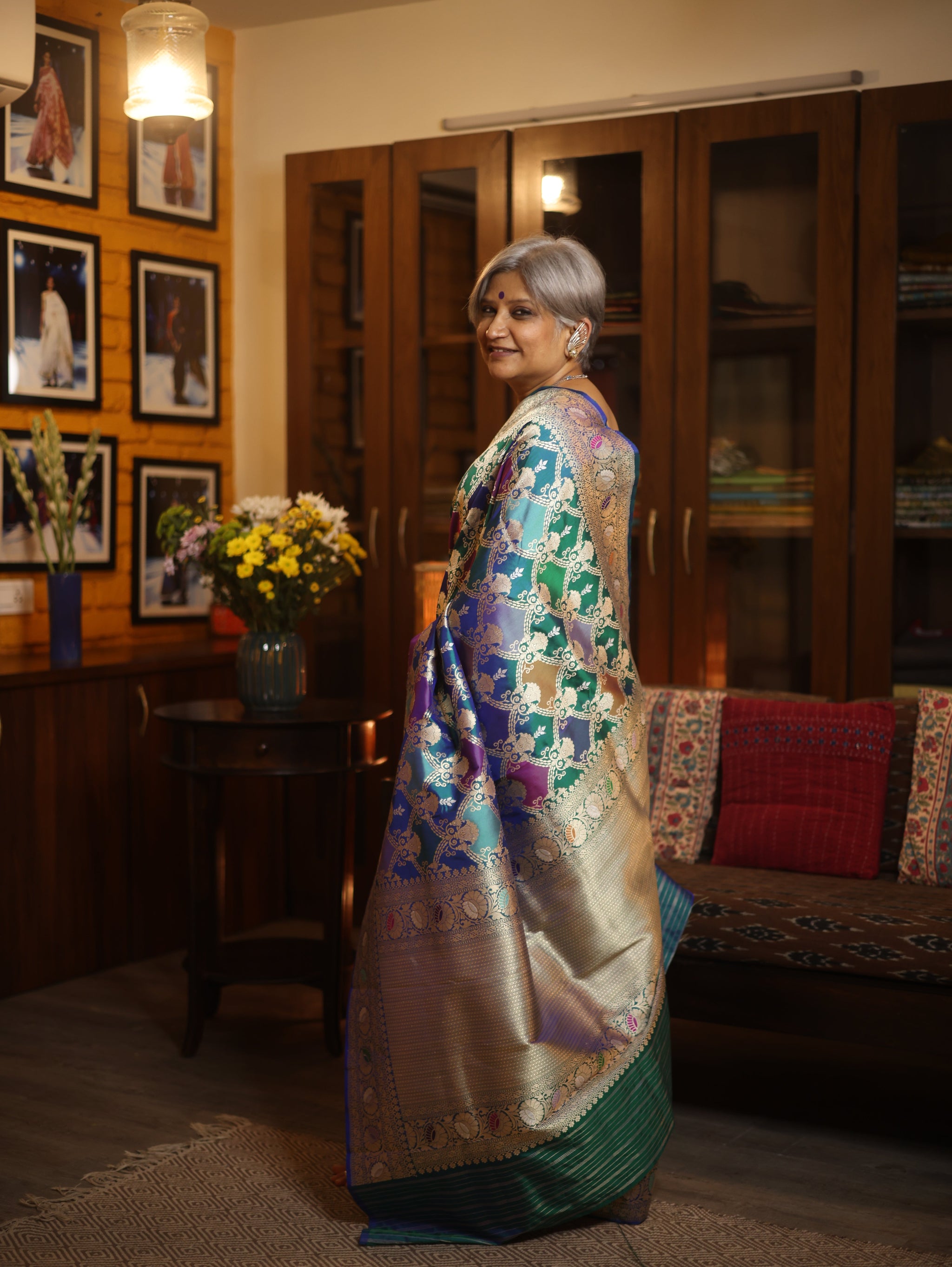Saree Color – Dual-shaded teal with purple hues and multicolored zari work