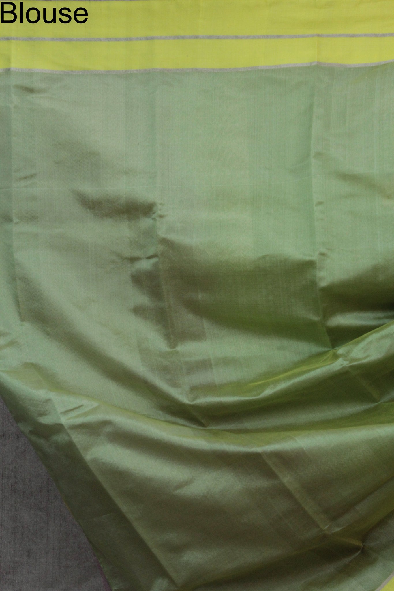 Work - Silver and gold zari leaf motifs with a lime yellow border and a two tone purple-accented silver pallu.