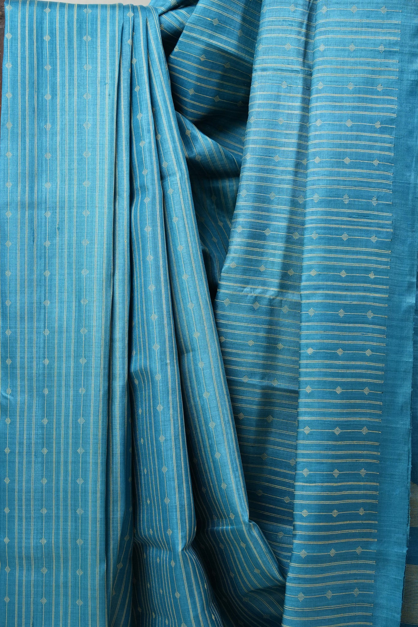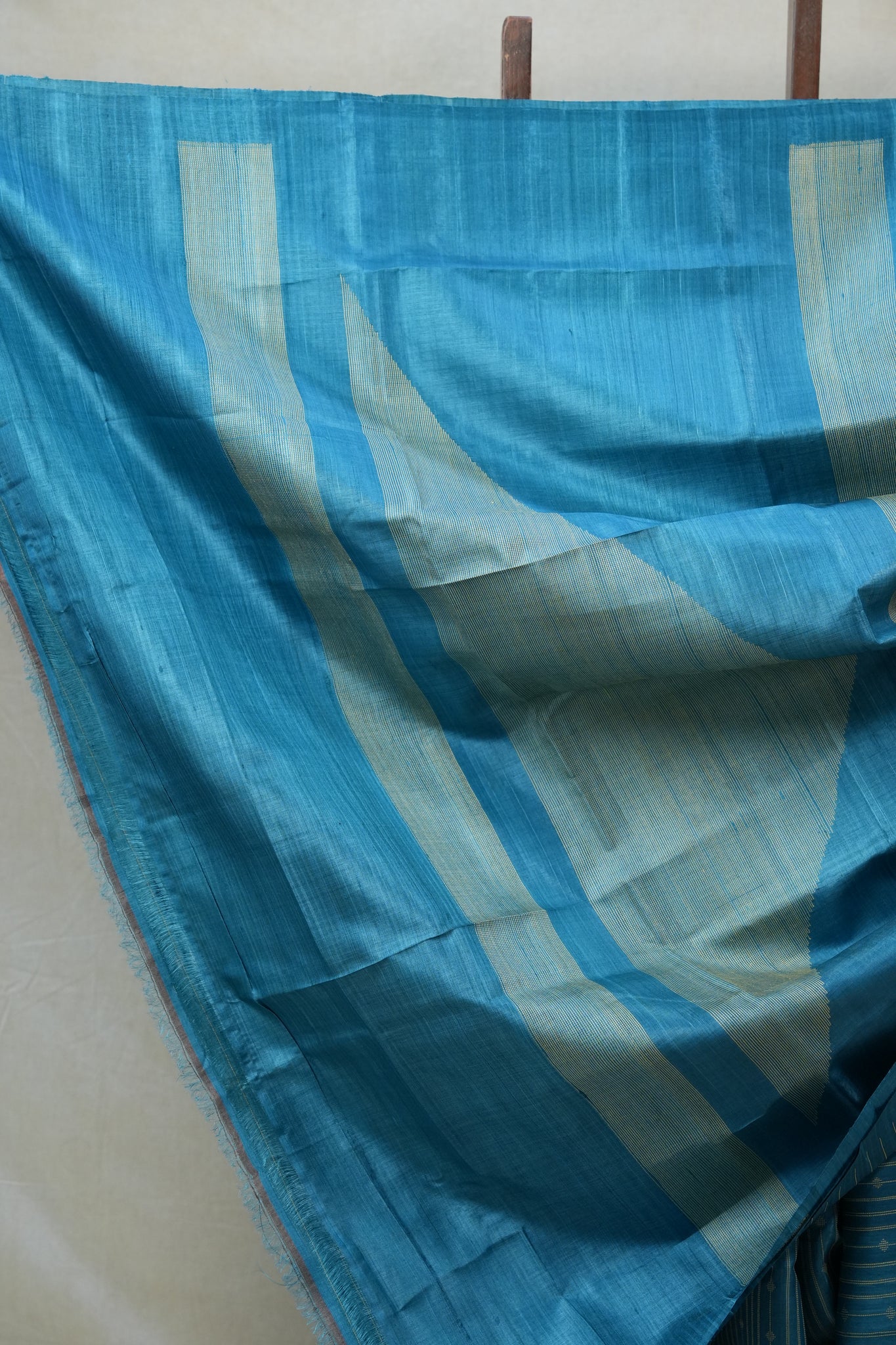 Work - Blue kosa Tussar silk with golden zari stripes, dotted motifs, and matching intricate border and pallu.