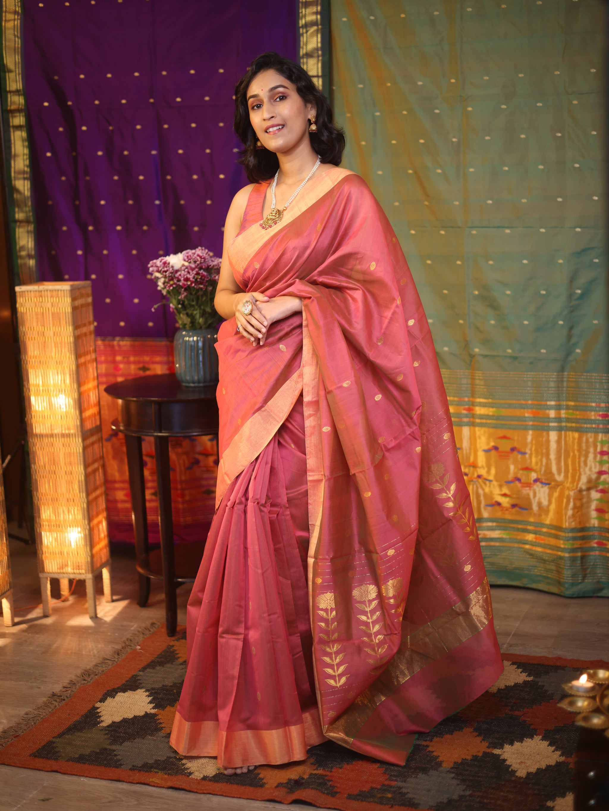 Work - Chanderi silk saree with two tone pink body, golden buti motifs, and elegant zari border.