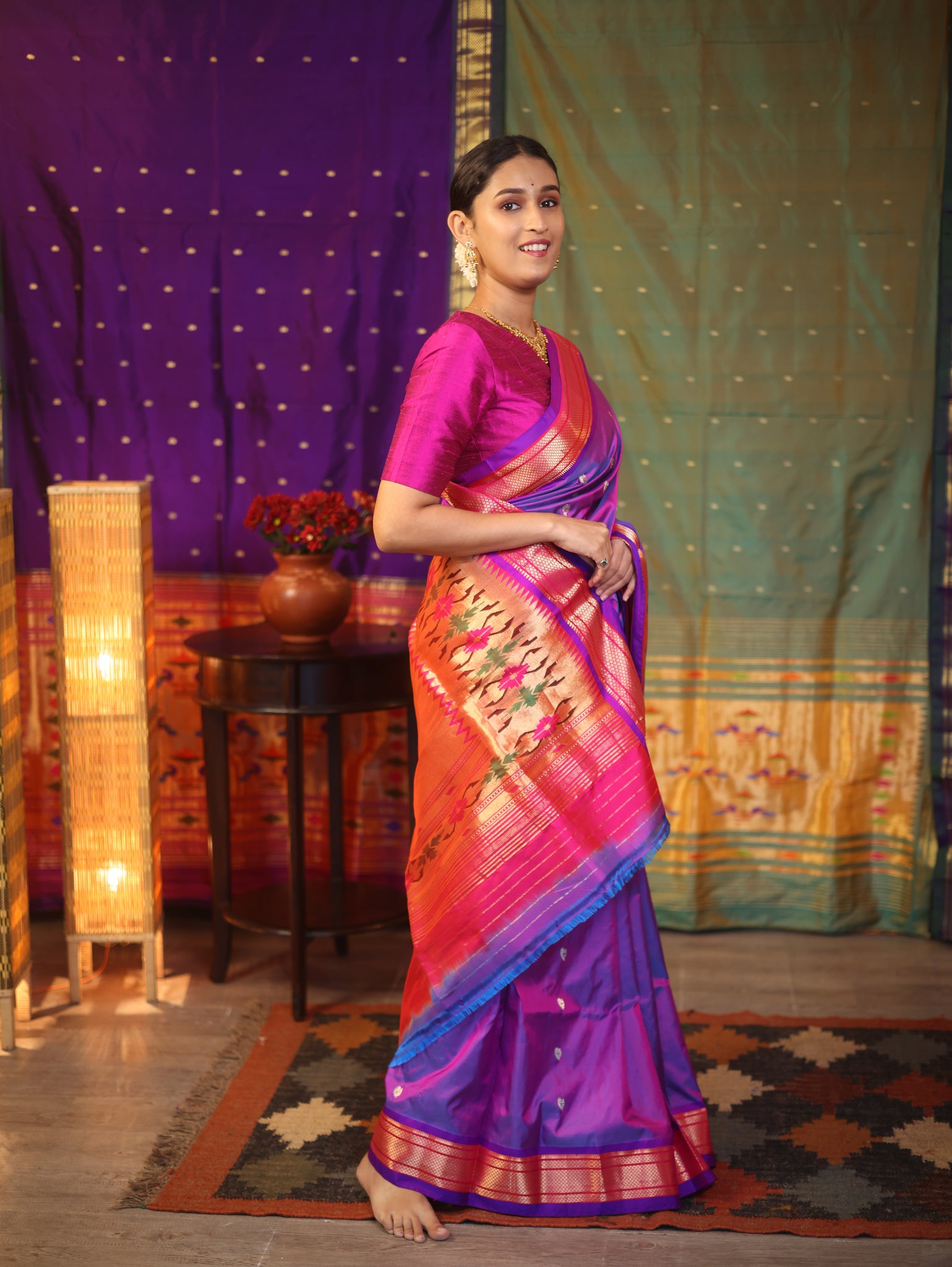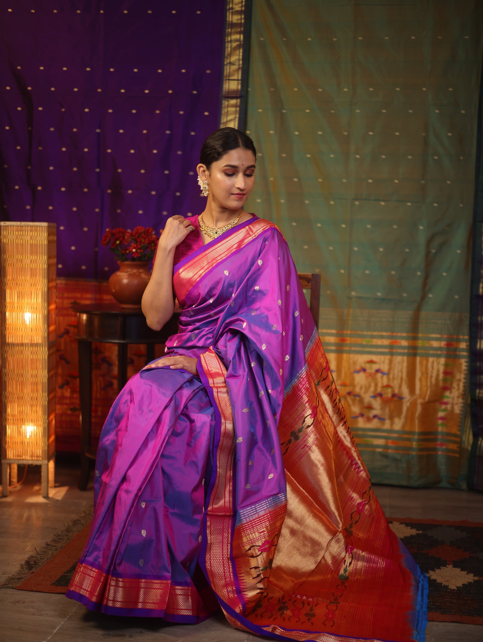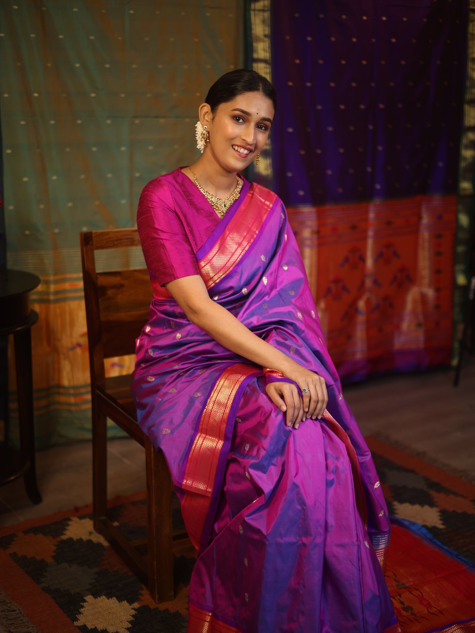 Work - Purple saree with golden zari border, small buttas on the body, and a rich woven pallu.