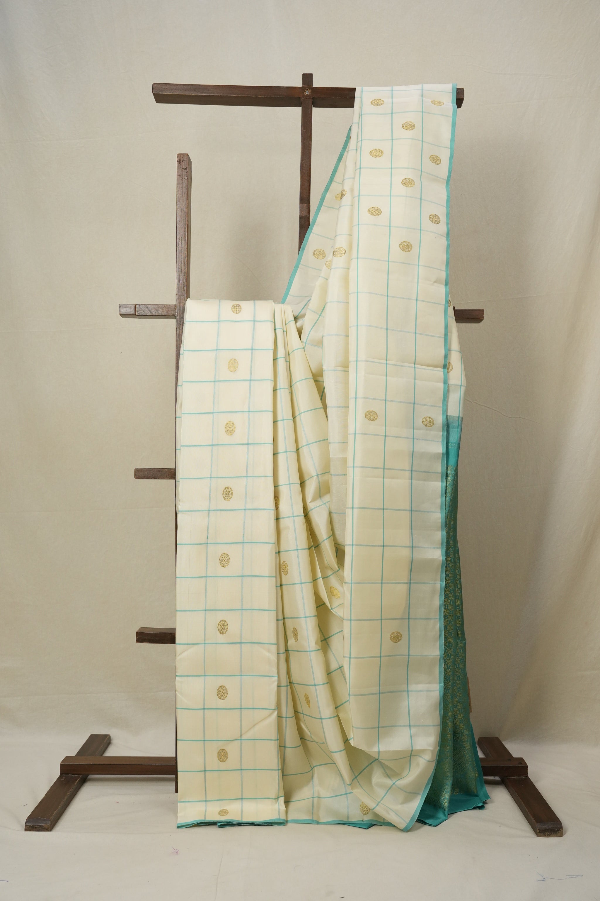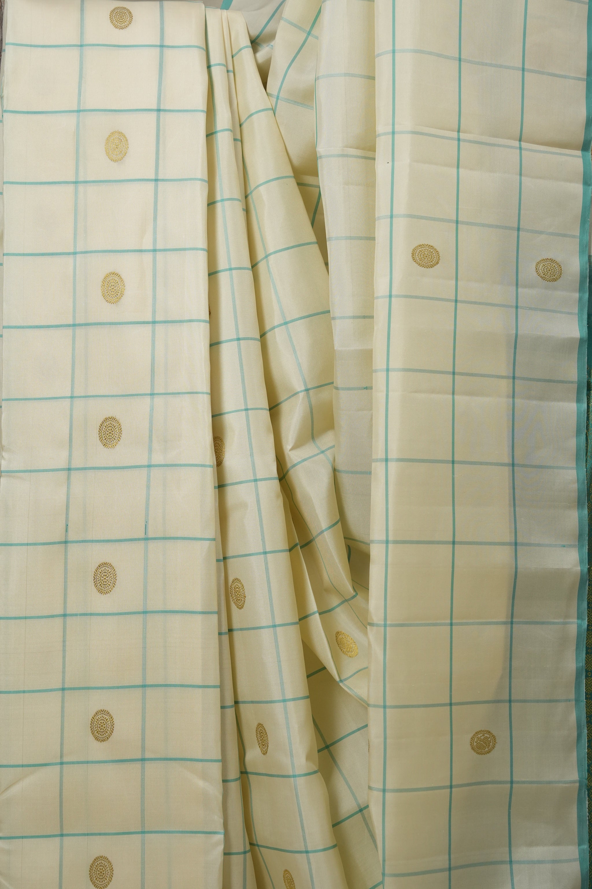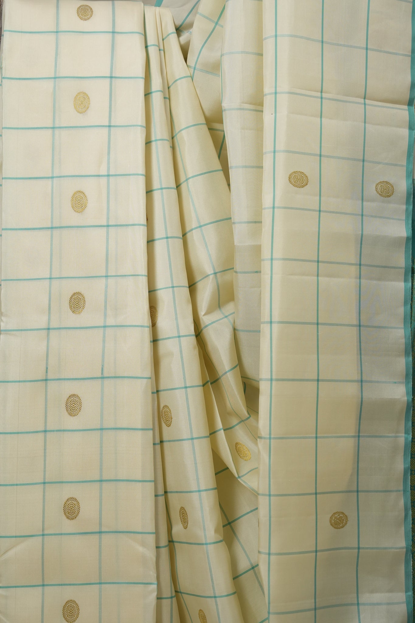Work - The Kanjivaram saree shown features a check pattern with gold zari circular motifs woven into the body and is accentuated by a bright turquoise border and pallu.
