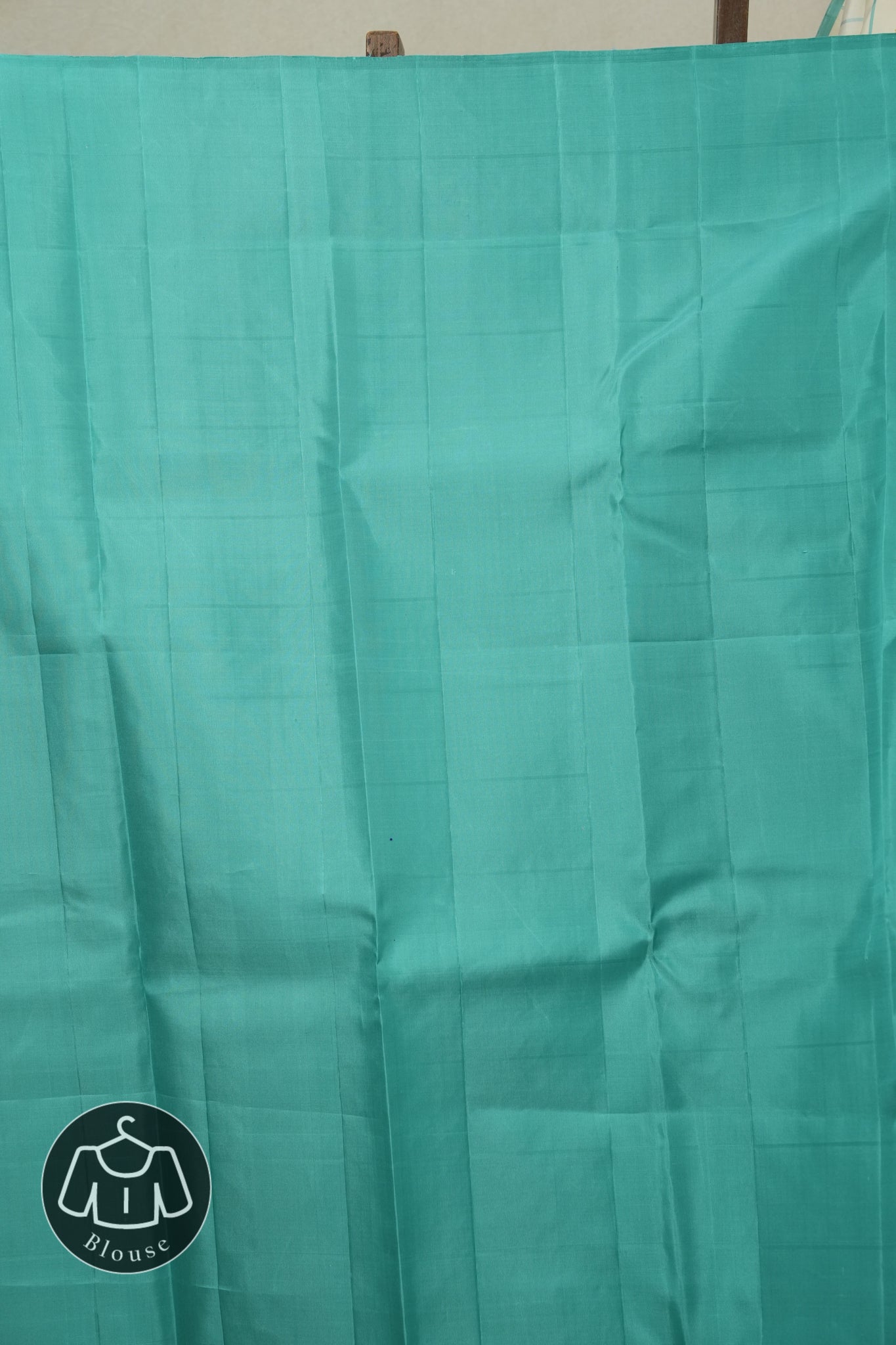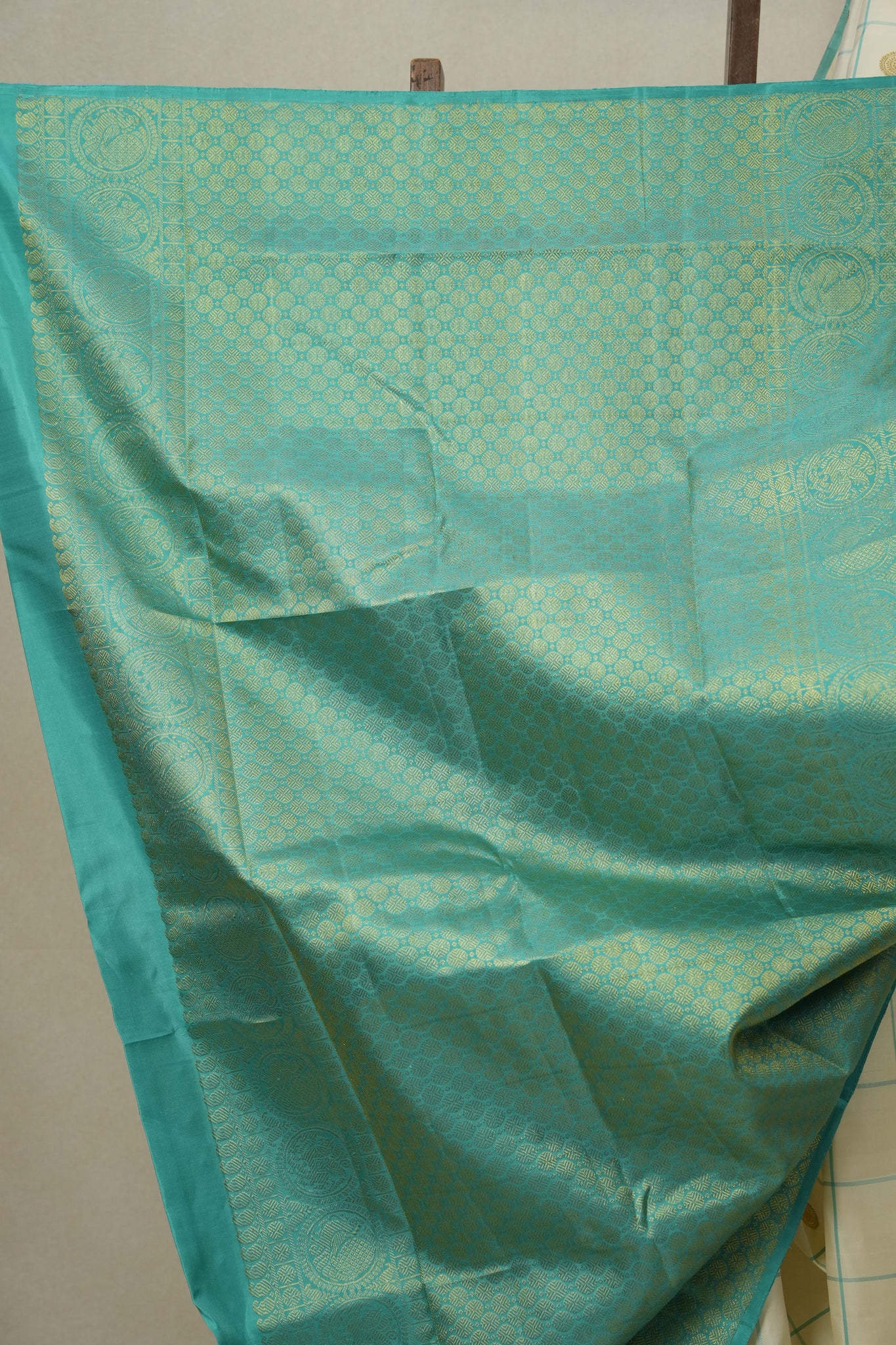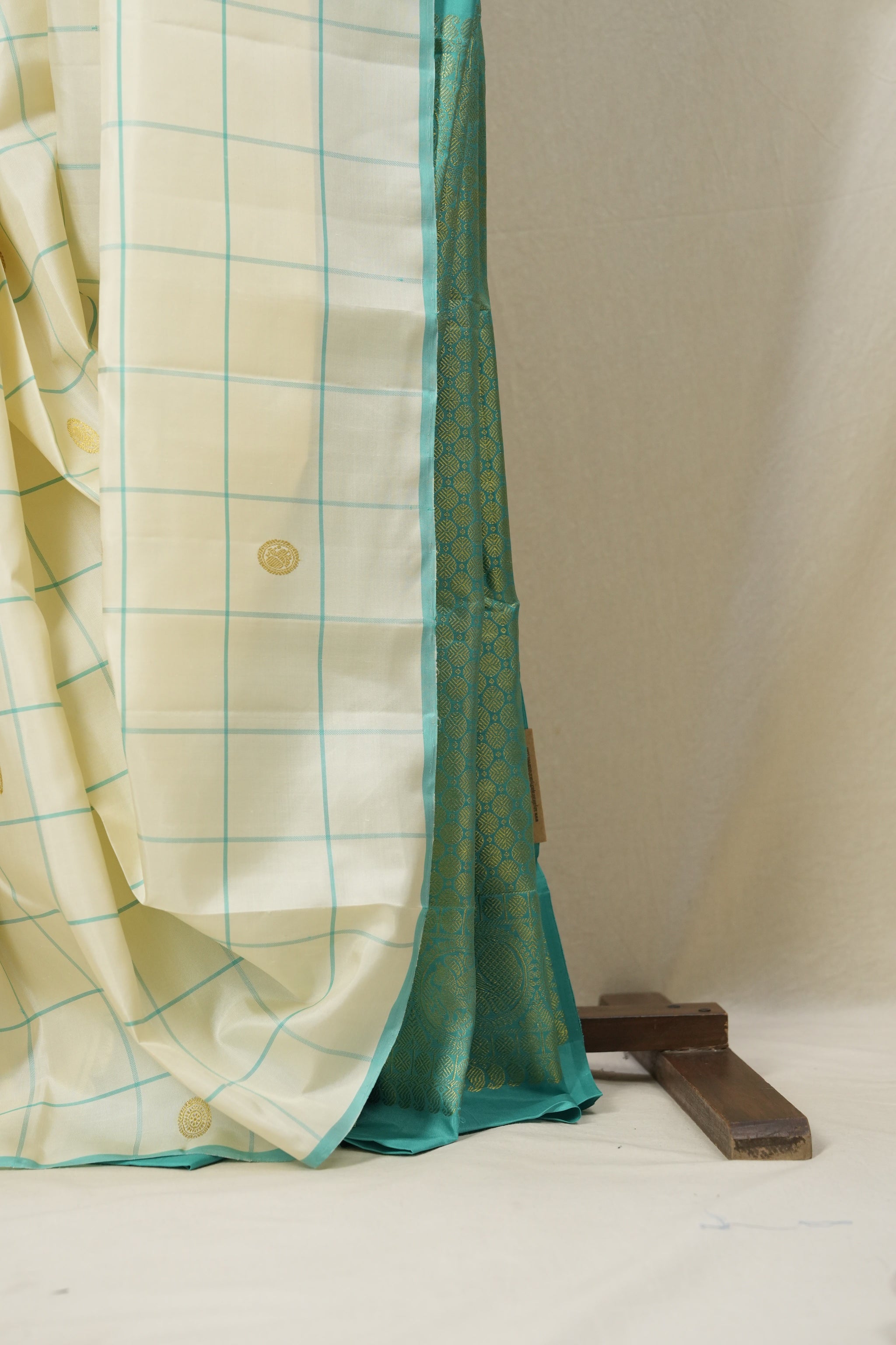 Work - The Kanjivaram saree shown features a check pattern with gold zari circular motifs woven into the body and is accentuated by a bright turquoise border and pallu.