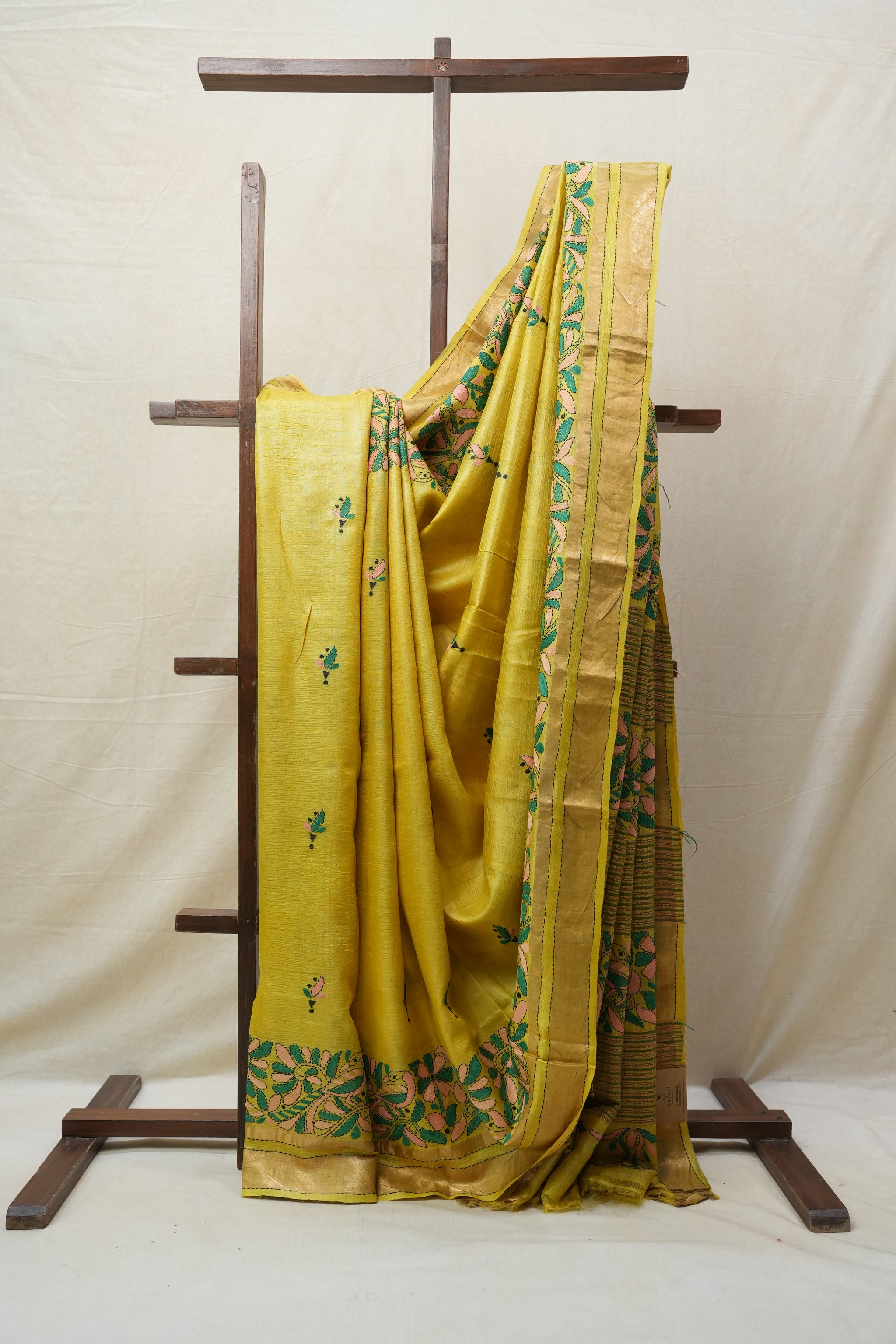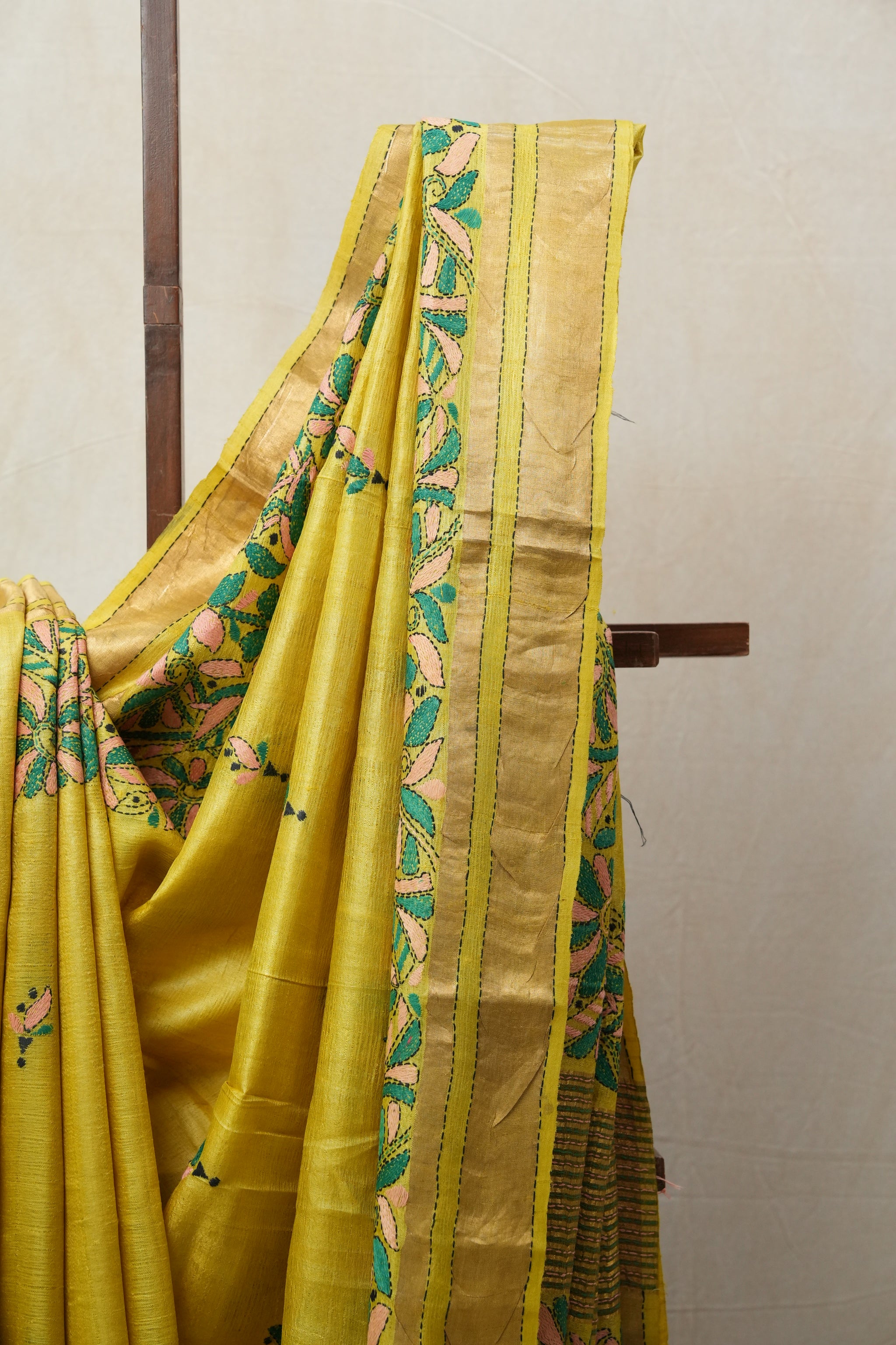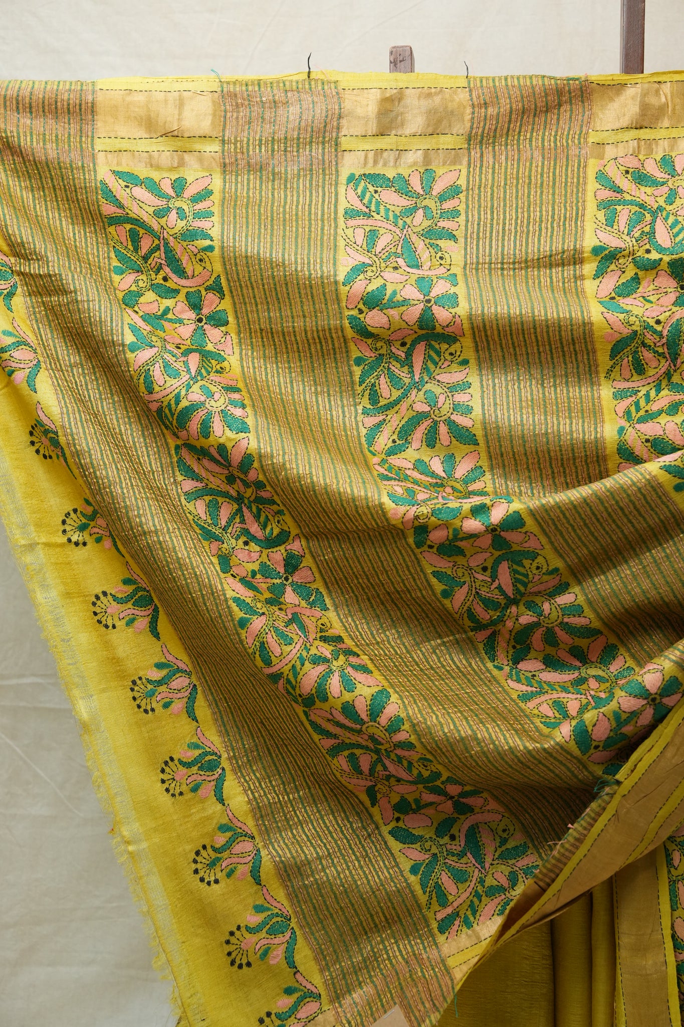 Work - This kantha tussar saree features intricate hand-embroidered kantha work with vibrant floral and paisley motifs.