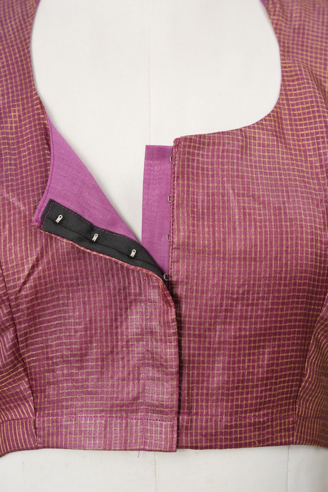Wine tissue tussar silk checks blouse with a princess-cut fit, round-neck collar detail. Front hook opening, cotton lining, no pads, and 2-inch margin for adjustments—elegant finish ideal for silk and fancy sarees.