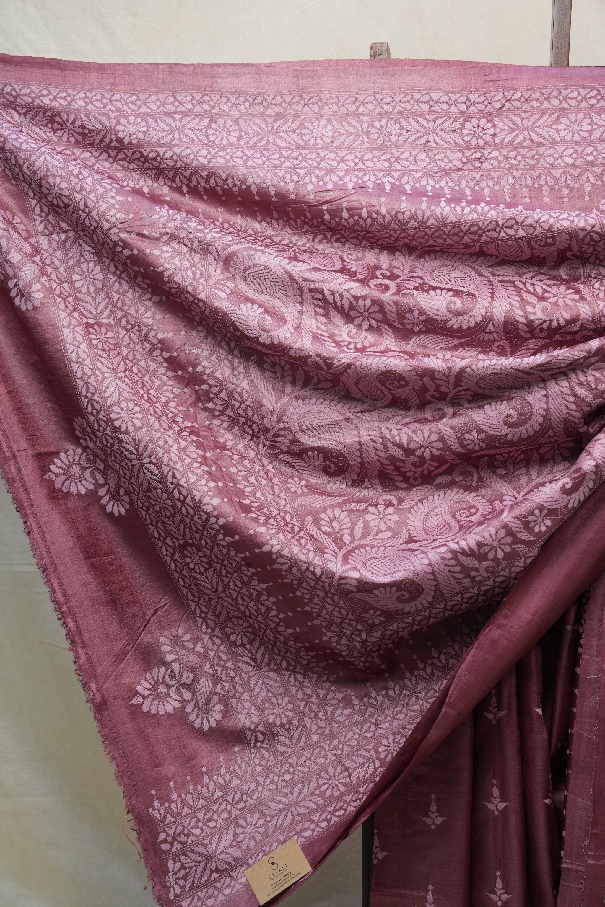 Work - This kantha tussar saree features intricate hand-embroidered kantha work with vibrant floral and paisley motifs.