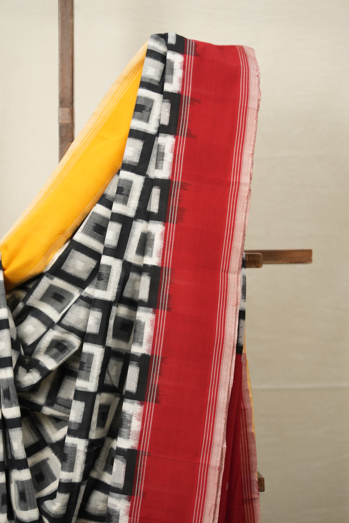 Work - This is a Pochampalli Cotton Ikat saree with Maroon Yellow color body, complemented by an ikat patterned border and pallu.