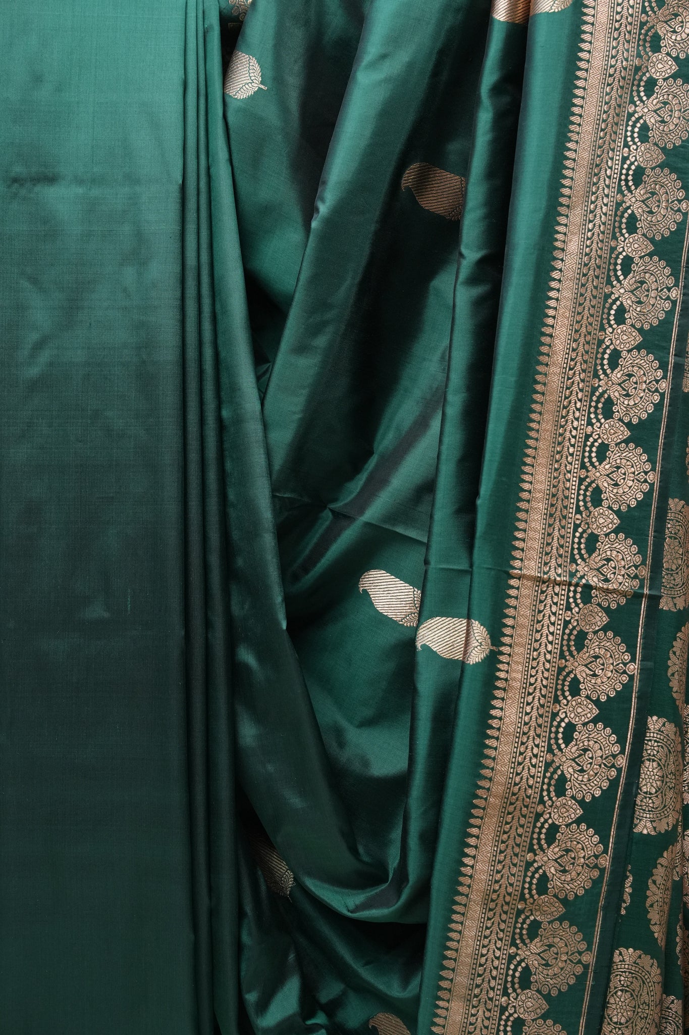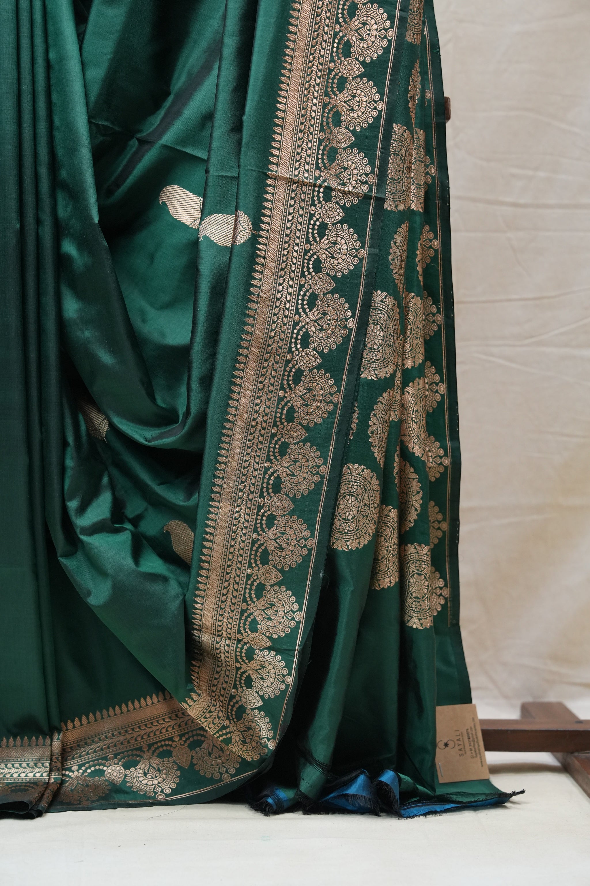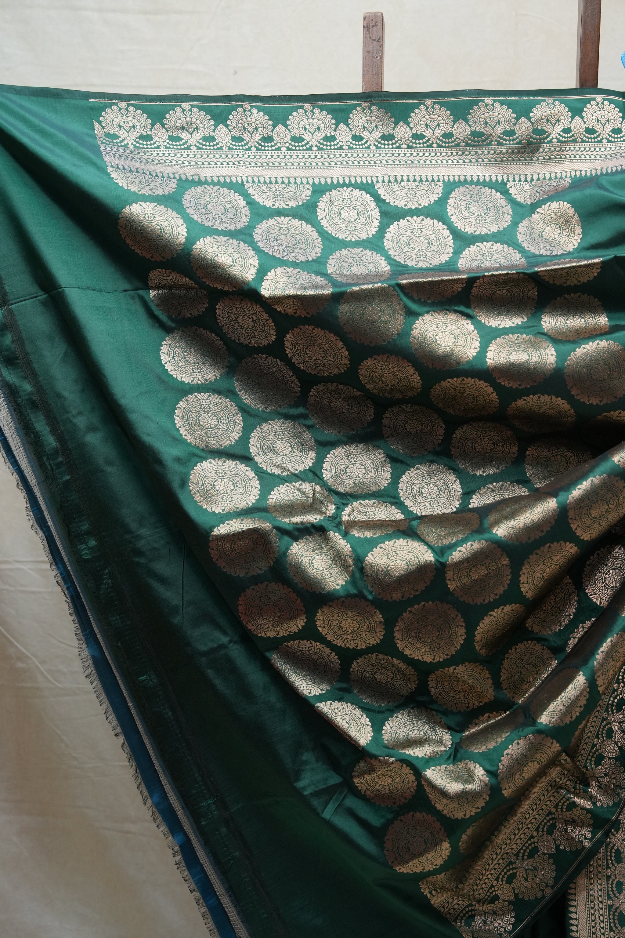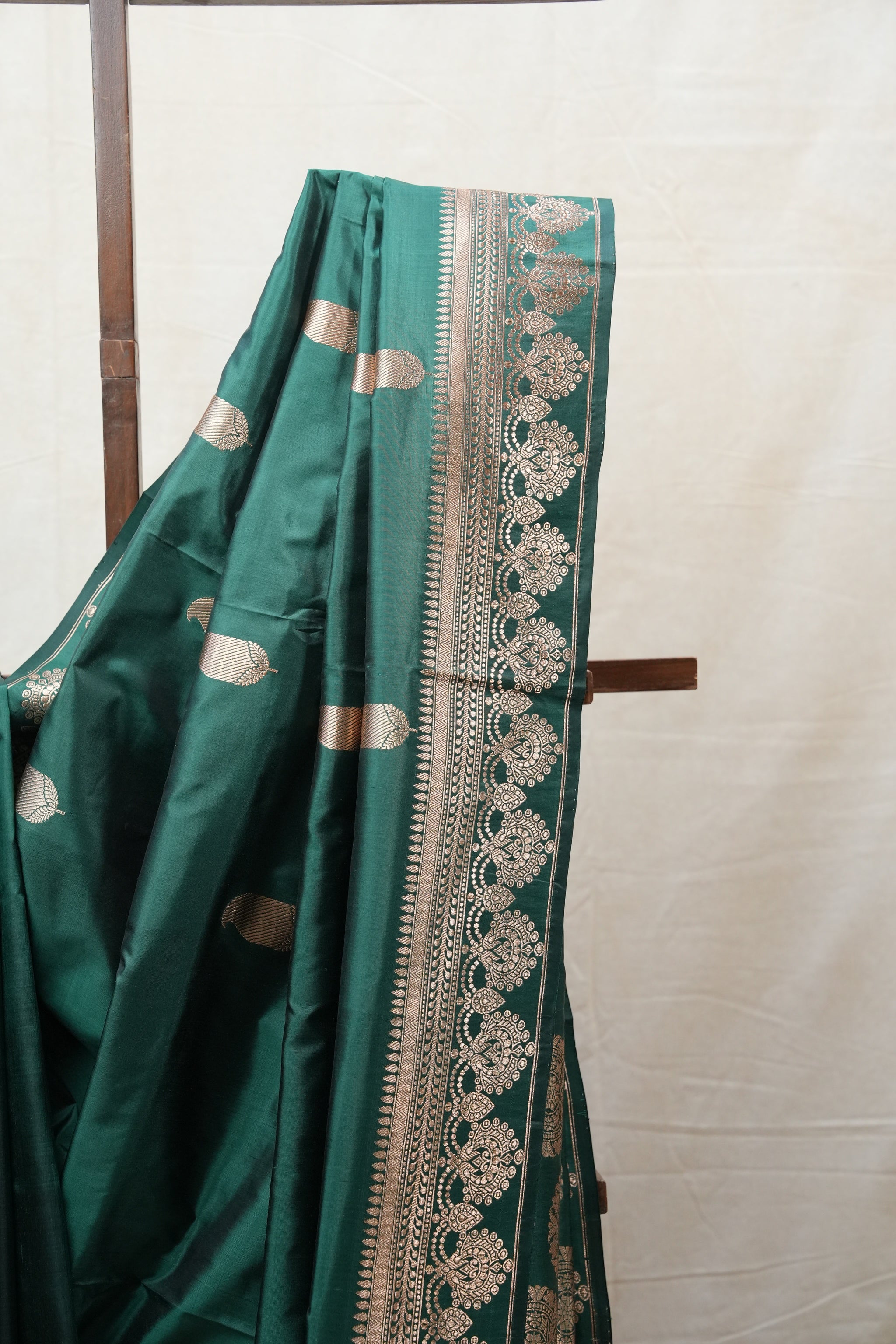 Work - This is a banarasi silk saree in a green base, featuring small buti motifs woven across the body and a rich red zari floral border and pallu with intricate traditional designs.