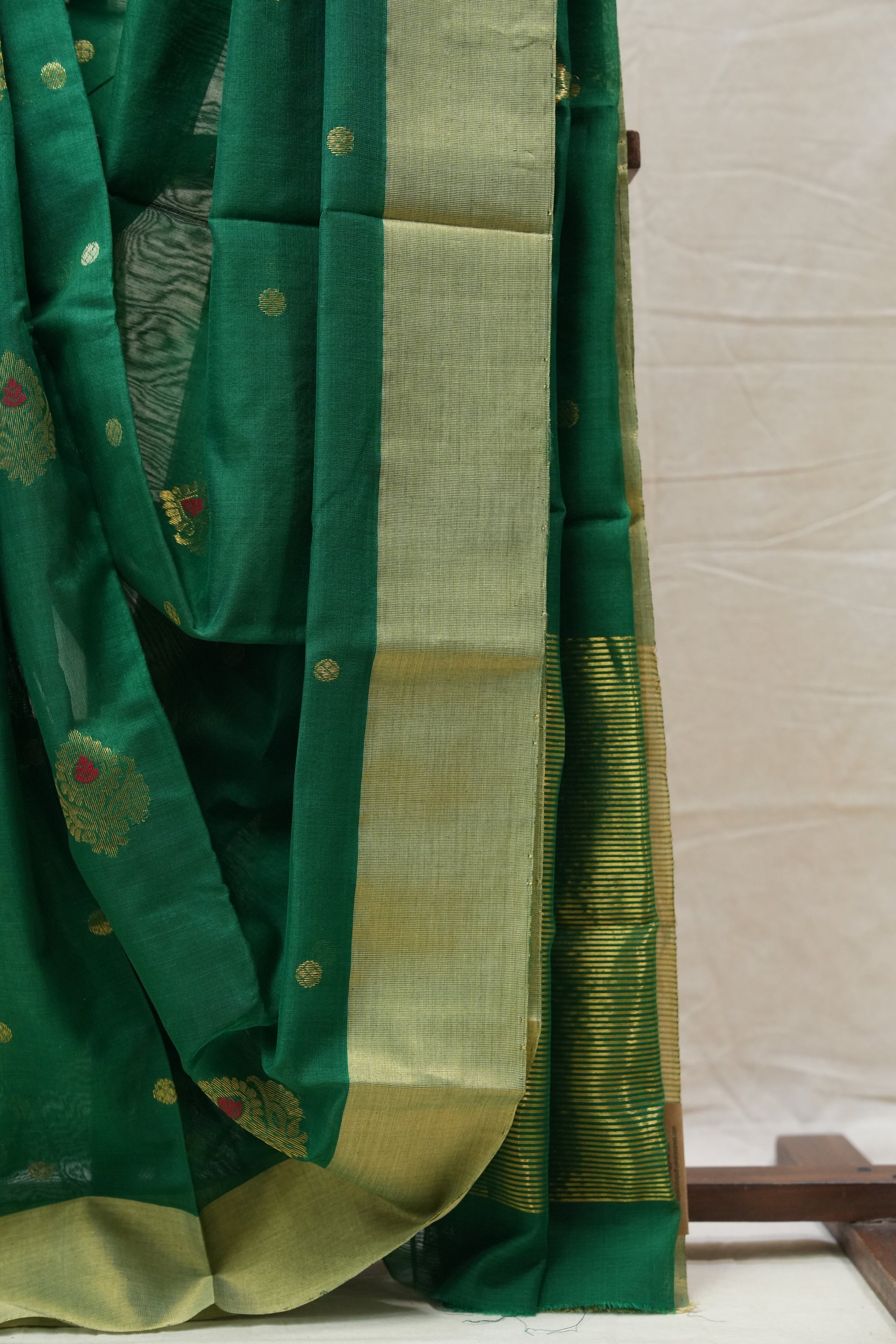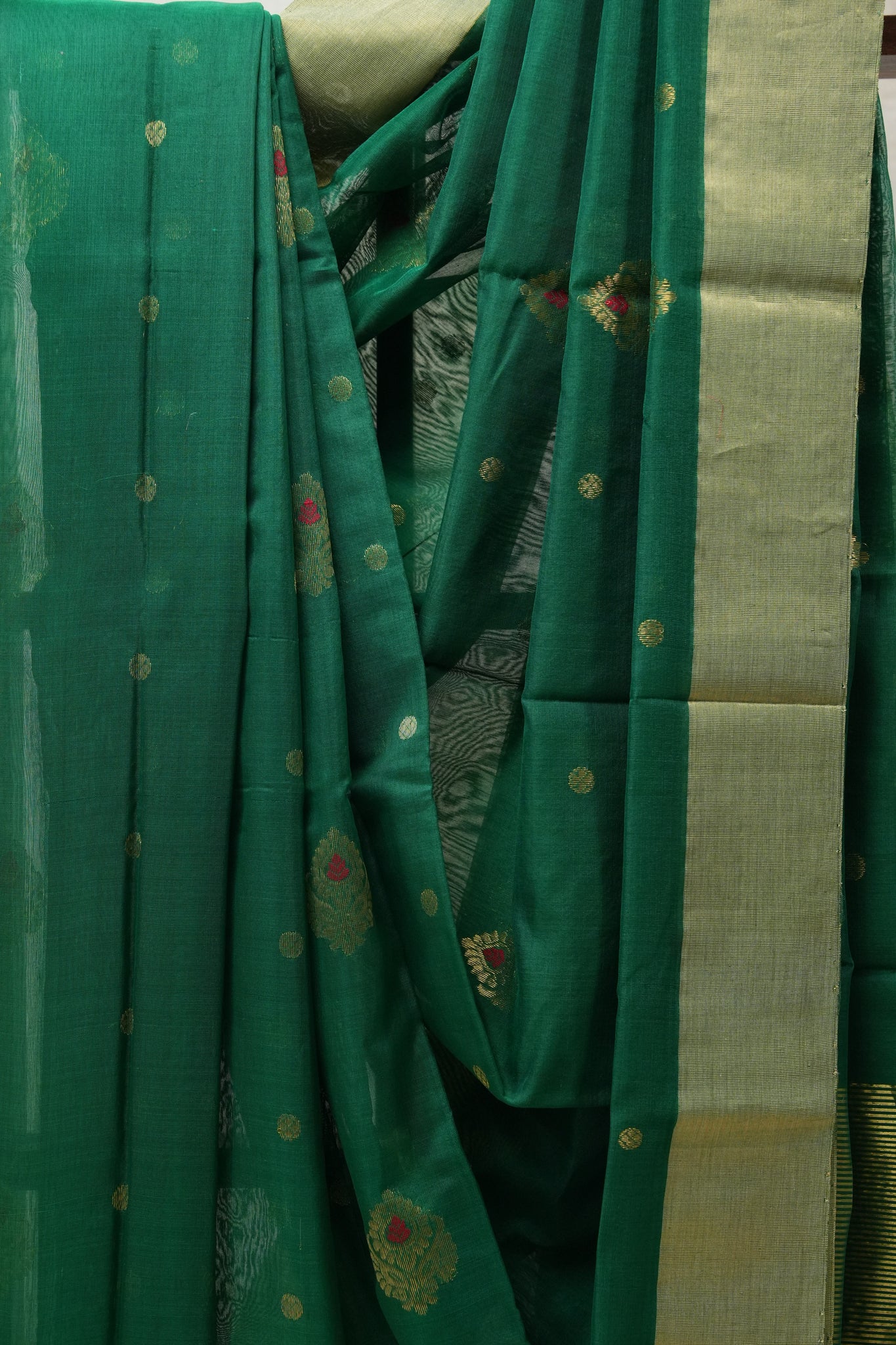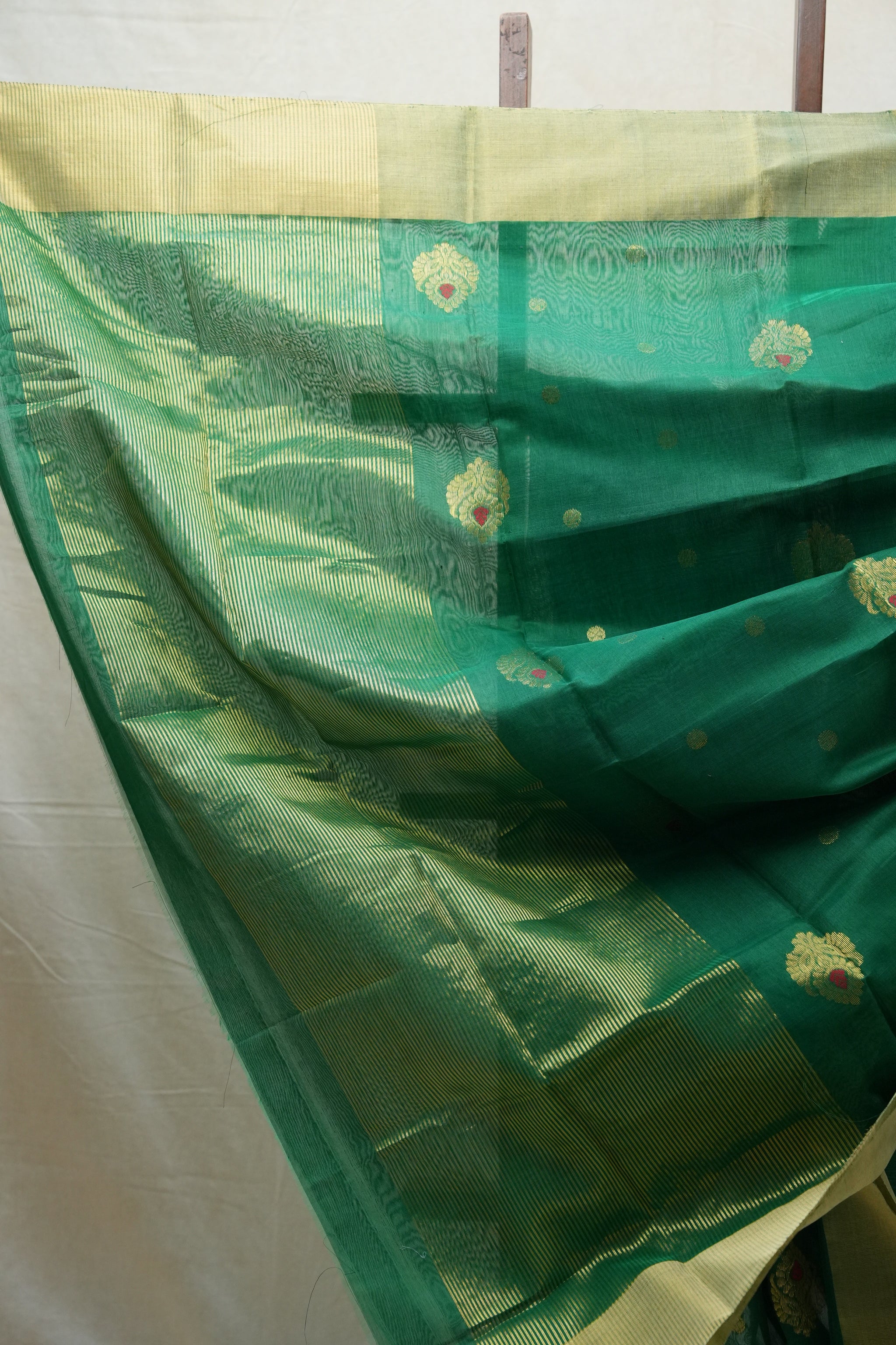 Work - Chanderi cotton silk saree with green body, gold buti motifs, and elegant zari border.