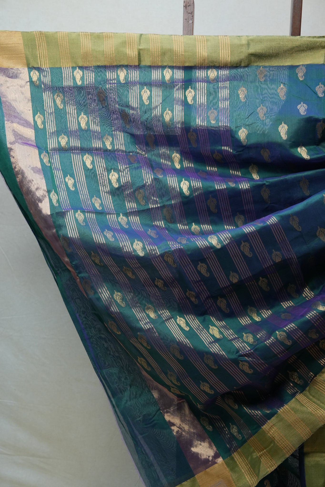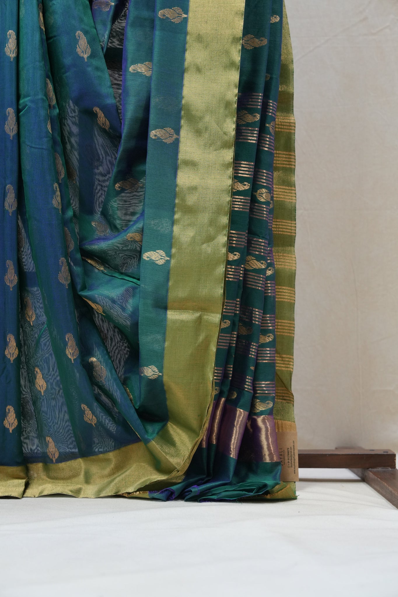 Work - Chanderi cotton silk saree with green body, gold buti motifs, and elegant zari border.