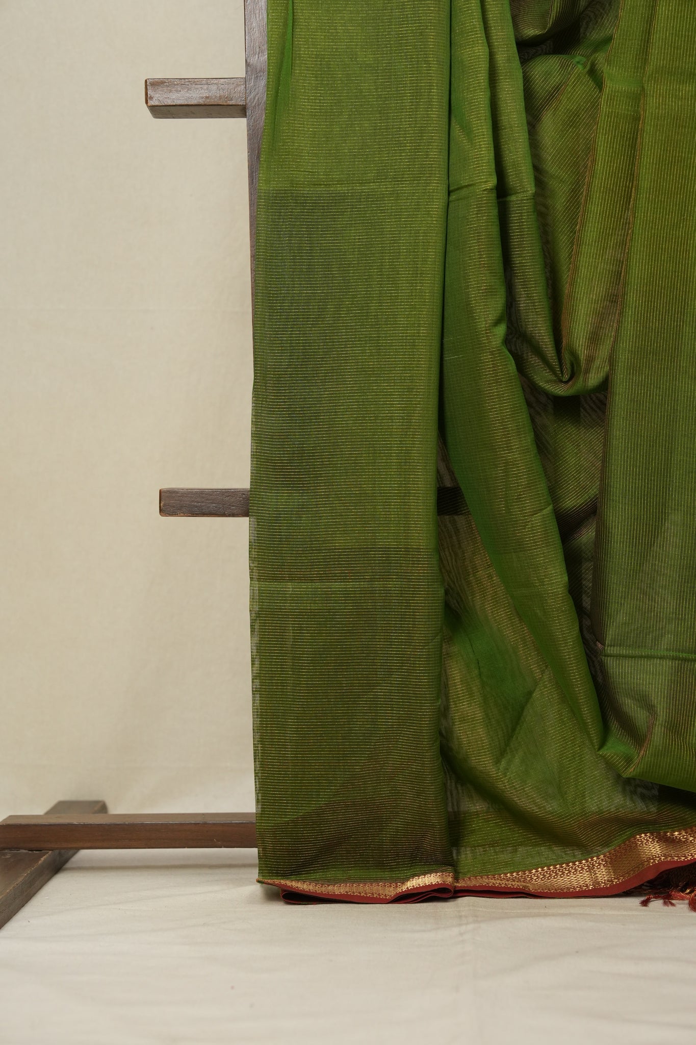 Work - Maheshwari tissue saree with green plain body, and elegant zari border.