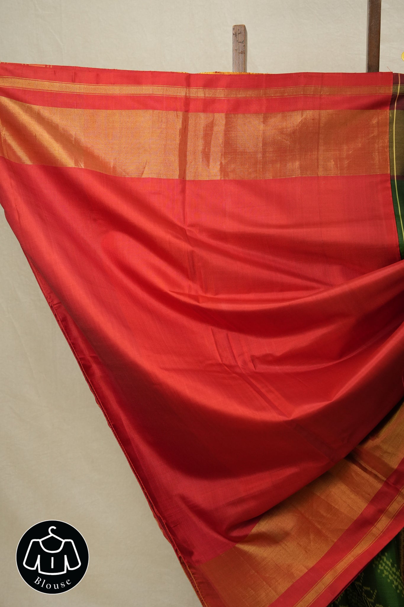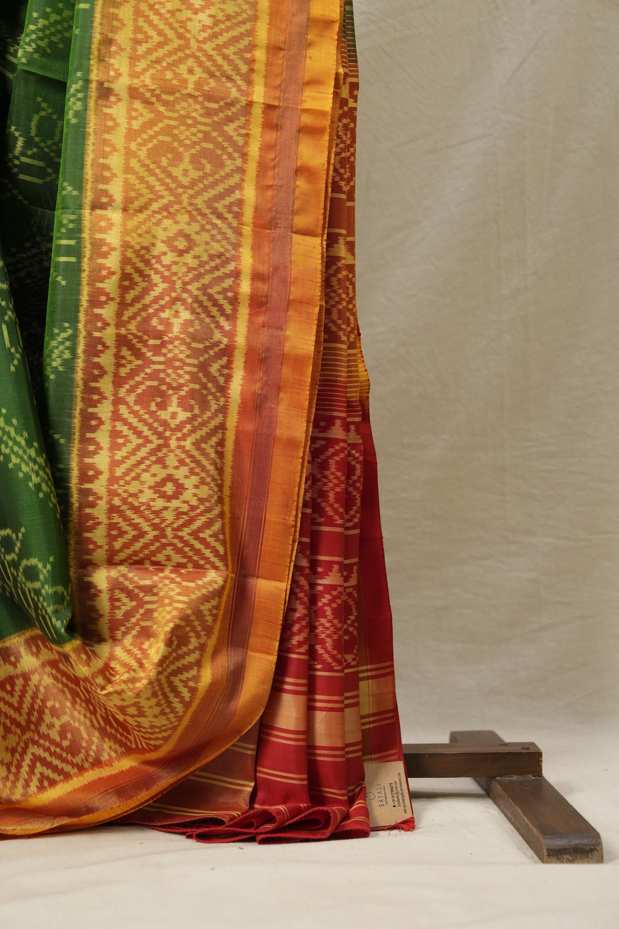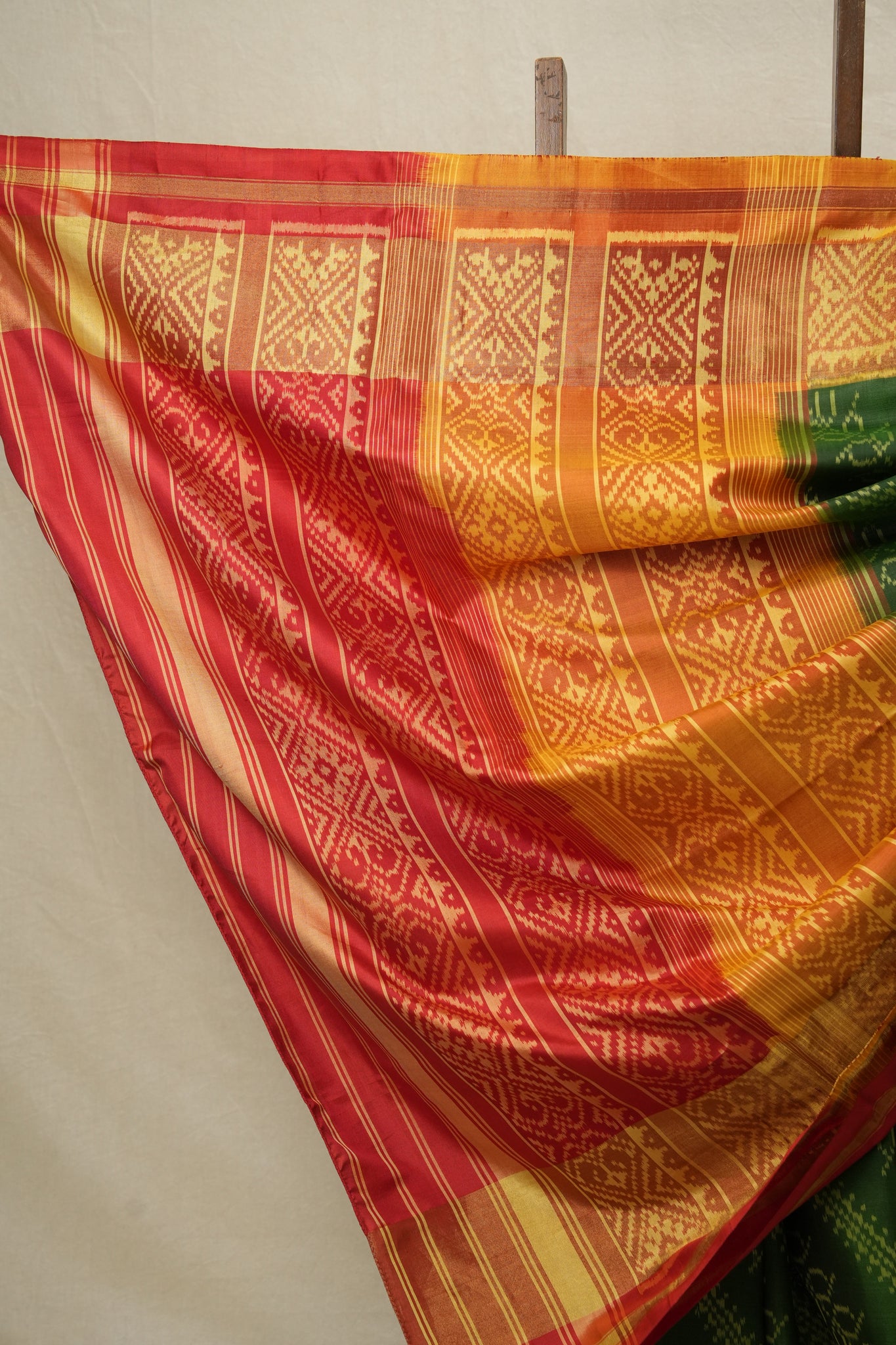 Work - This Rajkot Patola Silk Saree features intricate double ikat weaving with a rich interplay of green, red, and orange hues, showcasing traditional patterns.