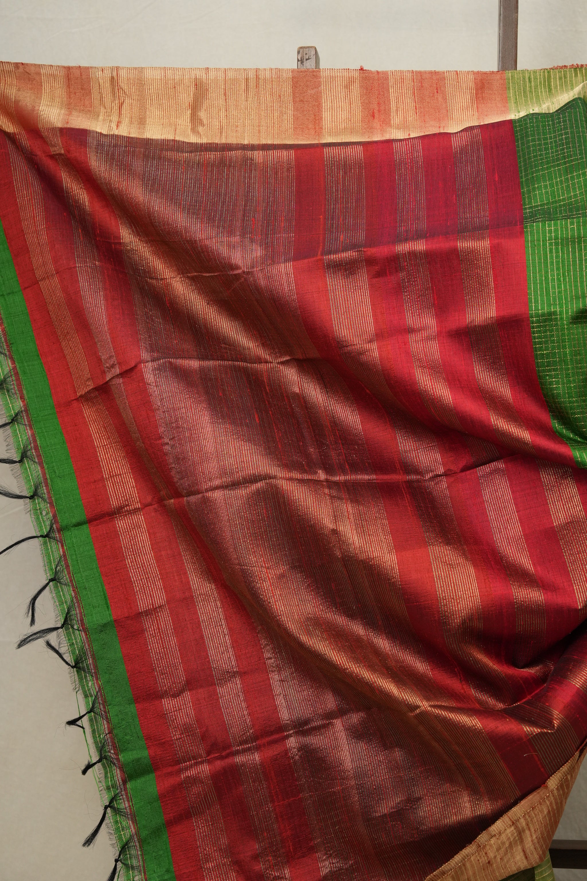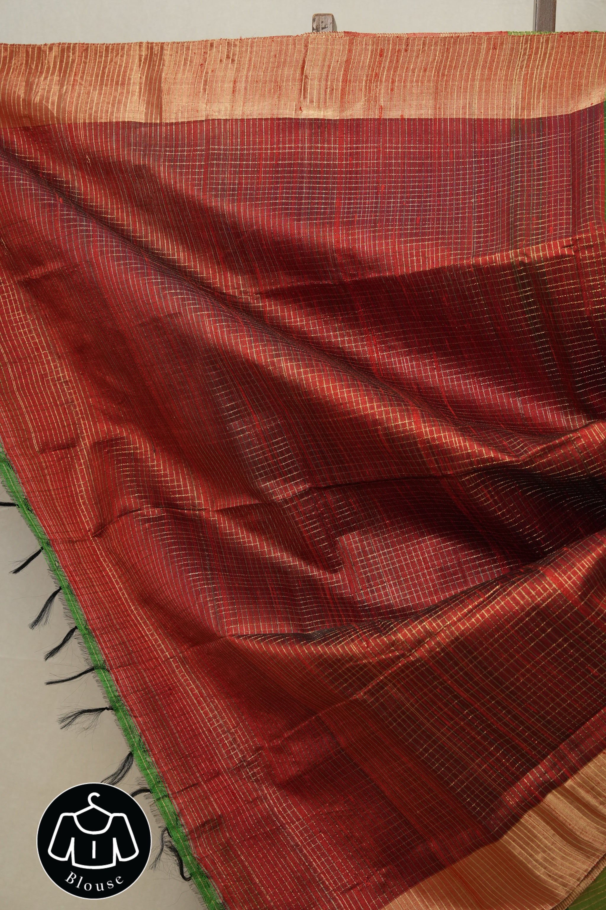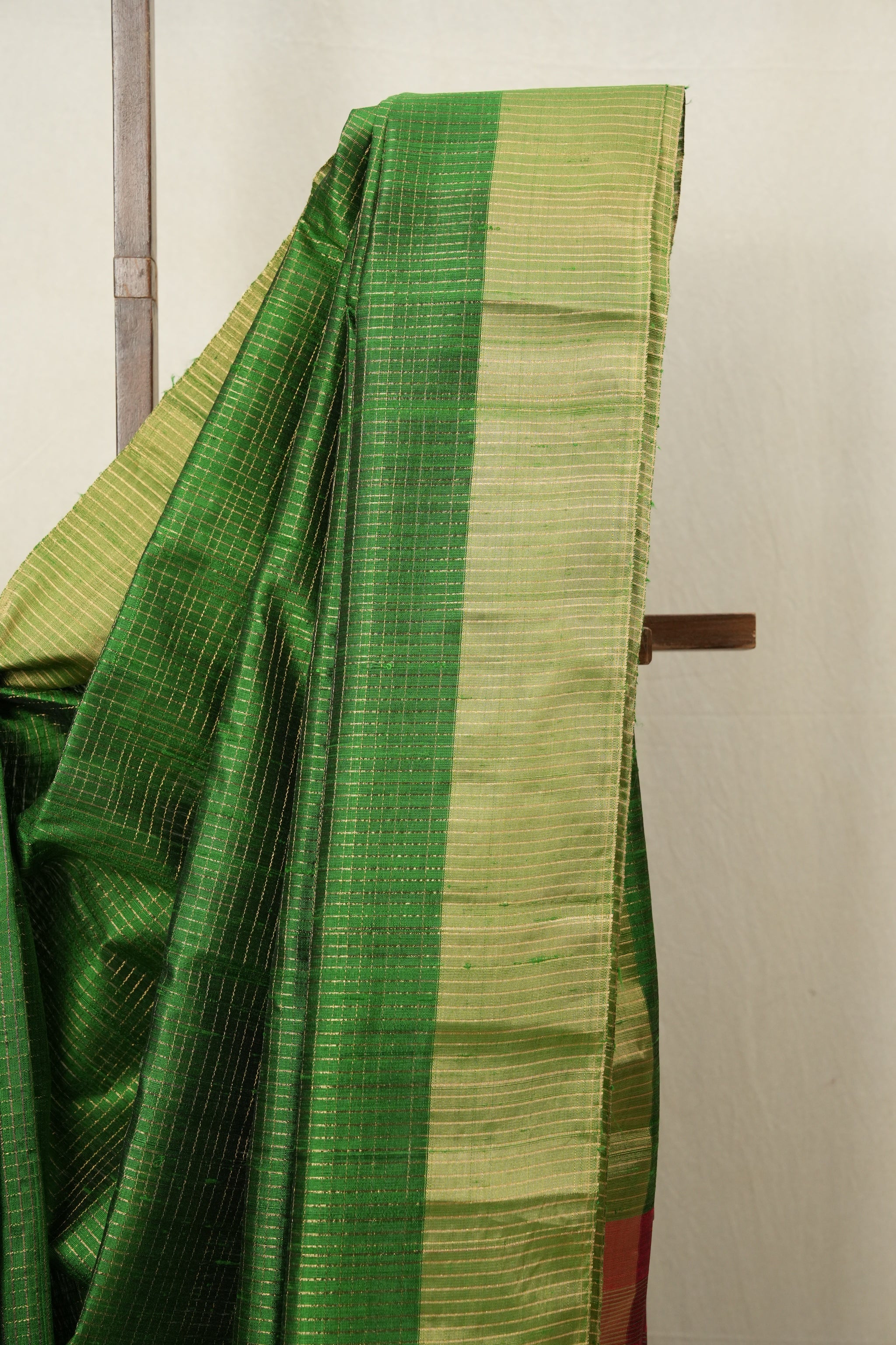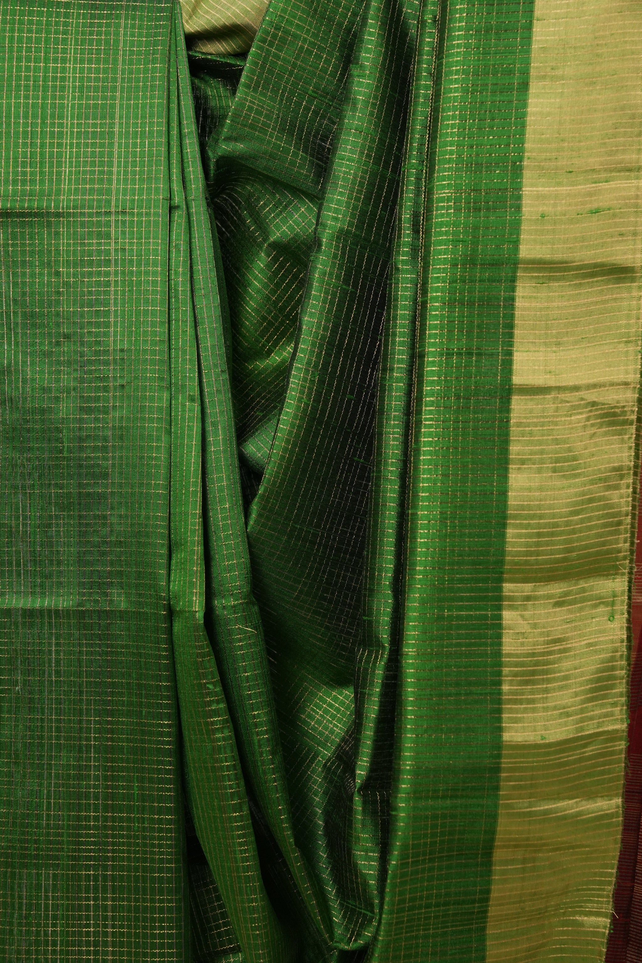 Work - Green raw silk saree with golden checks, contrasted by zari border and rich golden pallu.