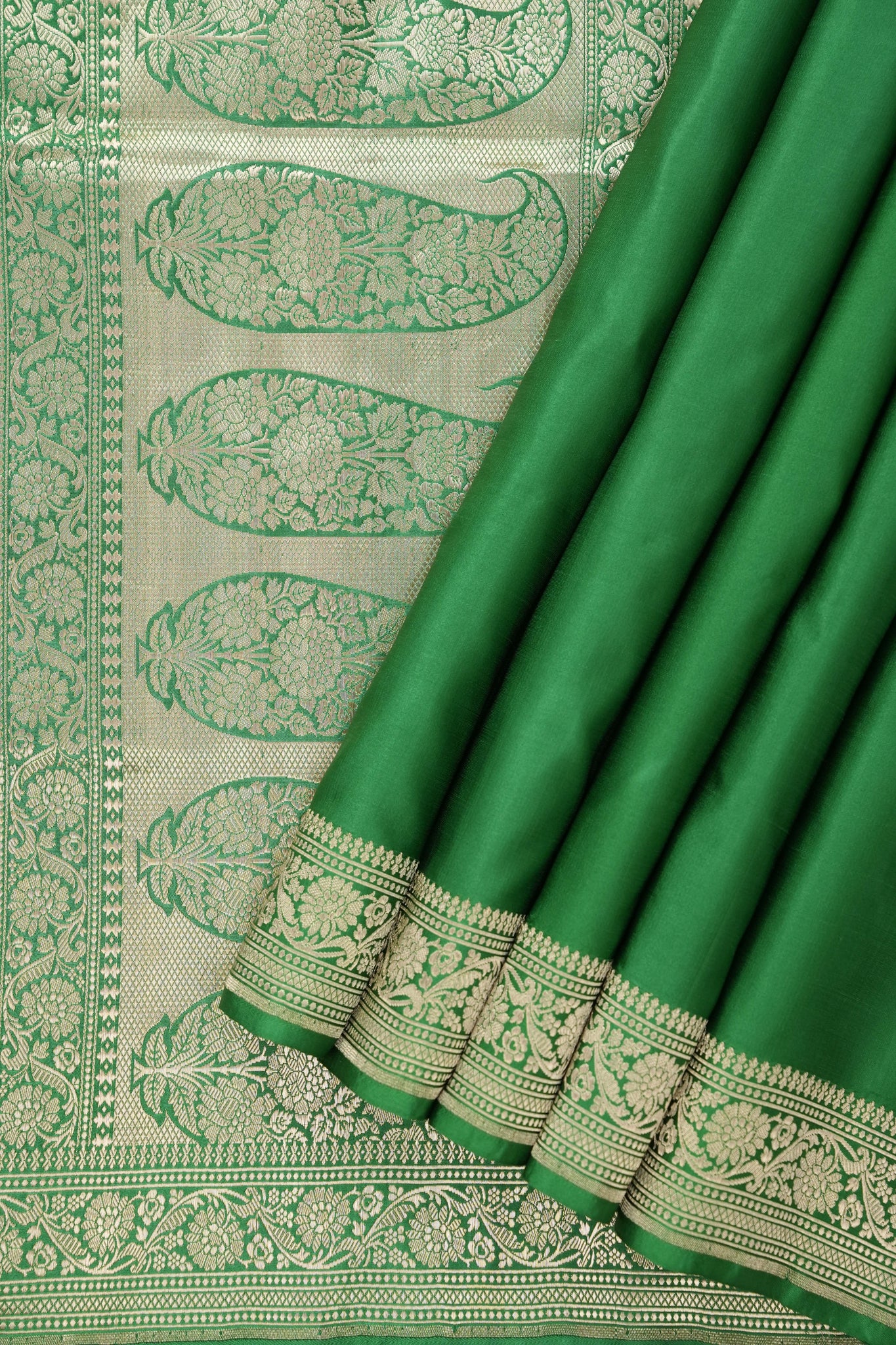 Work - This is a banarasi silk saree in a green base, featuring plain design across the body and a rich gold zari floral border and pallu with intricate traditional designs.