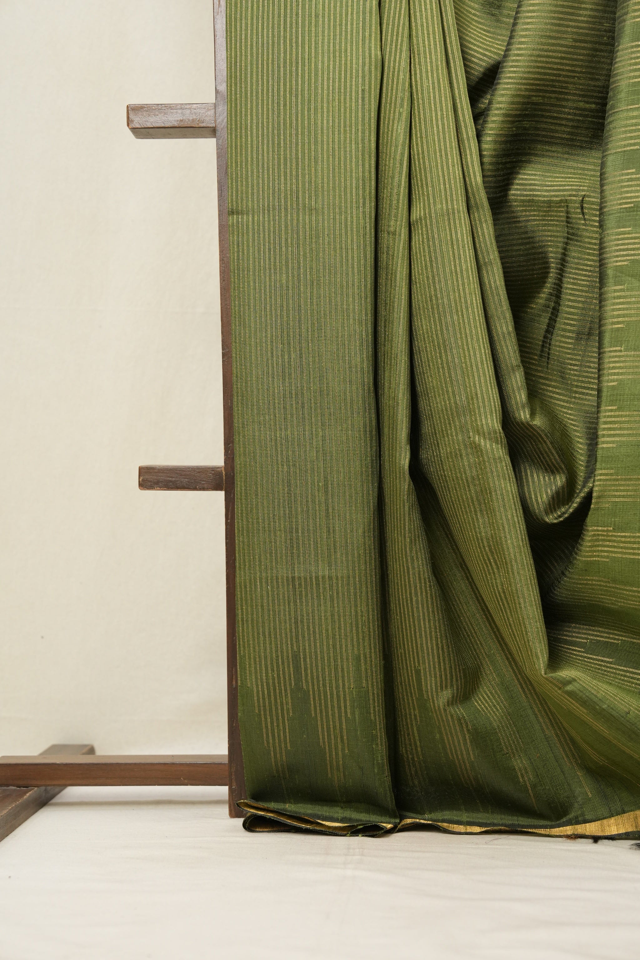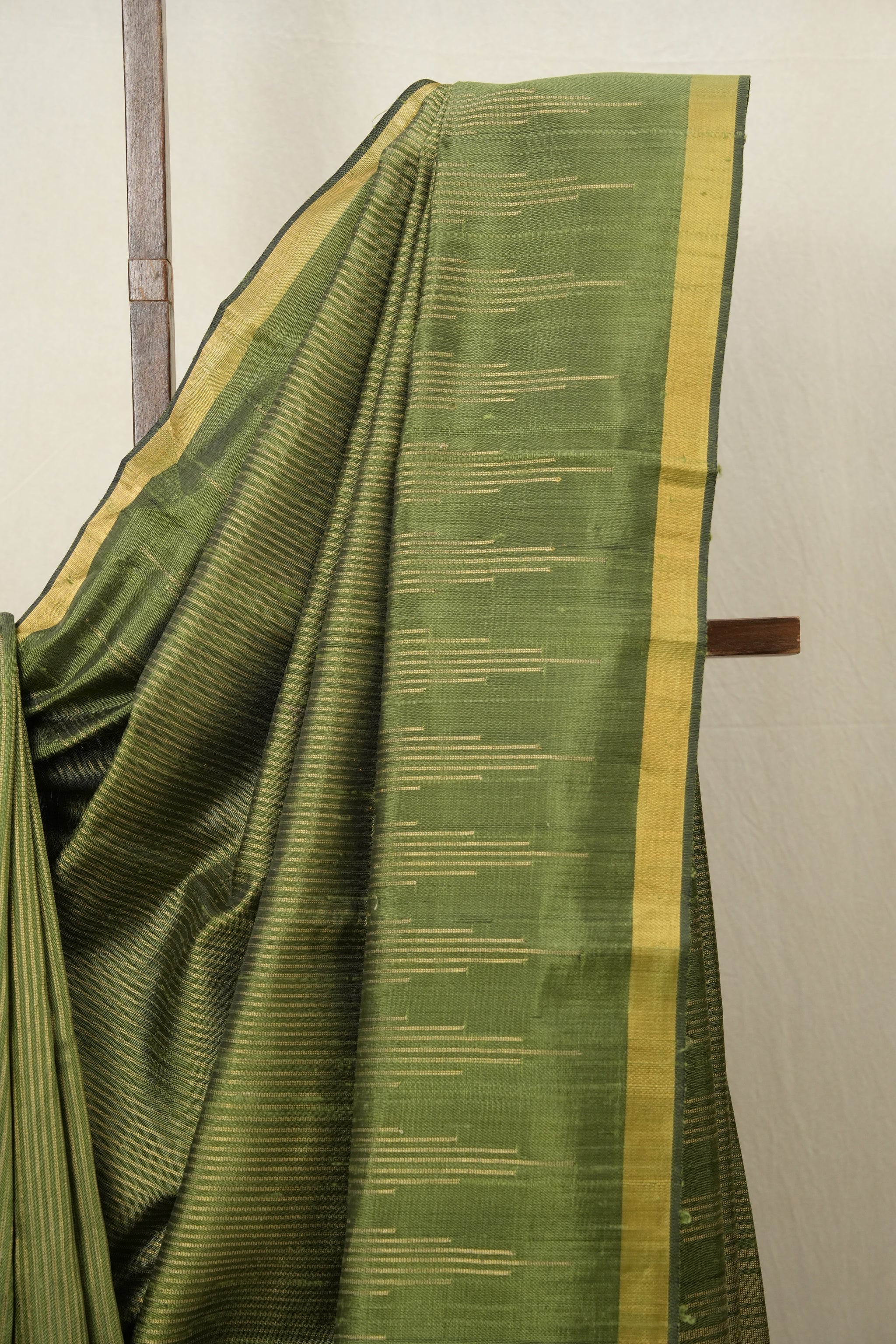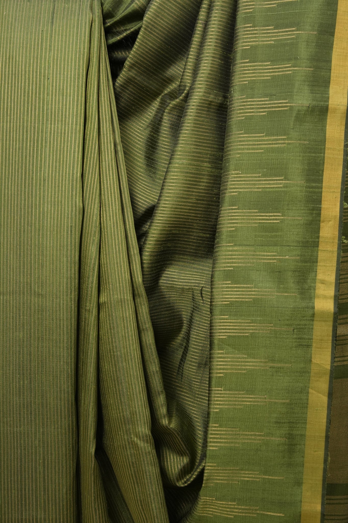 Work - This raw silk saree features a green base with fine woven stripes and a solid gold border, showcasing a rich and elegant look.